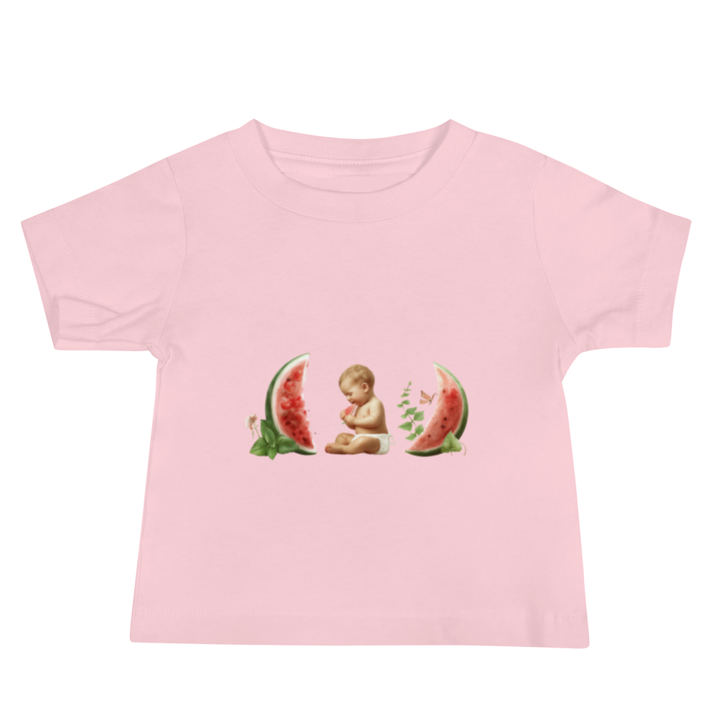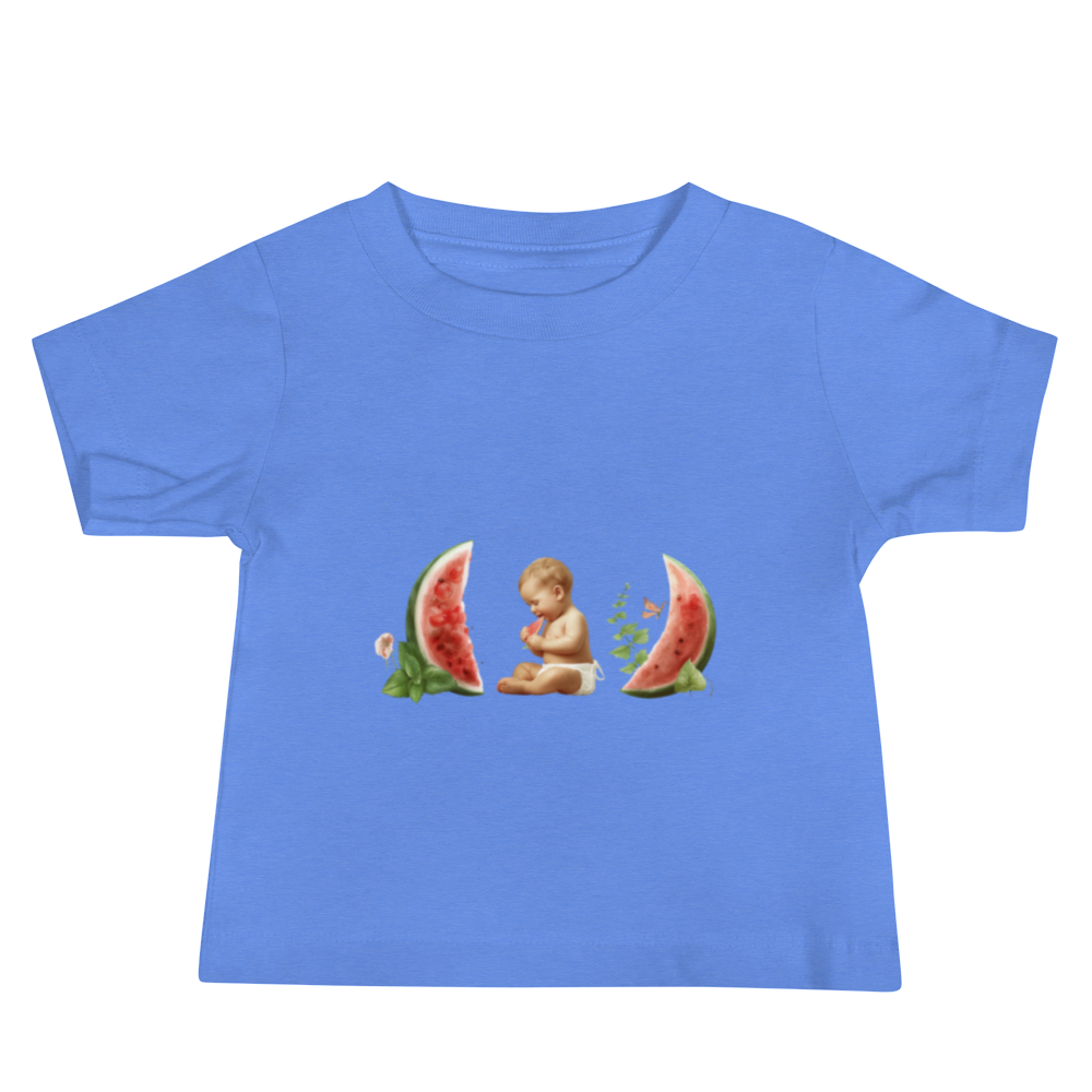 Dress your baby in style from the start with this short sleeve cotton jersey tee. It’s comfortable, durable, and easy to care for, making it a timeless favorite in any baby’s wardrobe. The design features a charming baby eating between two slices of watermelon, adding a playful and adorable touch.