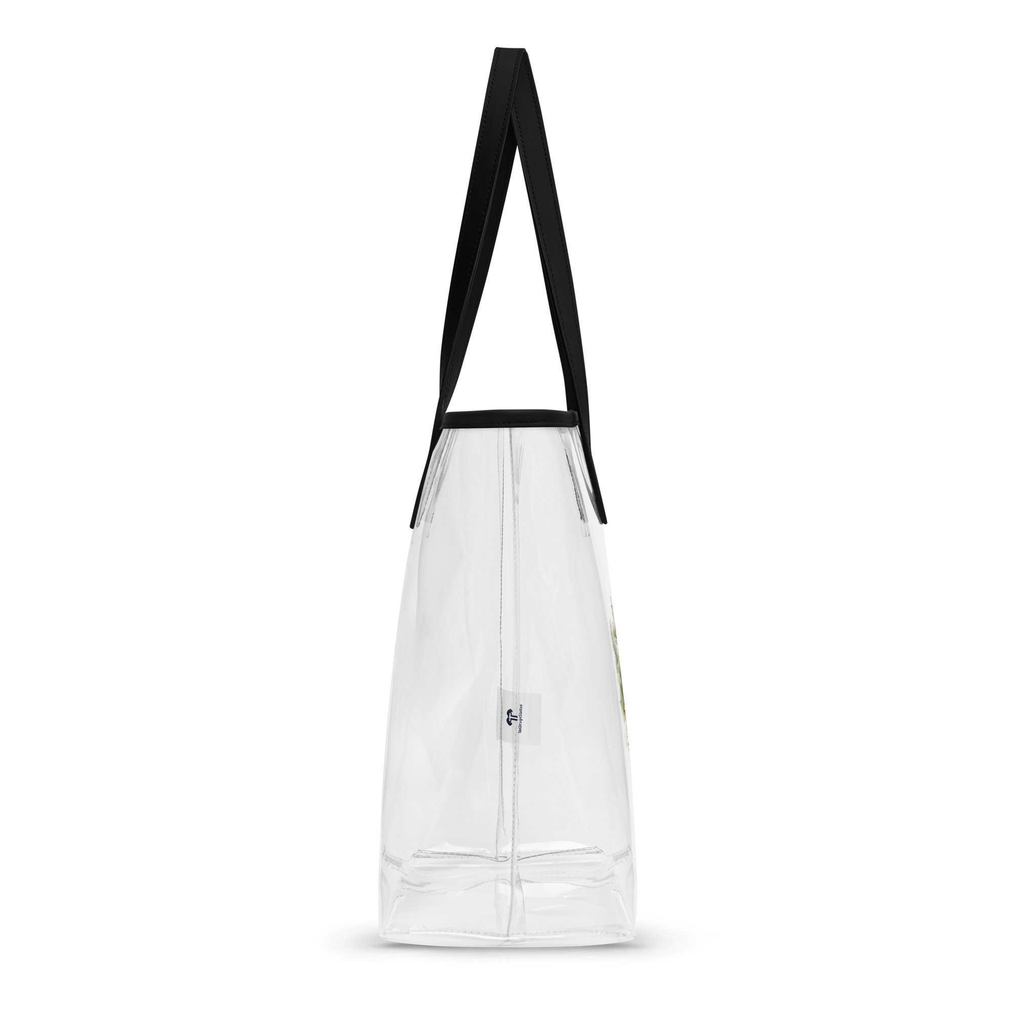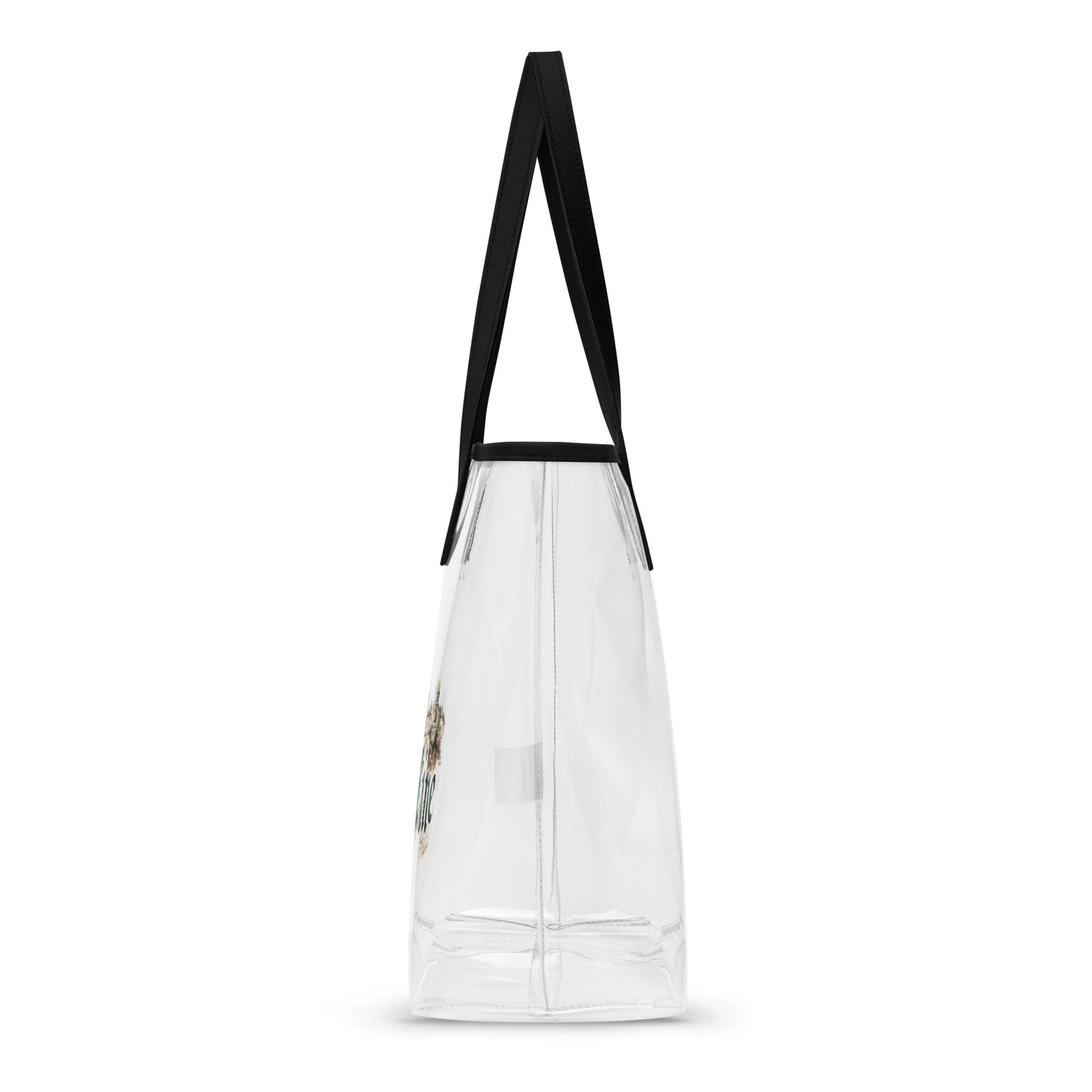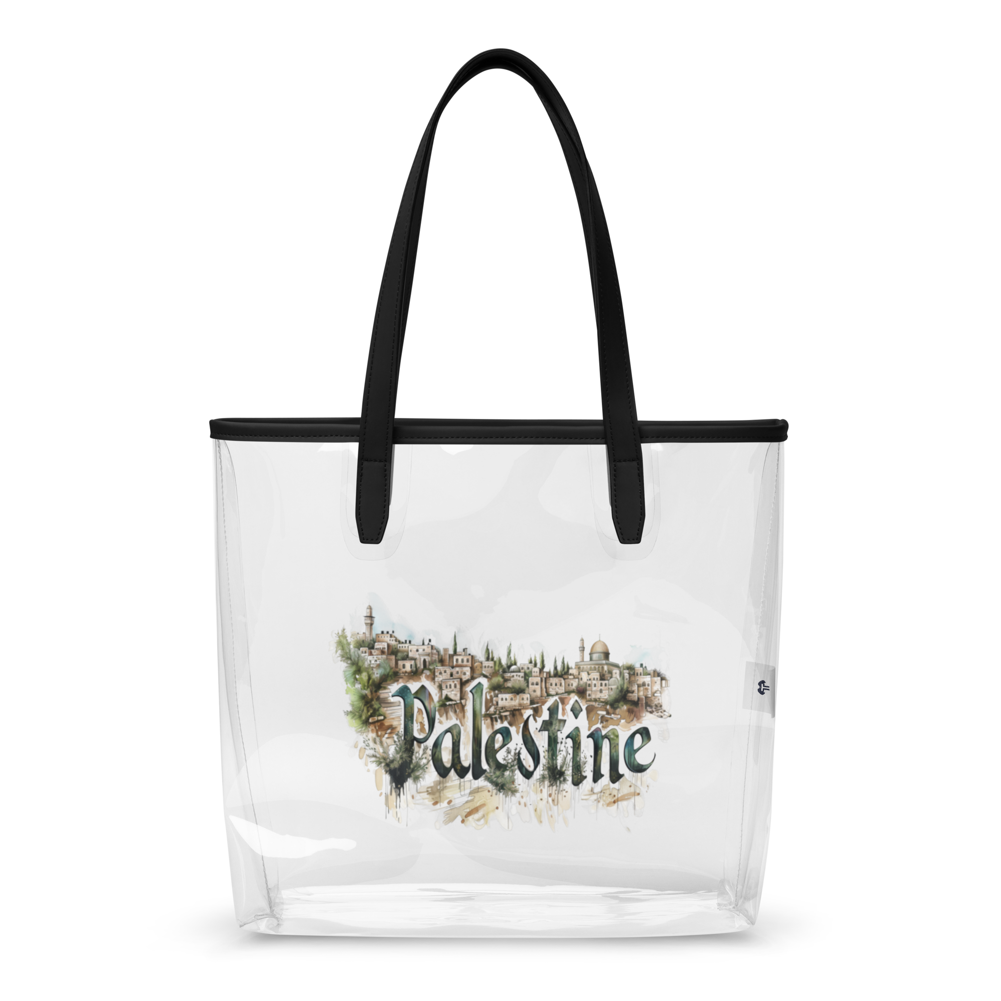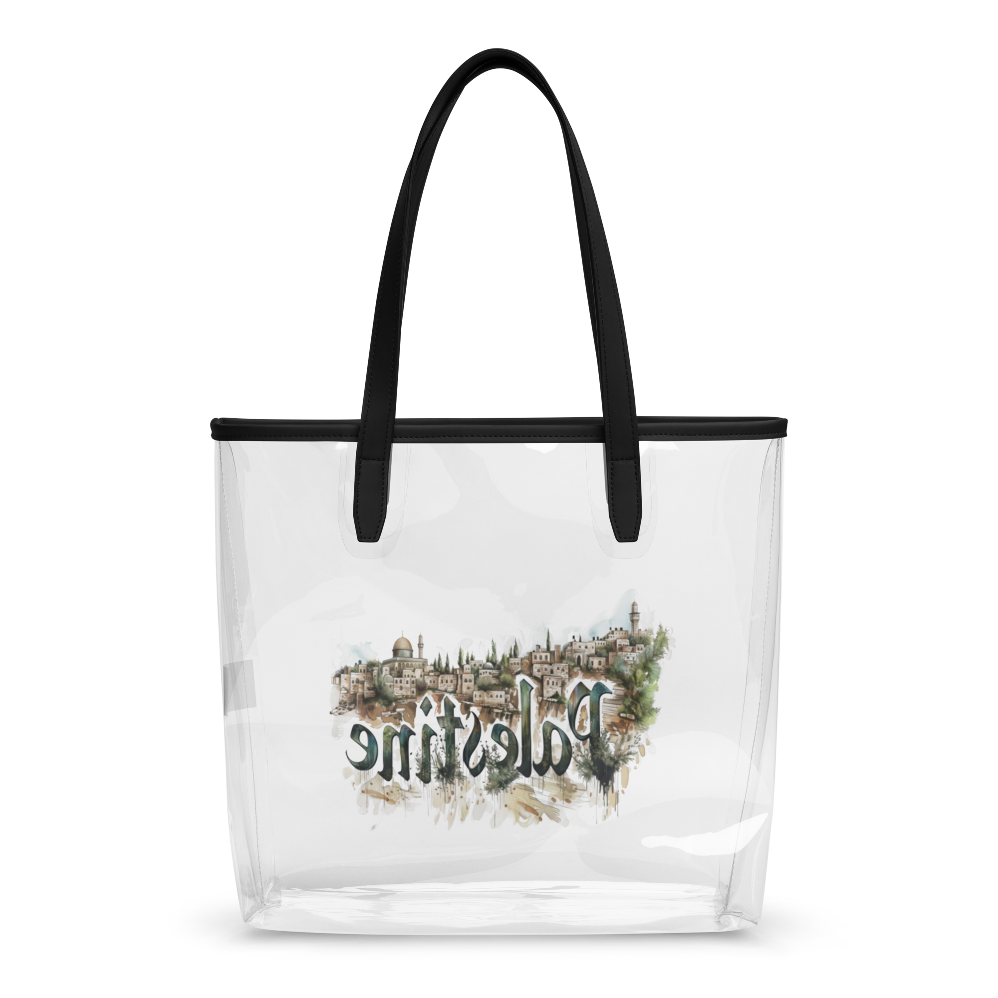 This clear tote bag offers a stylish and practical solution for daily carrying needs—from concerts to beach outings. Its sleek, transparent design is both durable and eye-catching, featuring the word "Palestine" in graceful calligraphy. Each letter contains intricate landscapes of olive groves and stone houses rendered in warm earth tones against a crisp white background.
