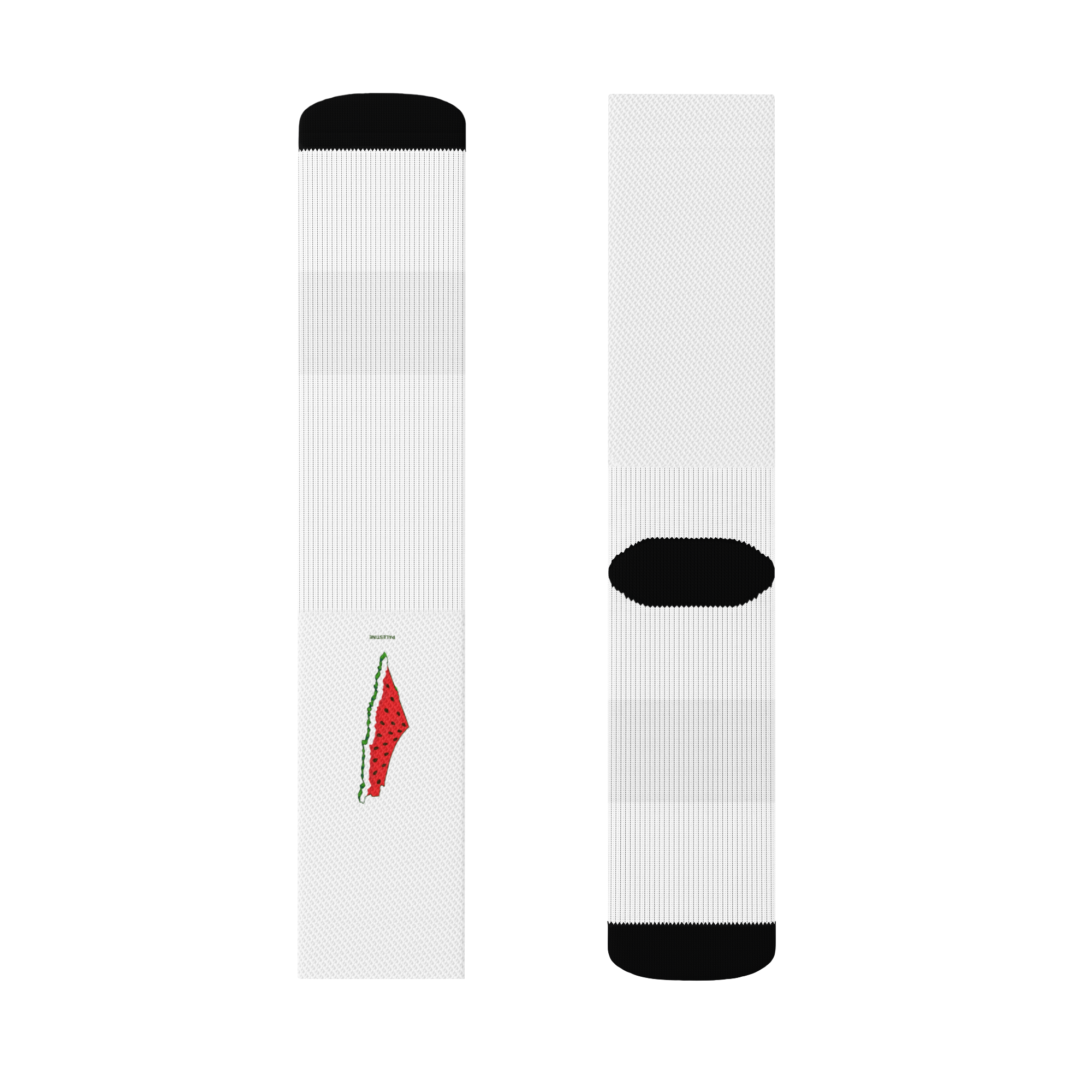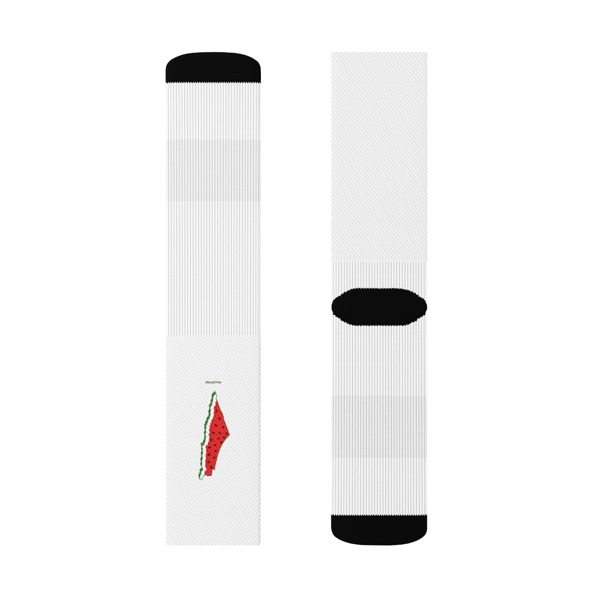 These crew socks are designed for comfort and flexibility, featuring a soft ribbed leg, a plush cushioned sole, and breathable stretch fabric for all-day use. Each sock has a unique design: the left showcases a textured watermelon-style map of Palestine, while the right displays the Palestinian flag shaped like a heart.