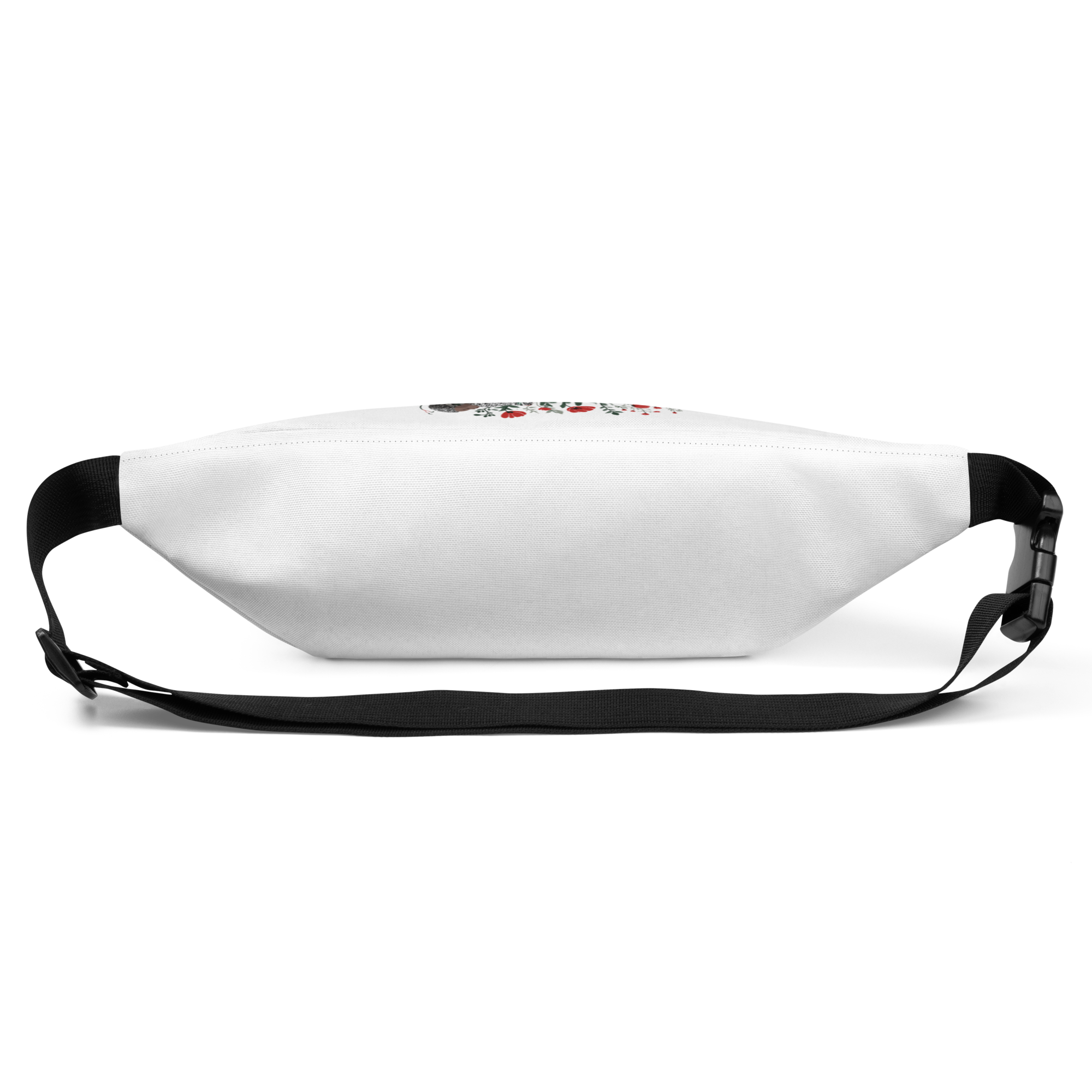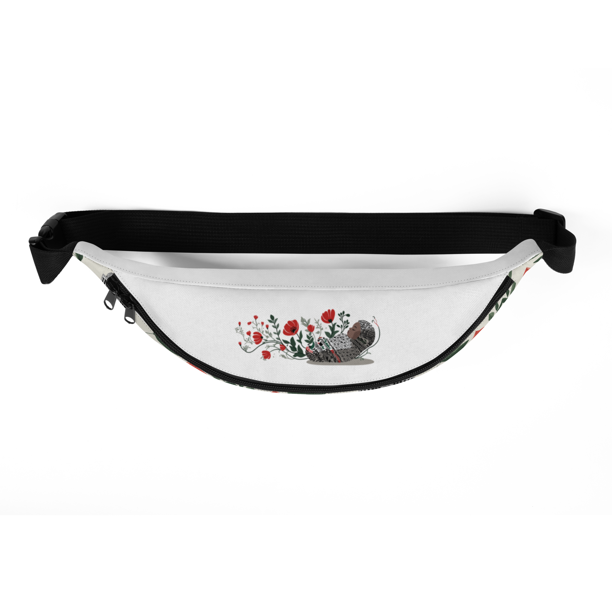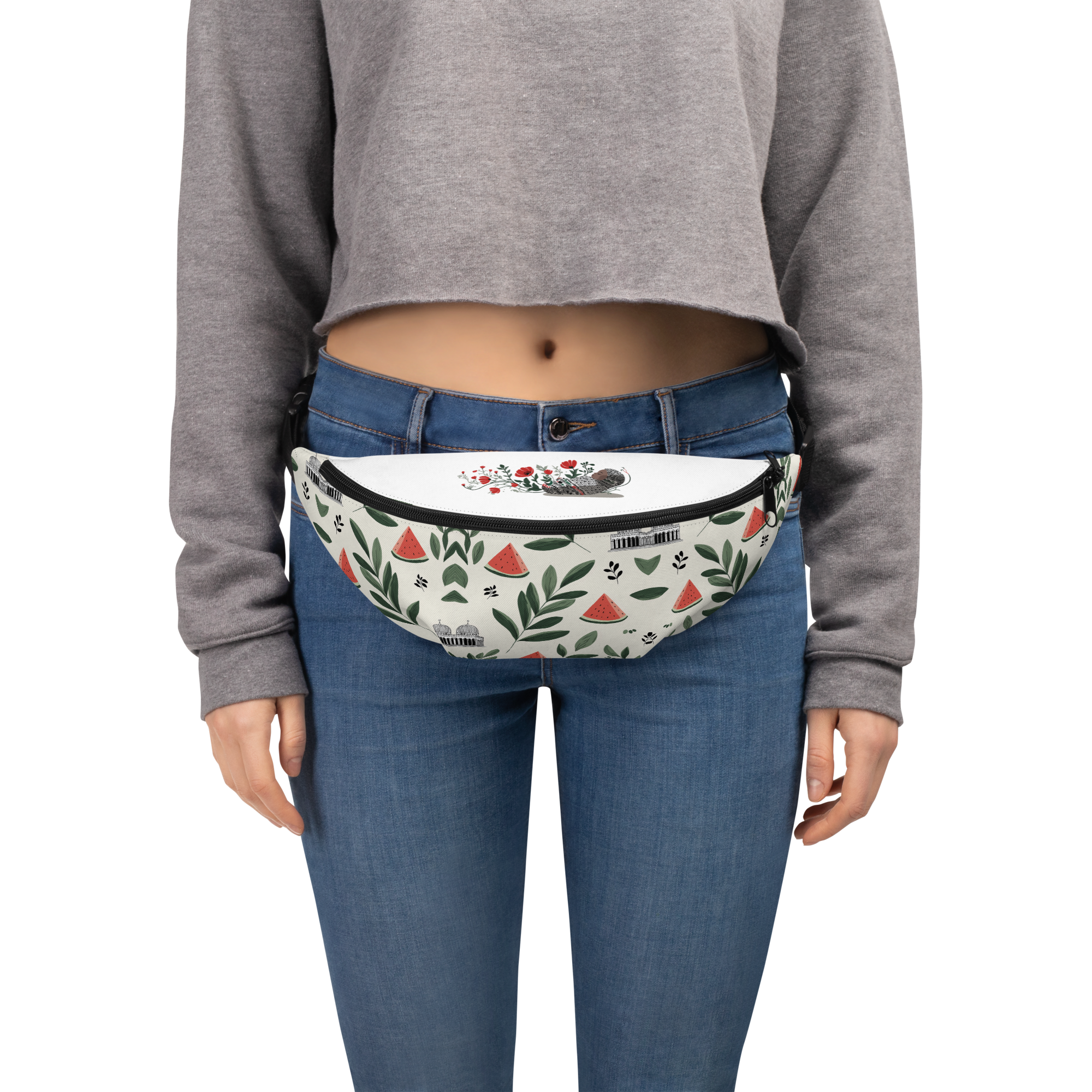 The fanny pack is an ideal accessory for those on the move. With its perfect size, a small inner pocket, and adjustable straps, it’s designed to become your go-to item for festivals, vacations, or anytime you need to keep your hands free. It features a sophisticated, modern pattern with flowing olive branches in vibrant green, accented by subtle symbols including a rich red watermelon slice, the black-outlined Dome of the Rock, and delicate tatreez motifs, all set against a clean white background for an elegant, spacious look.