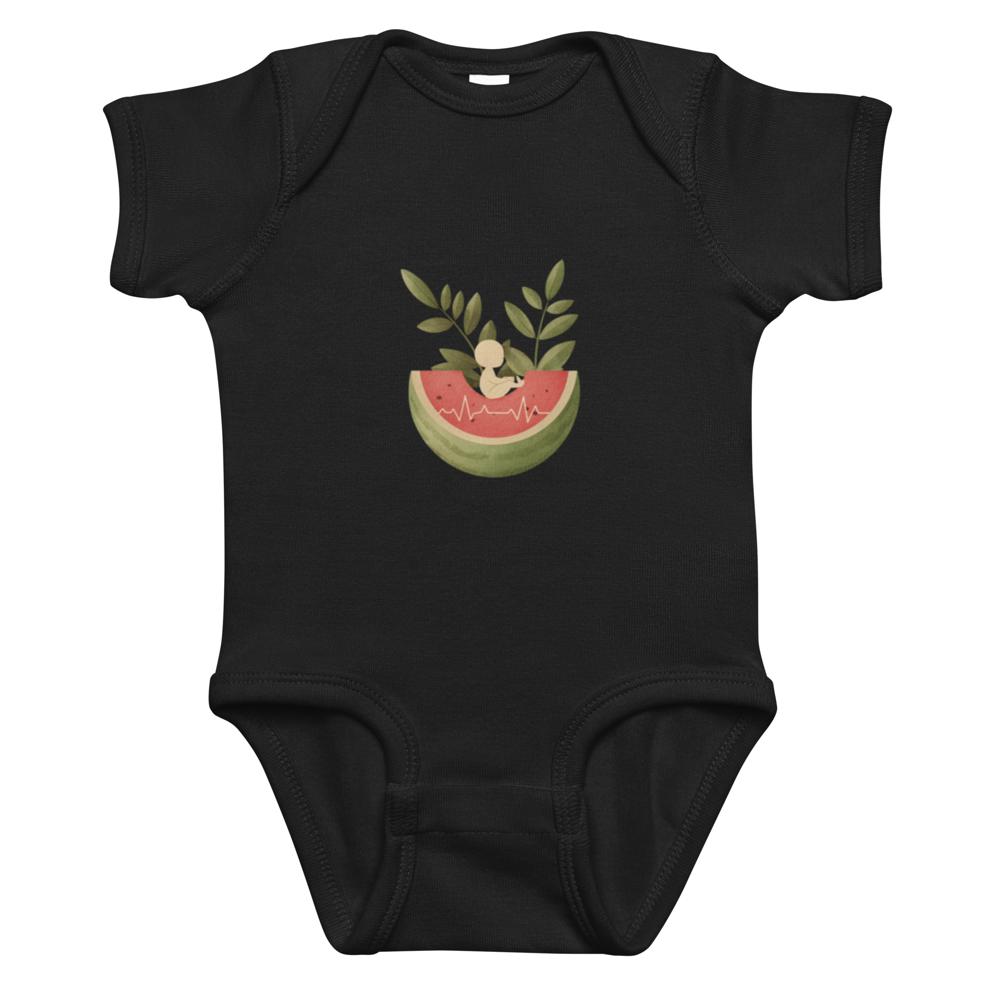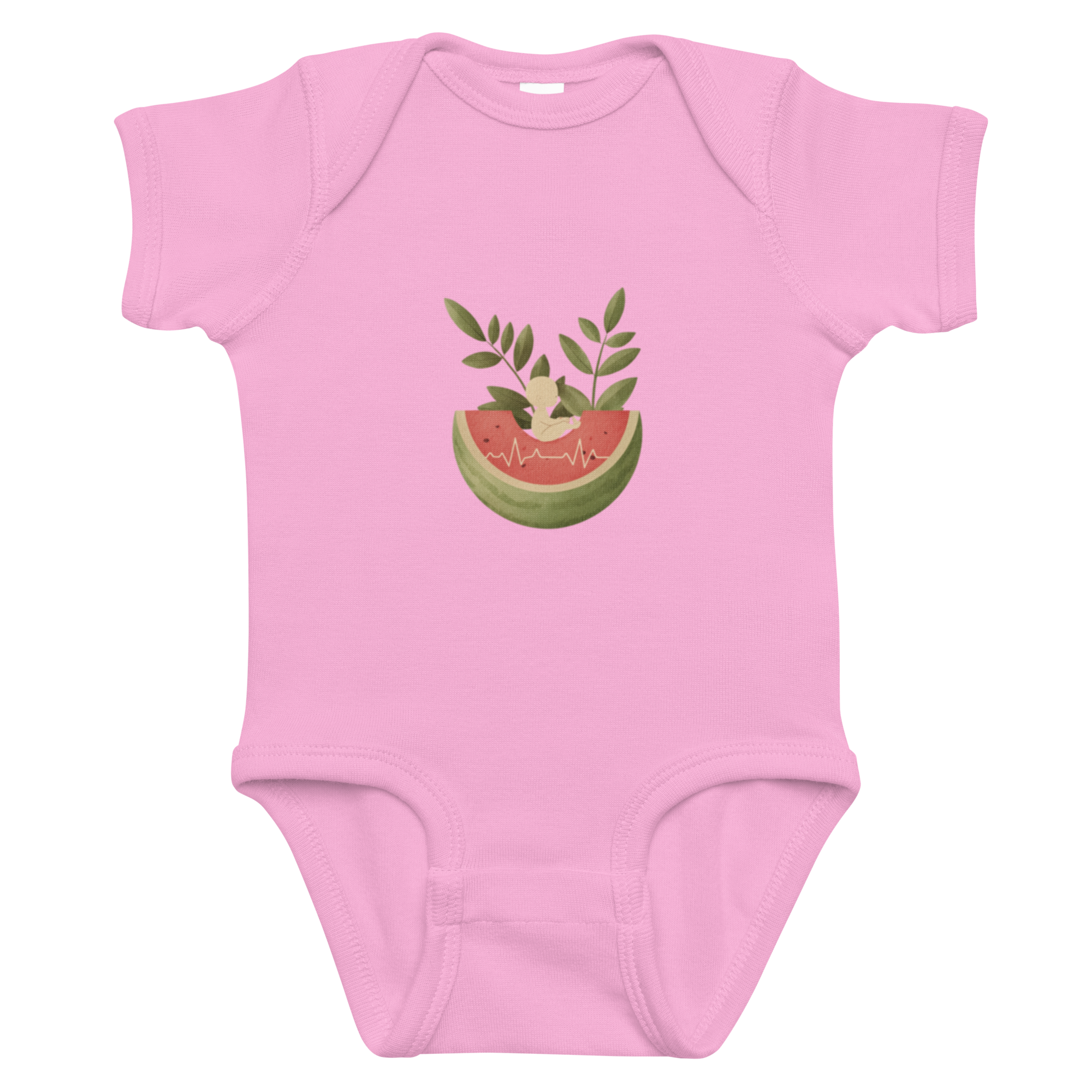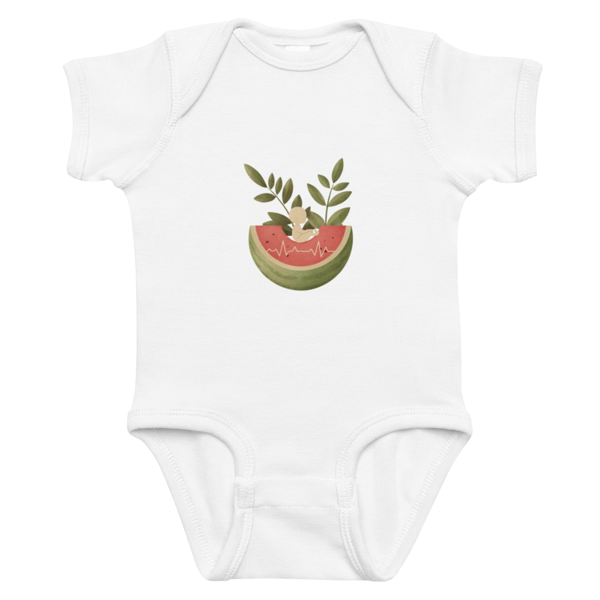 Crafted from ultra-soft cotton, this one-piece offers gentle comfort for your baby's delicate skin. Its lap shoulder design paired with a three-snap closure ensures effortless diaper changes, allowing you to focus more on caring for your infant. The bodysuit features a unique design showcasing a baby figure atop a watermelon slice, with two olive branches extending from the fruit, combining charm and symbolism.