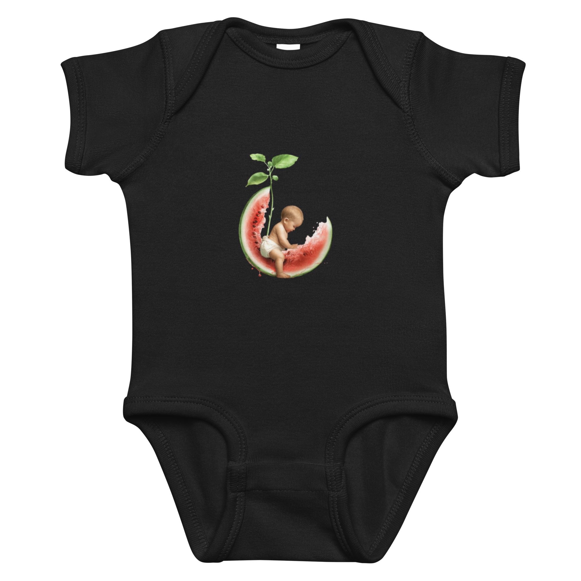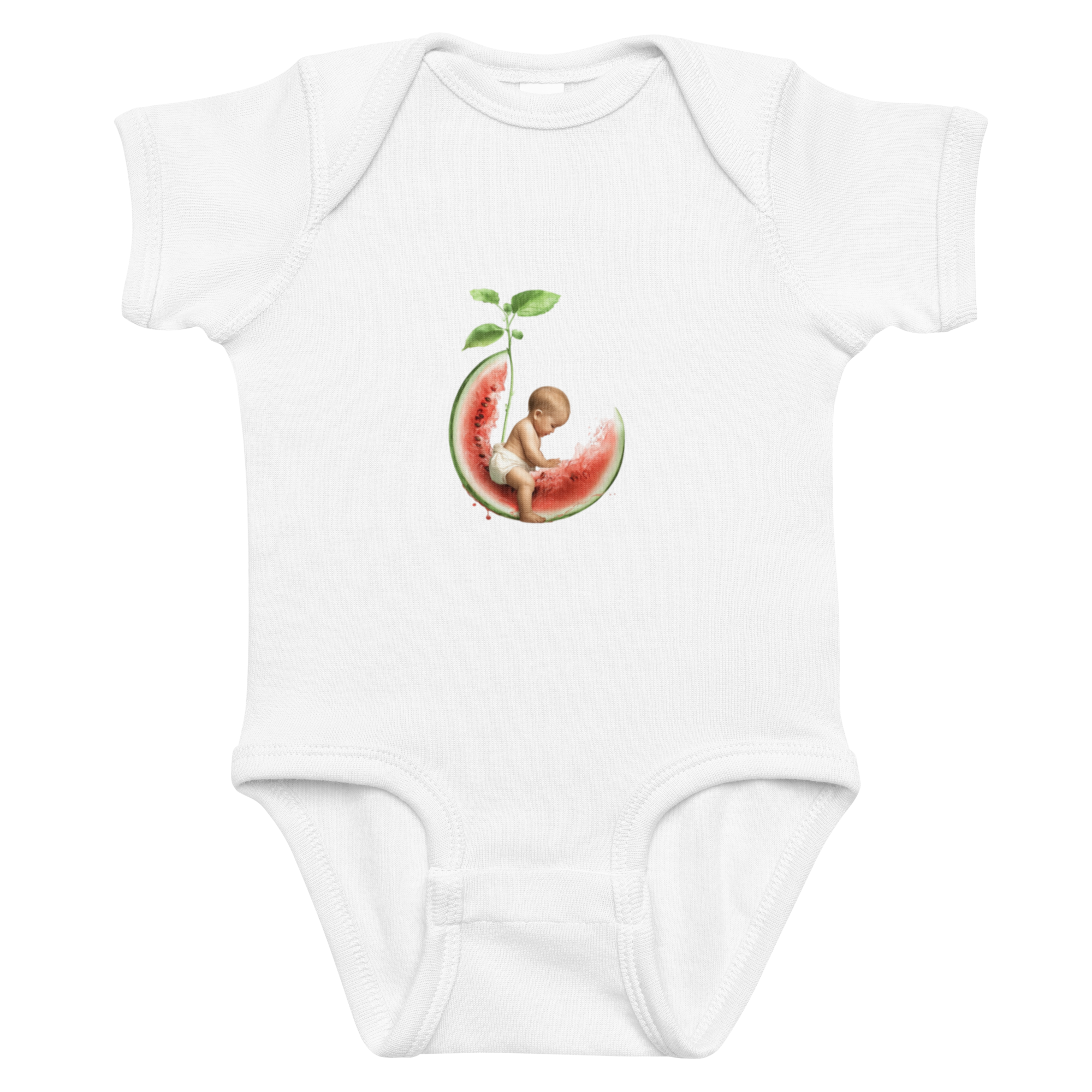 Crafted from ultra-soft cotton, this one-piece ensures comfort for your baby's delicate skin. Featuring a lap shoulder style and a three-snap closure, it allows for effortless diaper changes, letting you focus more on bonding with your child. The design showcases a watermelon slice with a baby balancing on it, from whom a branch emerges as if blossoming—symbolizing the baby as the seed.