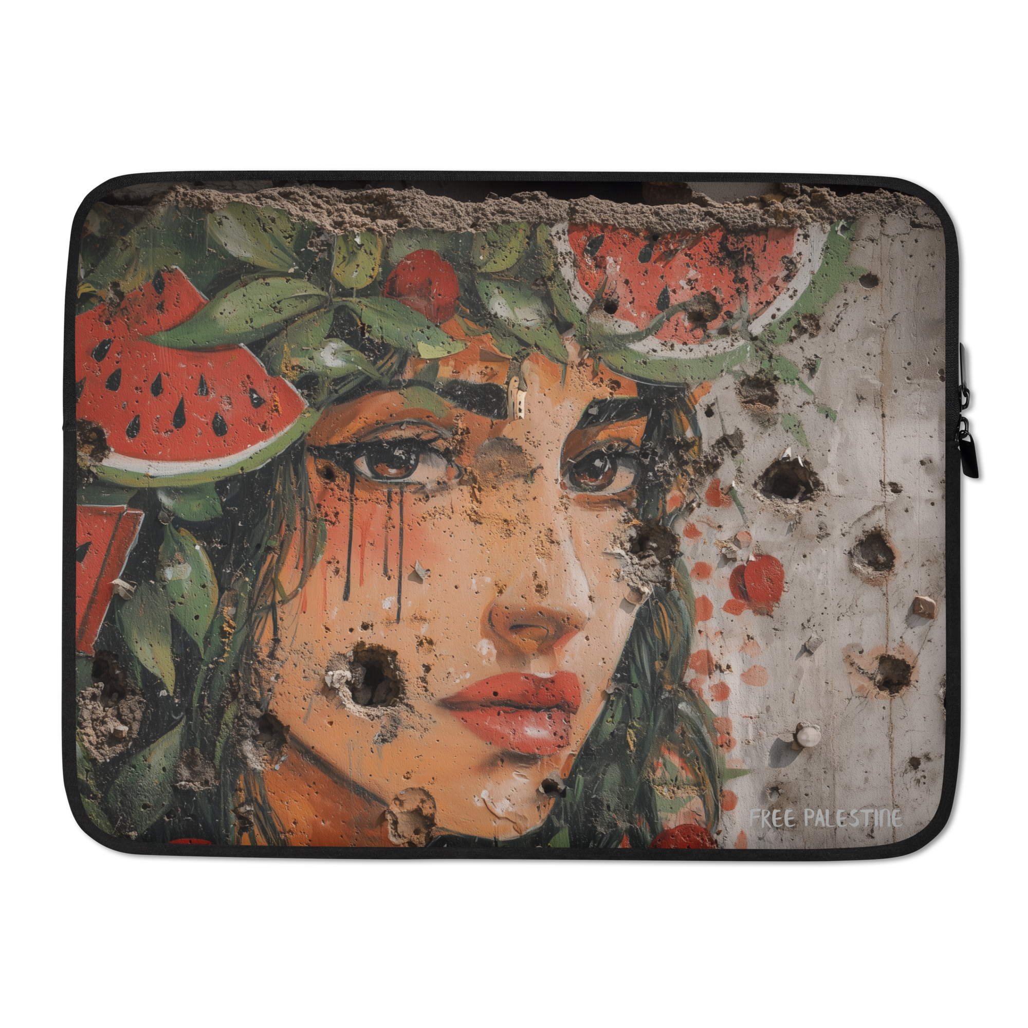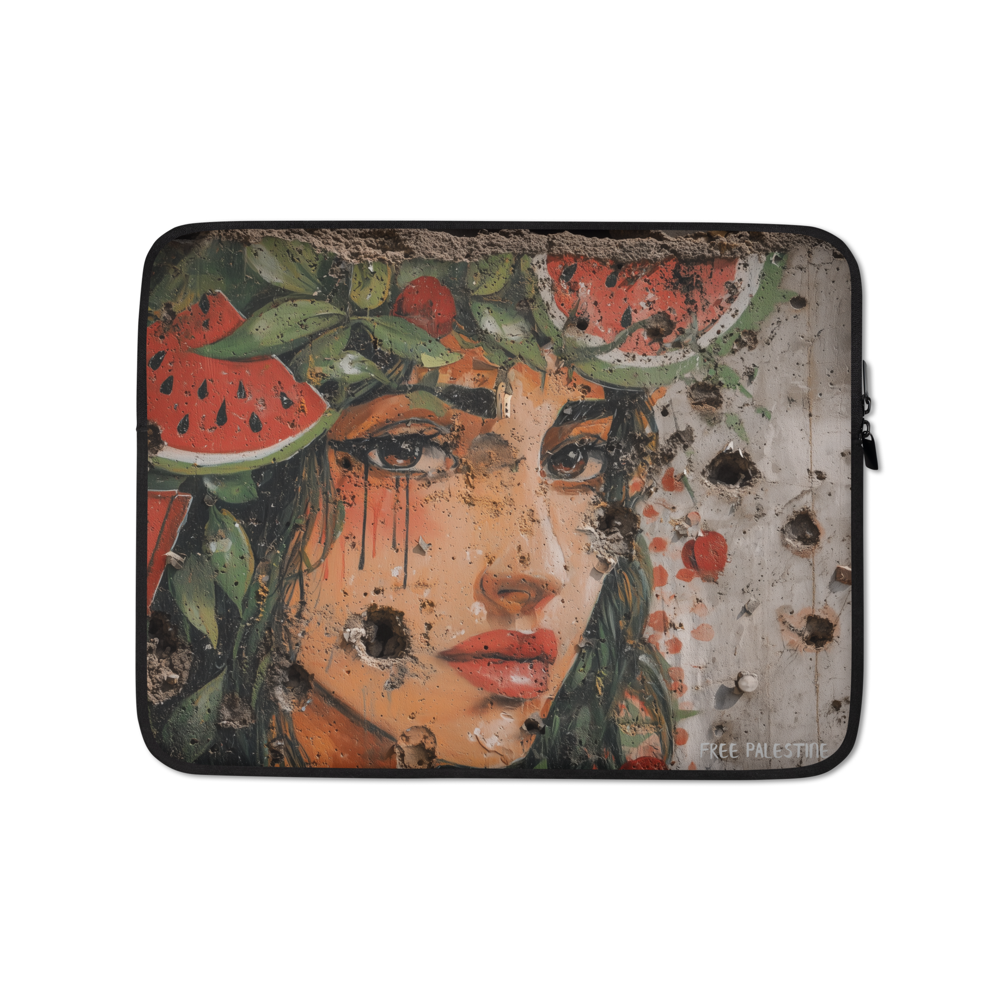 Keep your laptop safe and stylish with this lightweight, snug sleeve. It features an internal padded zipper and a soft faux fur lining to protect against scratches. The water, oil, and heat-resistant material ensures lasting quality and appearance. The design showcases a powerful street art mural of a Palestinian woman on a bullet-riddled Gaza wall, with flowing hair transforming into watermelon vines and tears nourishing olive saplings, combining vibrant emotion with activism.