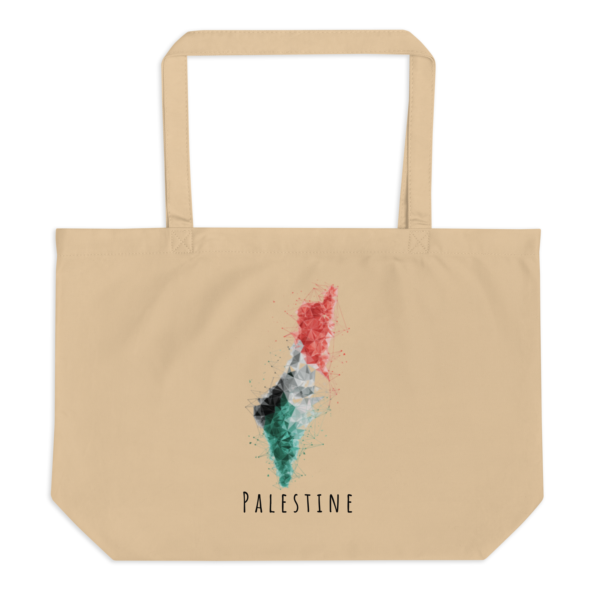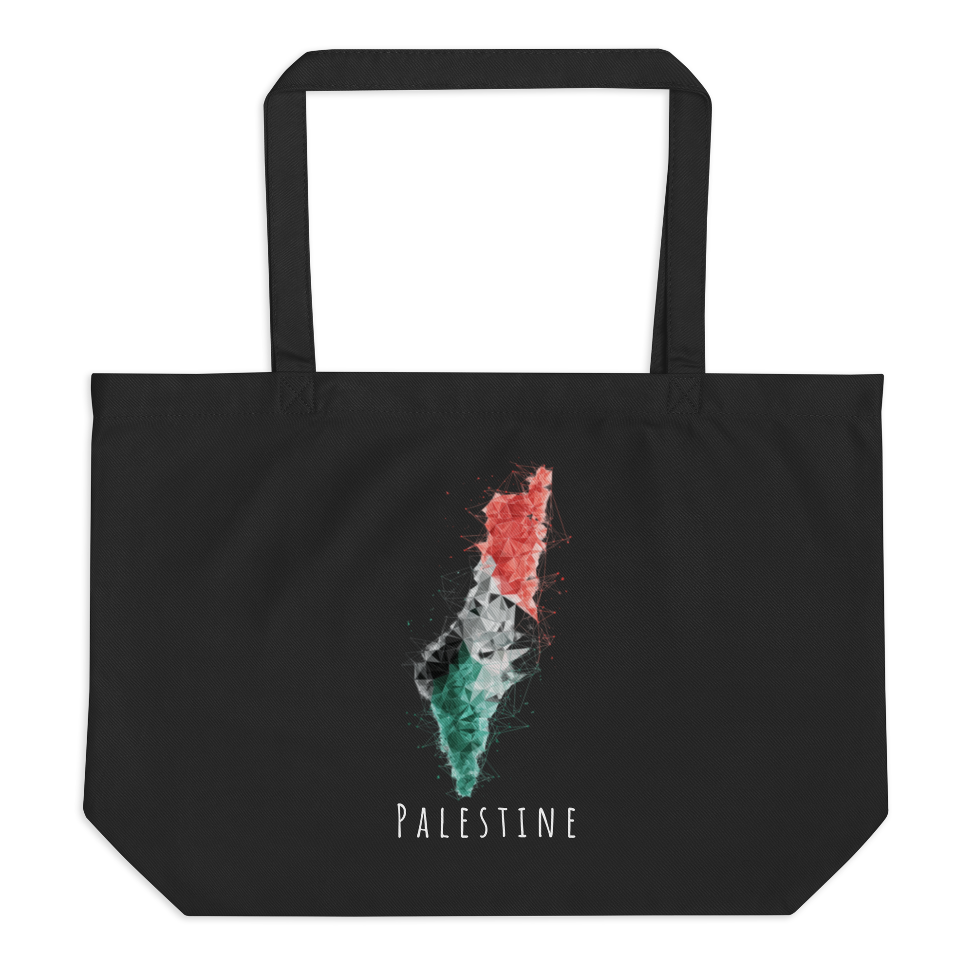 Ditch the plastic and carry your items in this roomy organic cotton tote bag. Perfect for groceries, books, and travel essentials, it offers plenty of space for all your needs. The bag features a striking geometric hexagonal design of the Palestine map in the colors of the Palestinian flag, with a vibrant low-poly constellation style that is modern and visually impactful. Its clean white background and bold color gradients make it both distinctive and practical for everyday use.