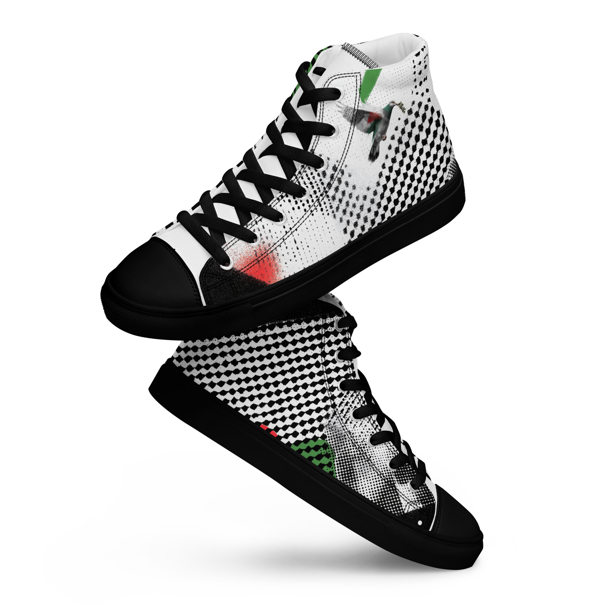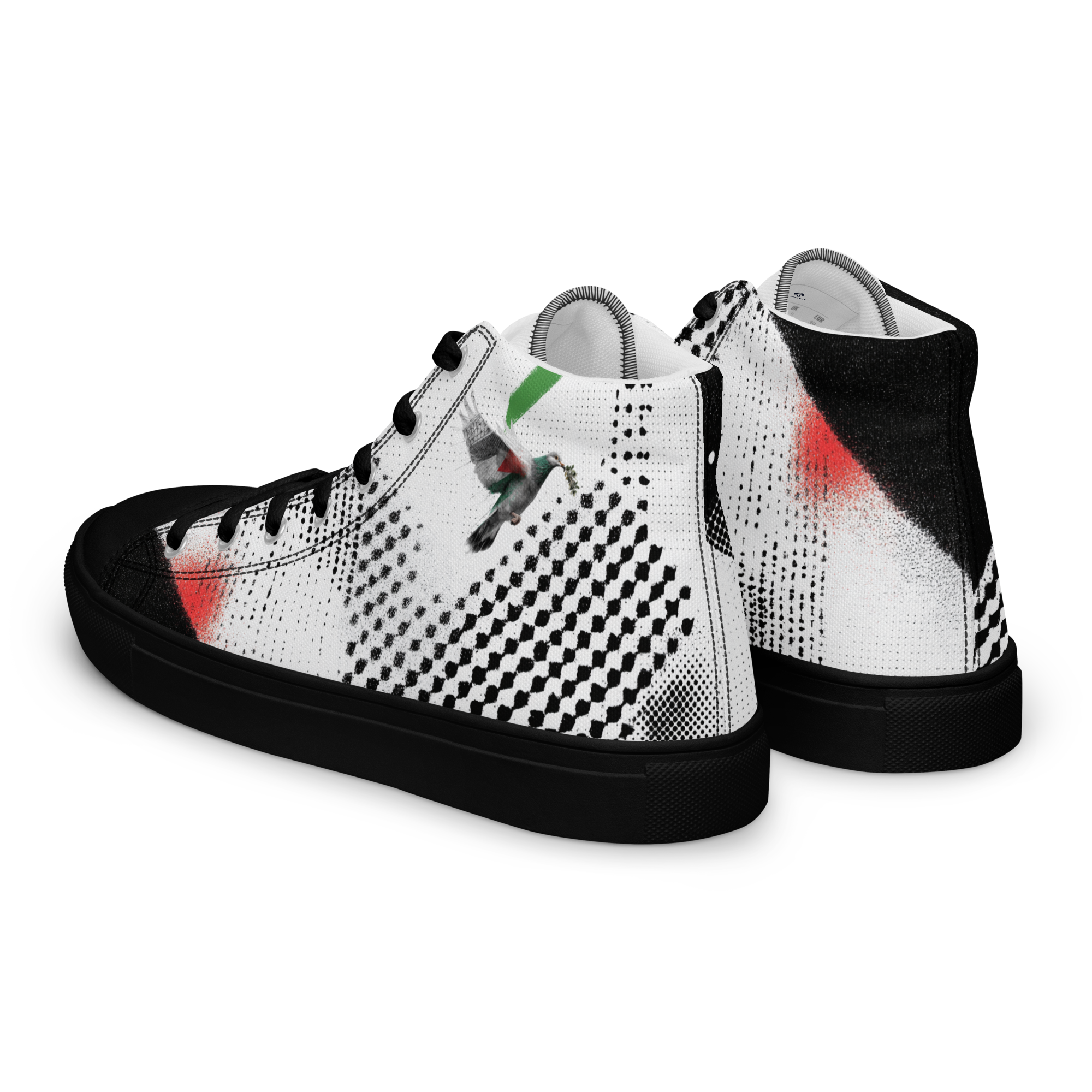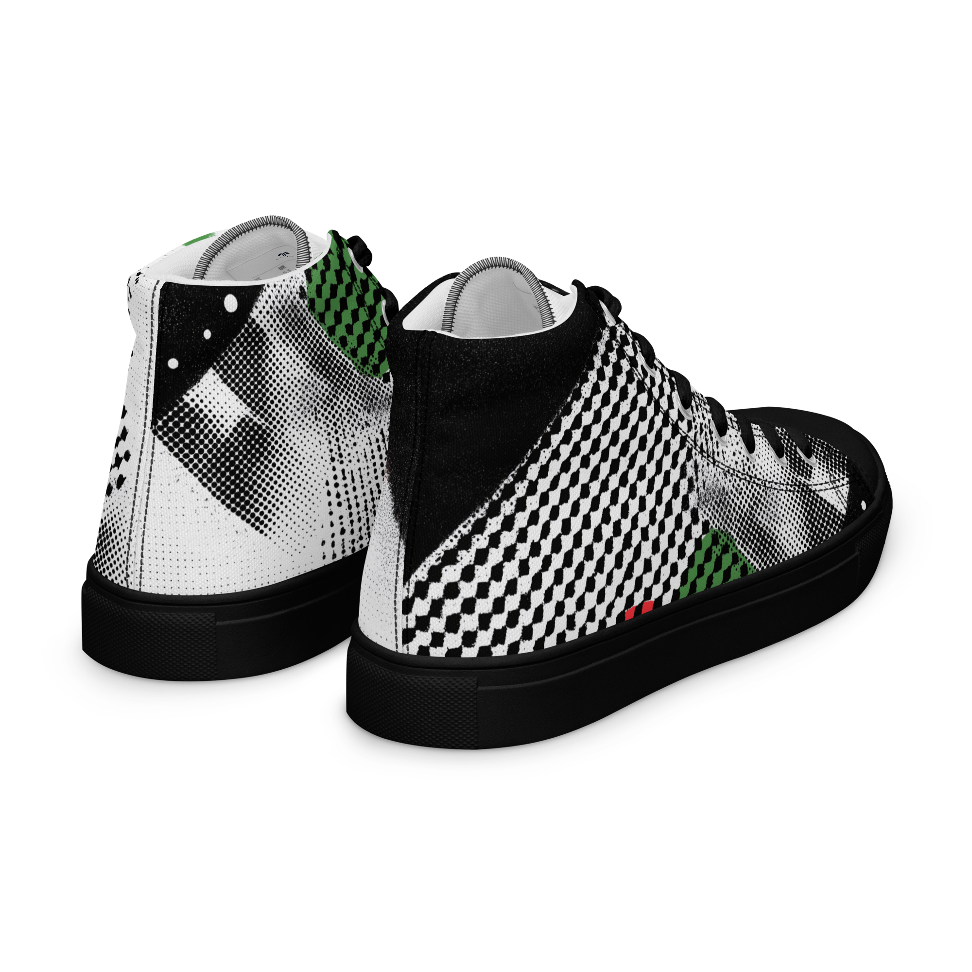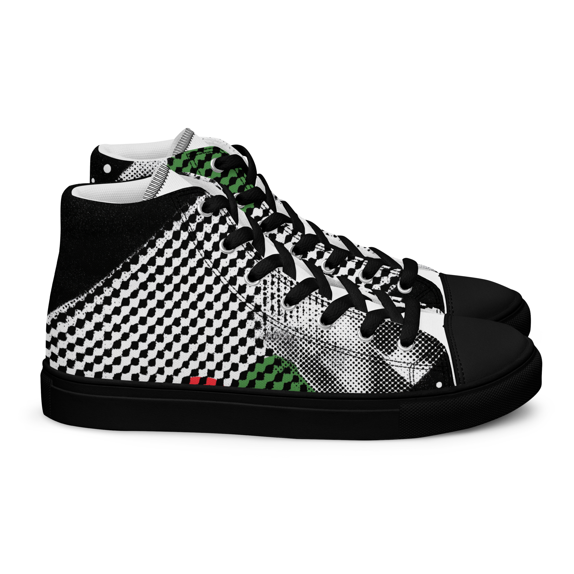 Elevate your footwear collection with these handmade high-top canvas shoes. Featuring a bold Palestinian keffiyeh pattern accented by geometric green and red details, the design centers on the classic black and white fishnet motif enhanced with traditional tatreez embroidery. The minimalist color scheme of black, white, green, and red creates a sharp, high-contrast look in a vector art style ideal for screen printing, with a dove placed subtly in the bottom right corner.