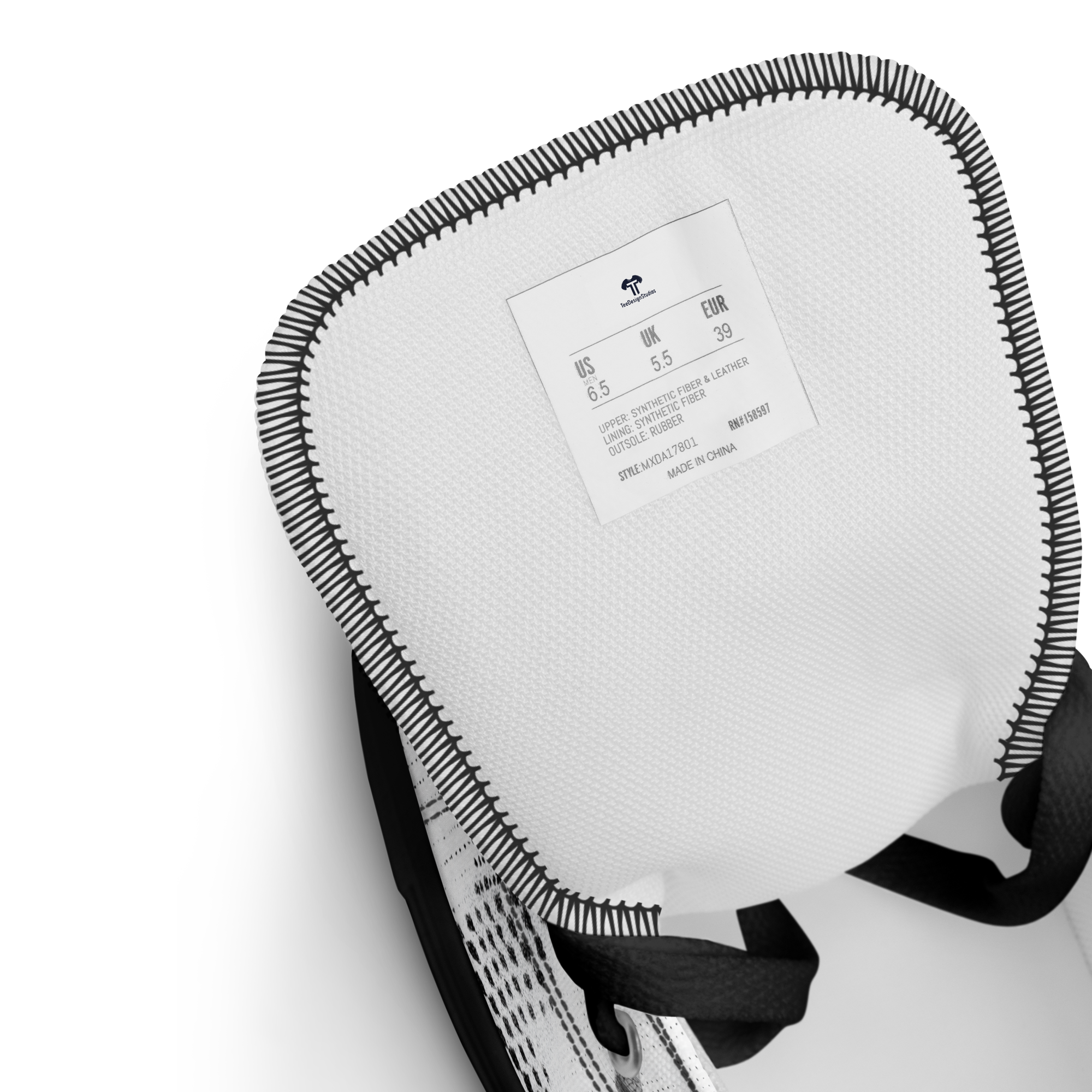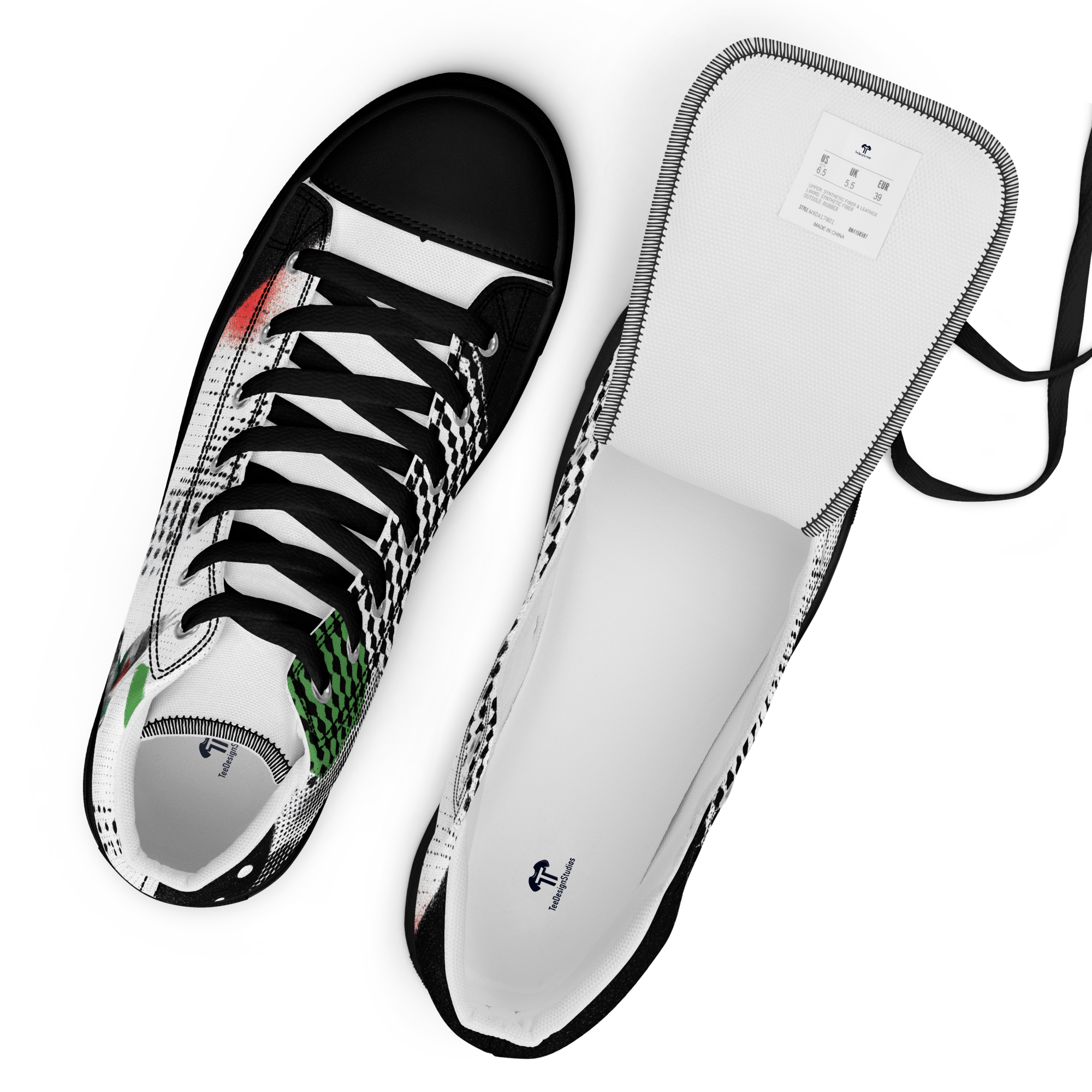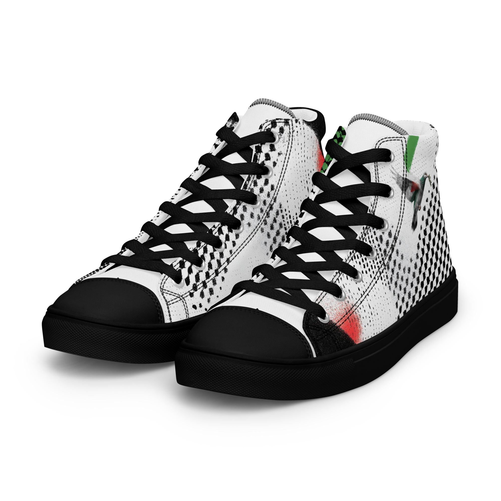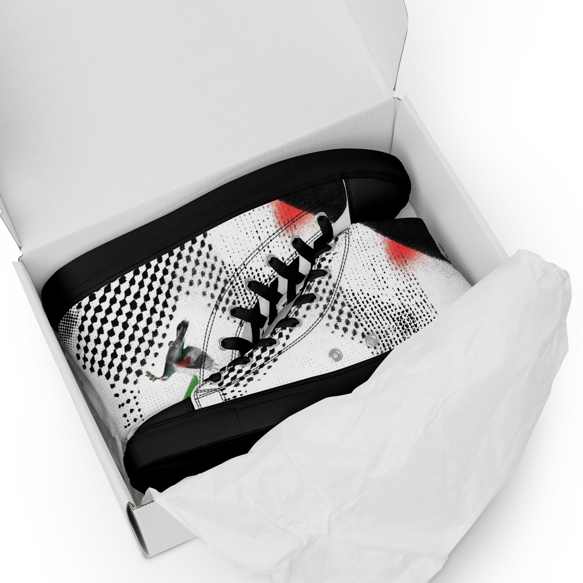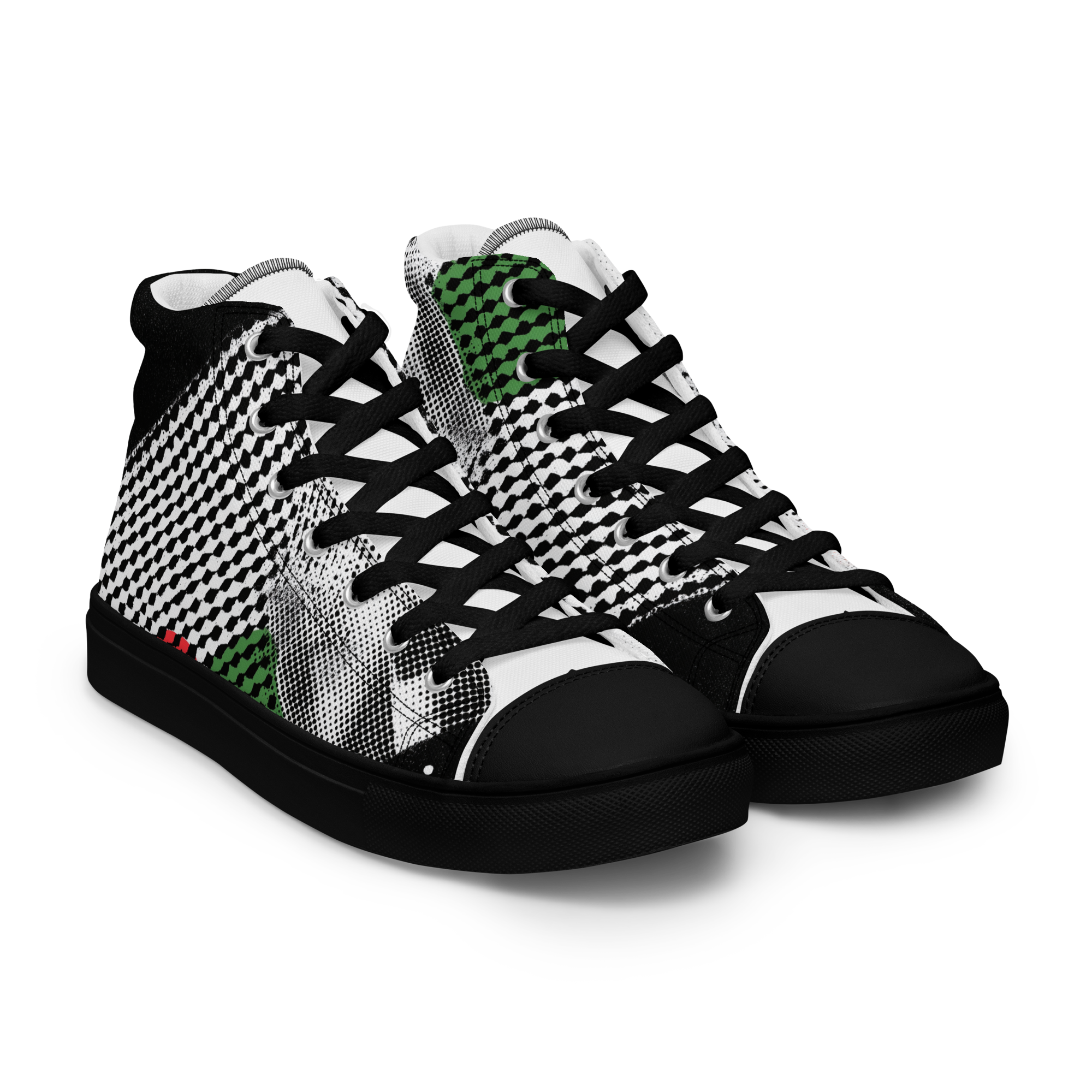 Elevate your footwear collection with these handmade high-top canvas shoes. Featuring a bold Palestinian keffiyeh pattern accented by geometric green and red details, the design centers on the classic black and white fishnet motif enhanced with traditional tatreez embroidery. The minimalist color scheme of black, white, green, and red creates a sharp, high-contrast look in a vector art style ideal for screen printing, with a dove placed subtly in the bottom right corner.