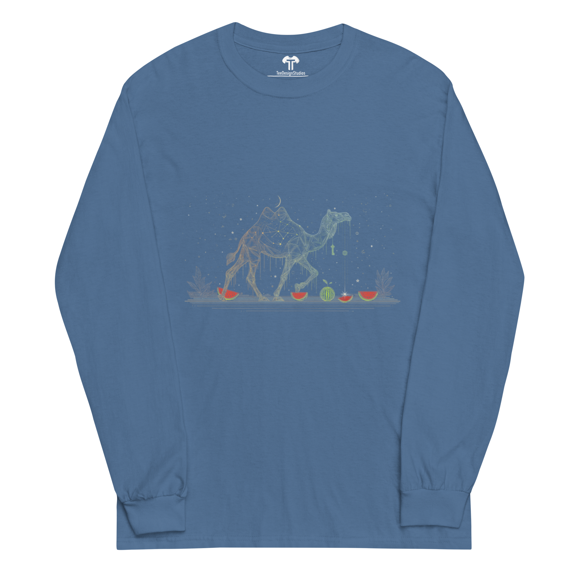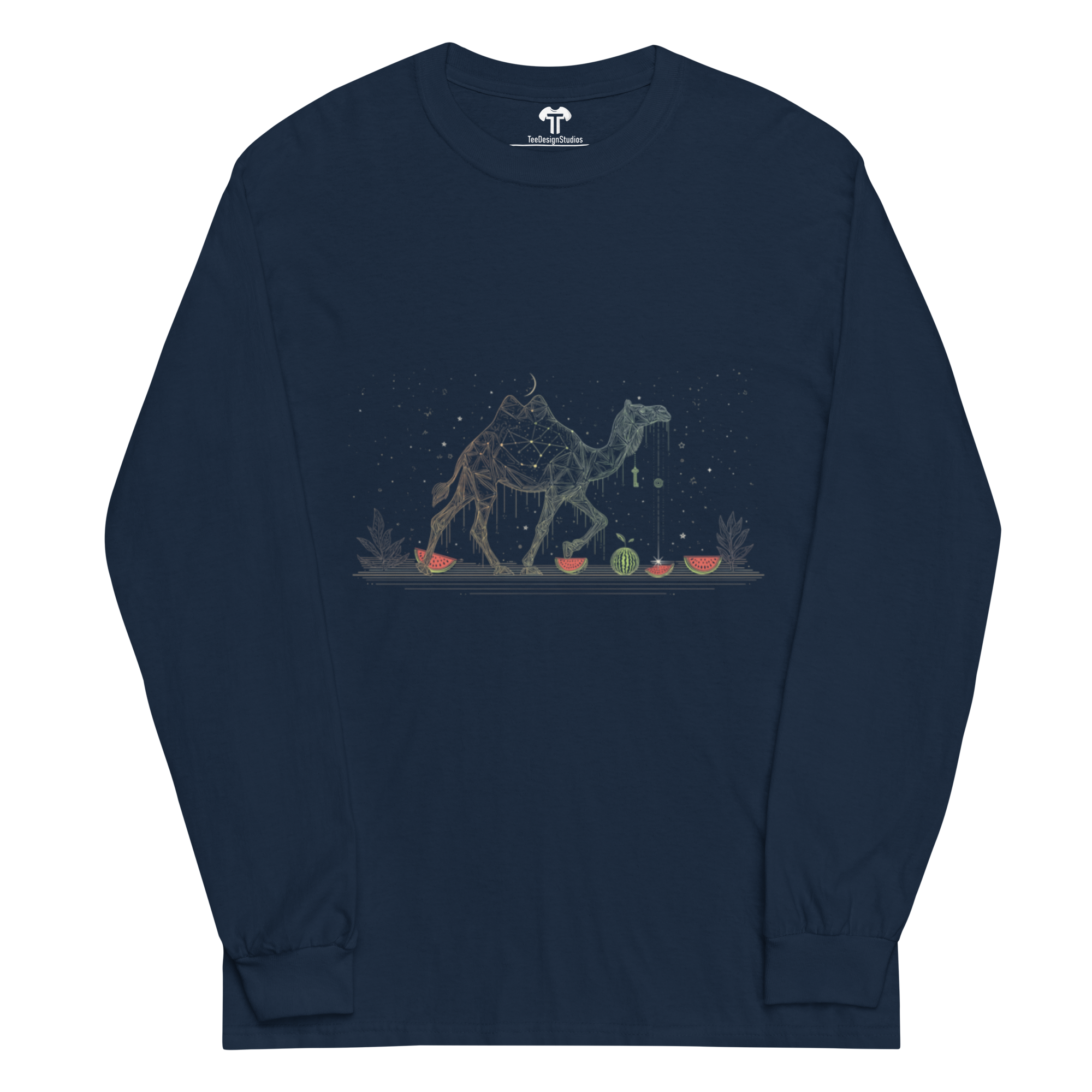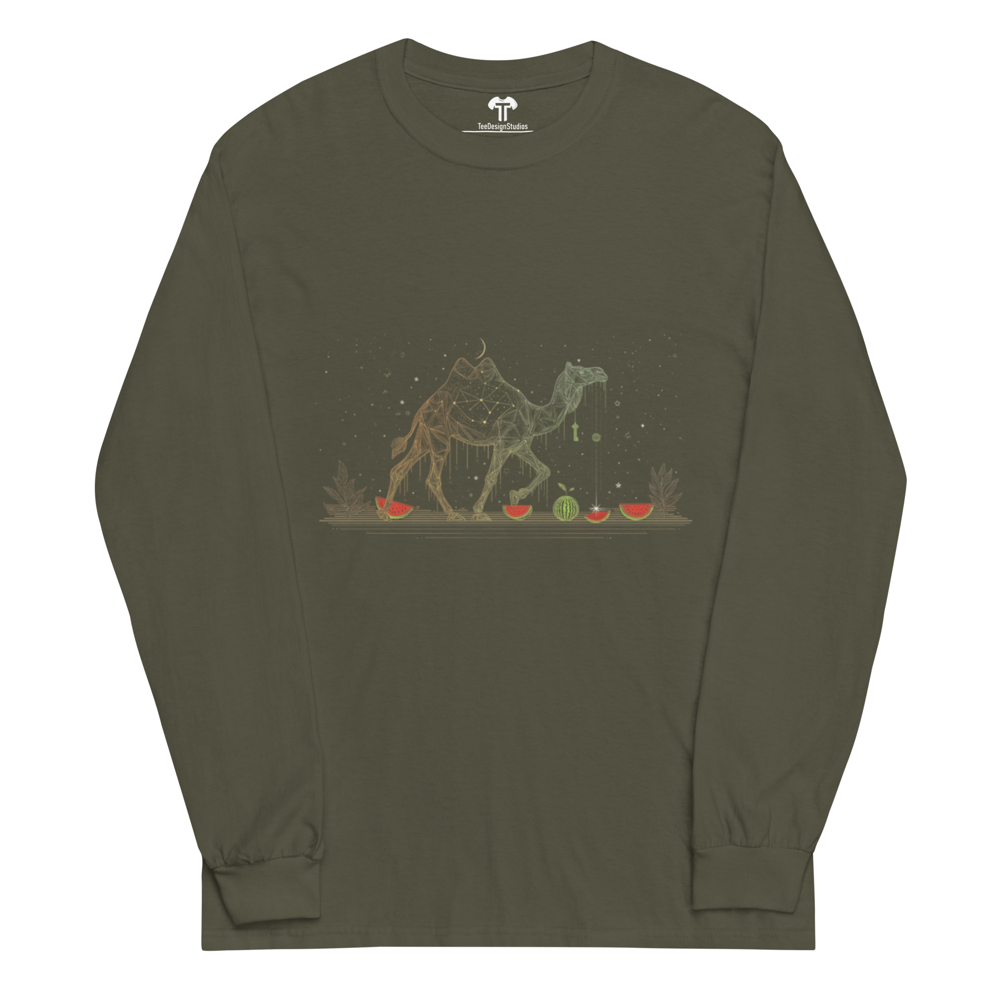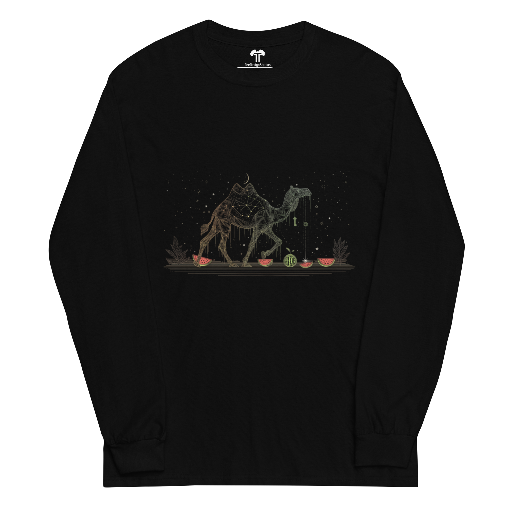 A quality long-sleeve shirt is a staple in every man’s wardrobe. This versatile piece offers an ideal choice for casual wear or a relaxed business look. The design features a celestial camel formed by stars and constellations, its glowing body displaying the colors of the Palestinian flag. It treads along a path of watermelon slices and olive leaves toward a radiant key, capturing a mystical, cosmic, and symbolic style.