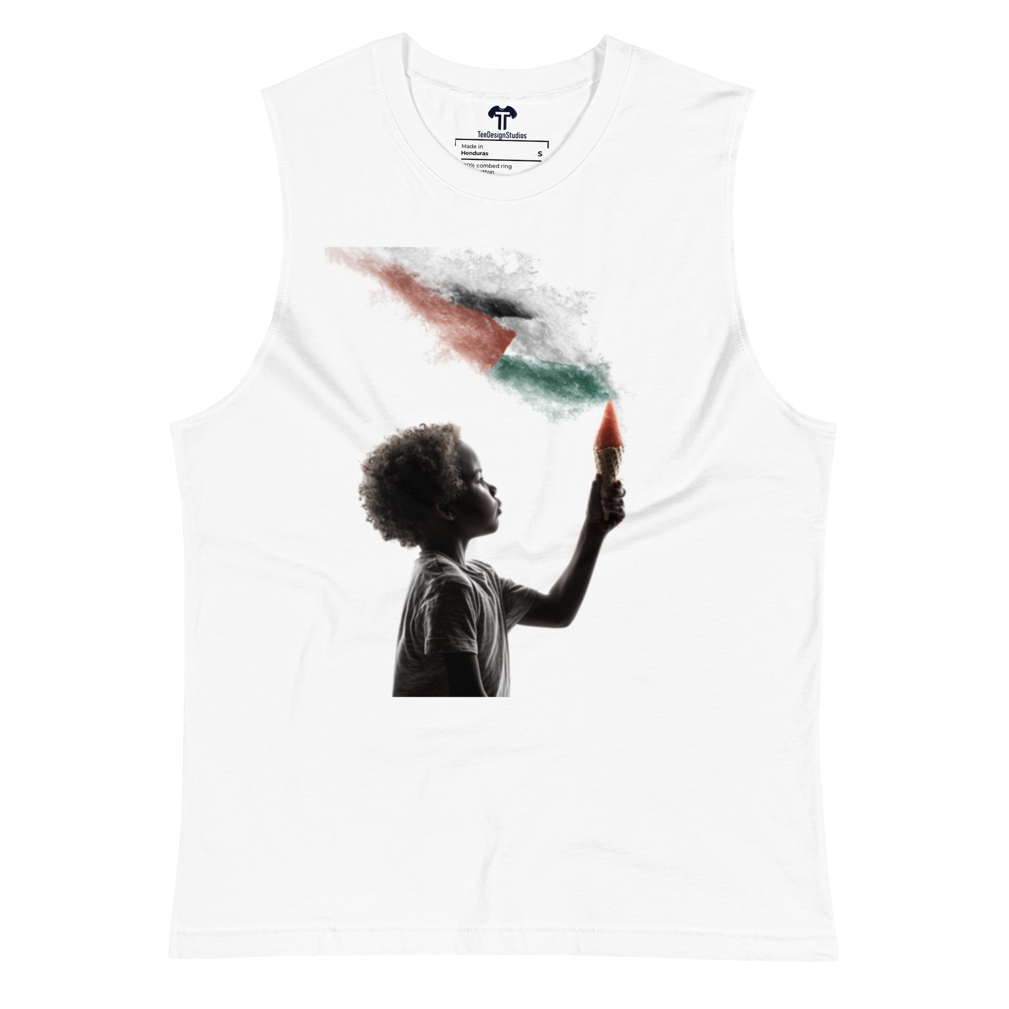 Live in comfort and make a statement with this ultra-soft sleeveless tank. Designed for everyday wear—from yoga sessions to urban strolls—its relaxed fit and casual armholes offer effortless style. The bold graphic features a determined child holding a glowing watermelon ice cream cone at a protest, with smoke rising to form the Palestinian flag against a stark white background. Symbolic, high-contrast, and visually striking, this design blends urban comfort with powerful activism.