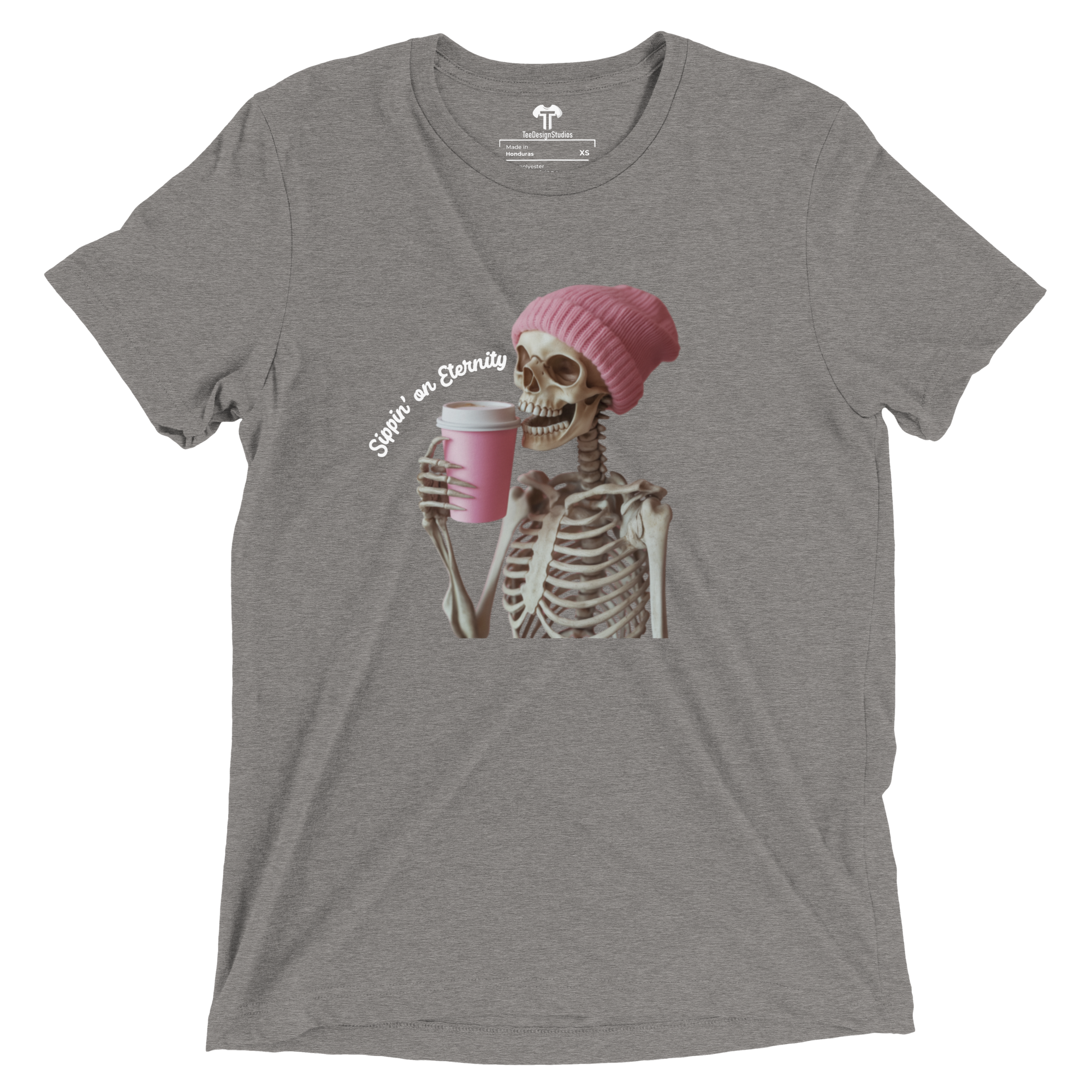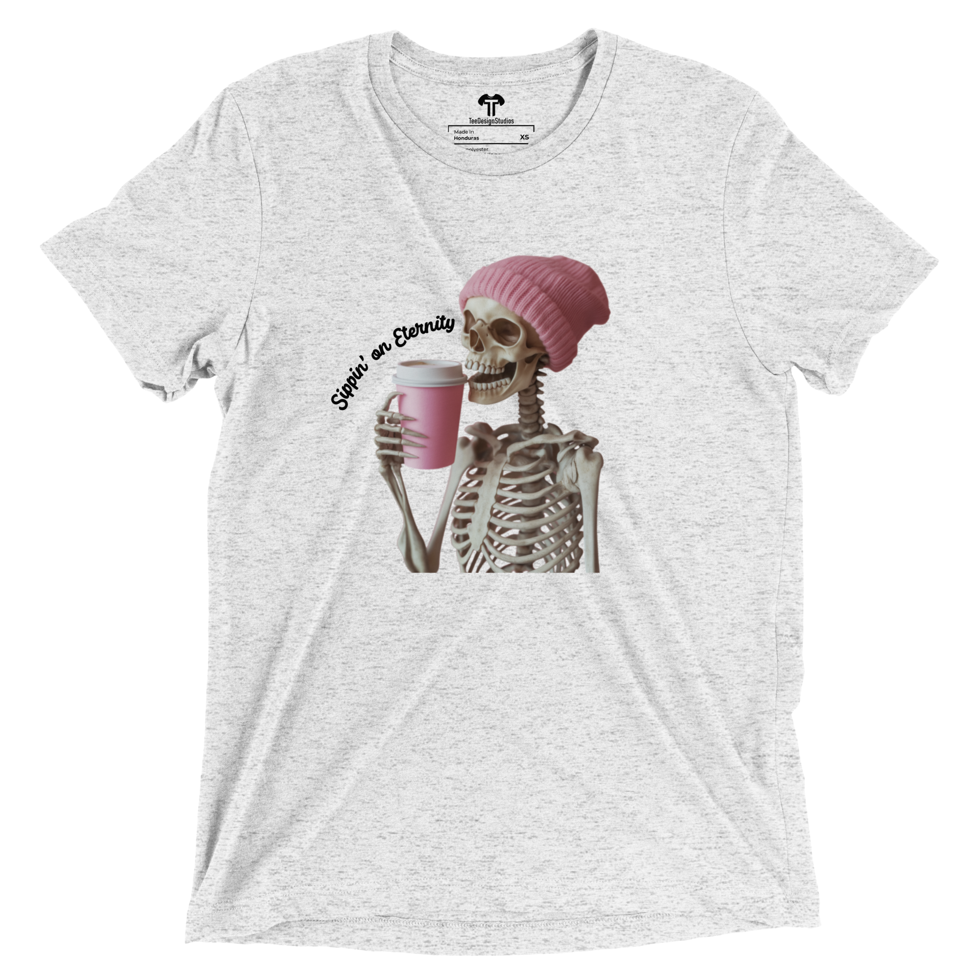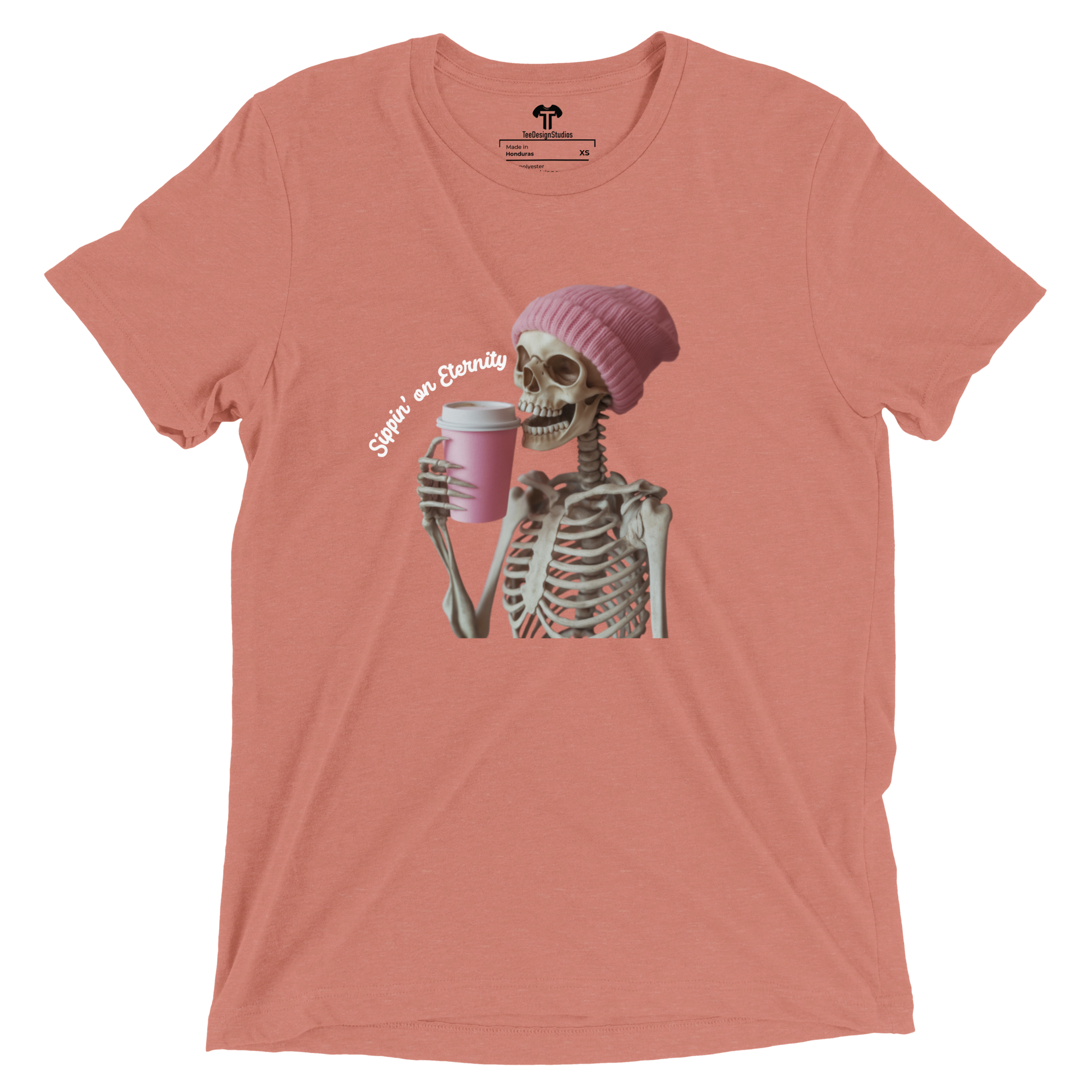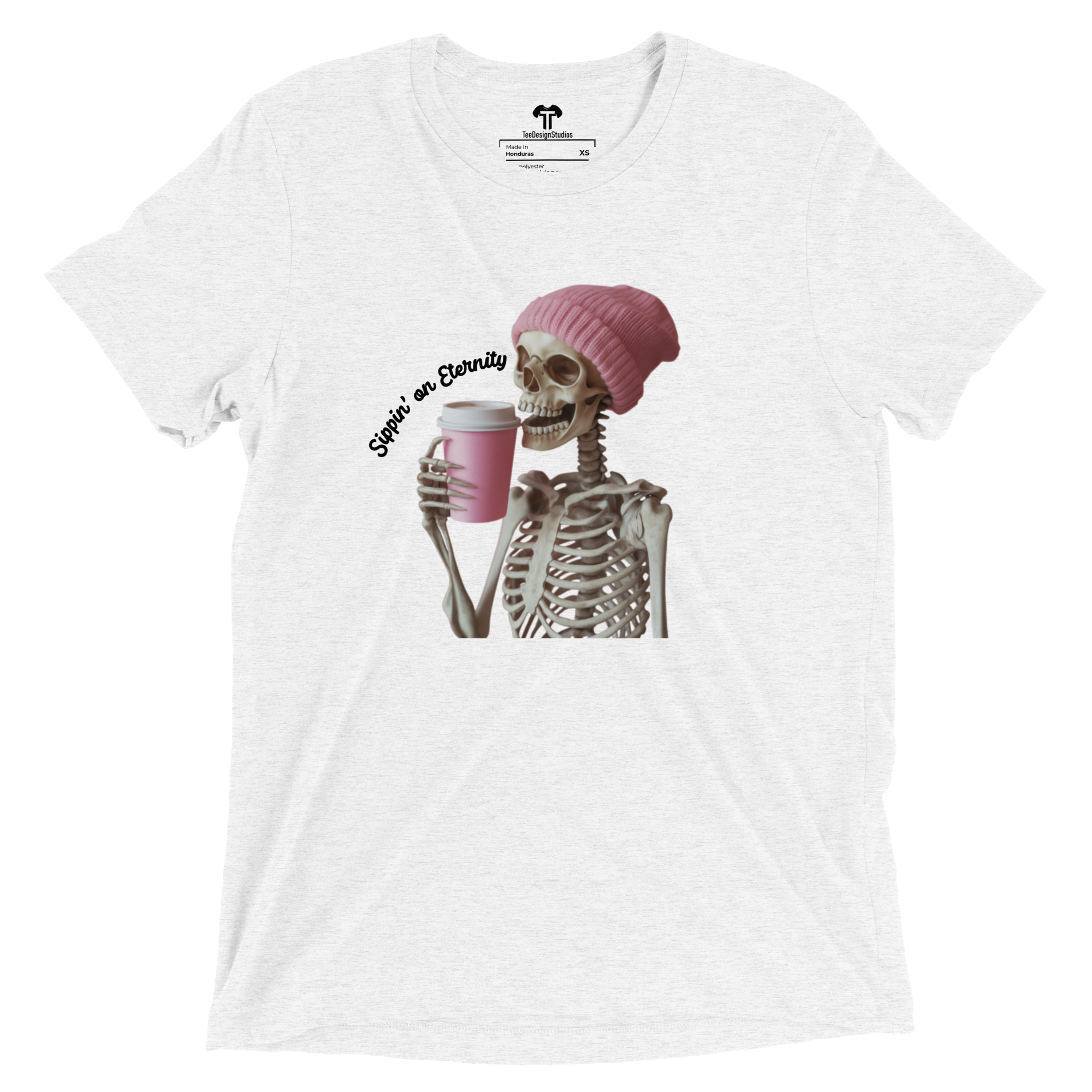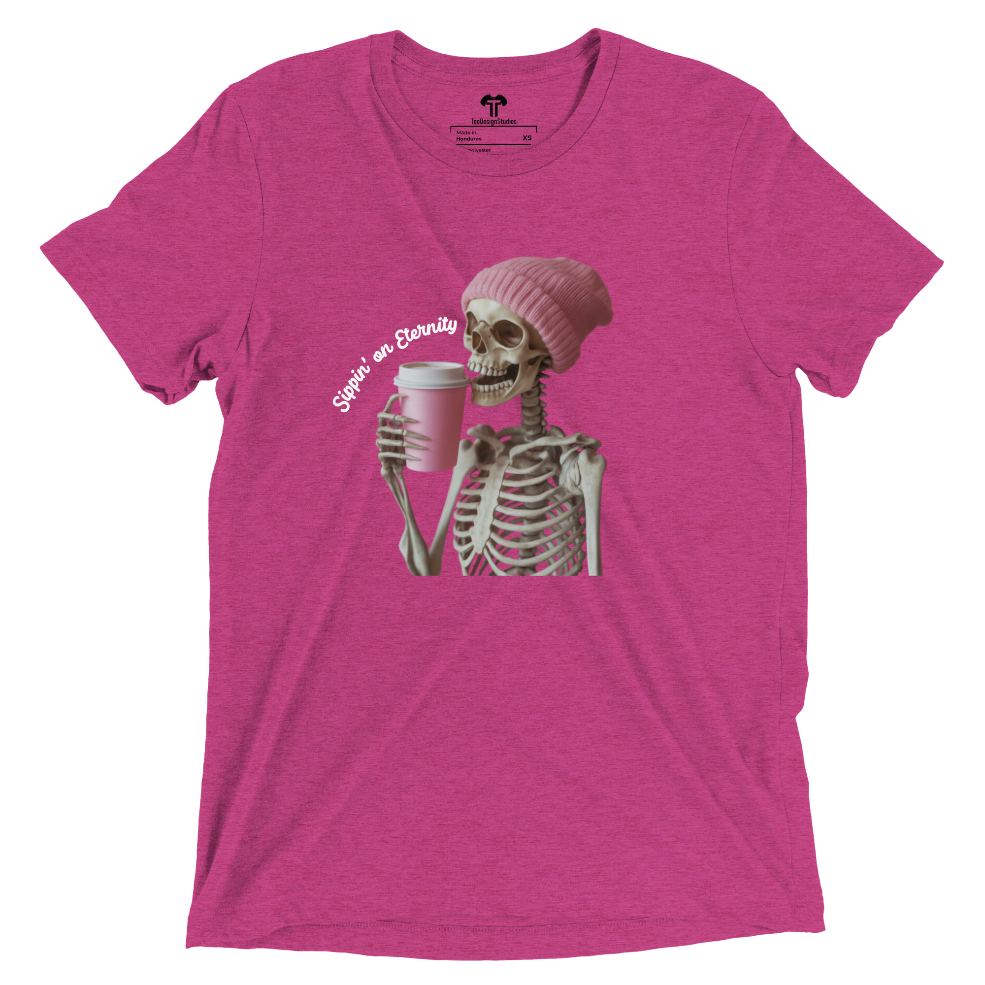 Made from tri-blend fabric, this t-shirt provides a vintage, tailored fit with outstanding durability that stays comfortable through countless washes. The design depicts a skeleton in a pink beanie, sipping coffee from a to-go cup with a pink lid, accompanied by the phrase “sippin' on eternity.”