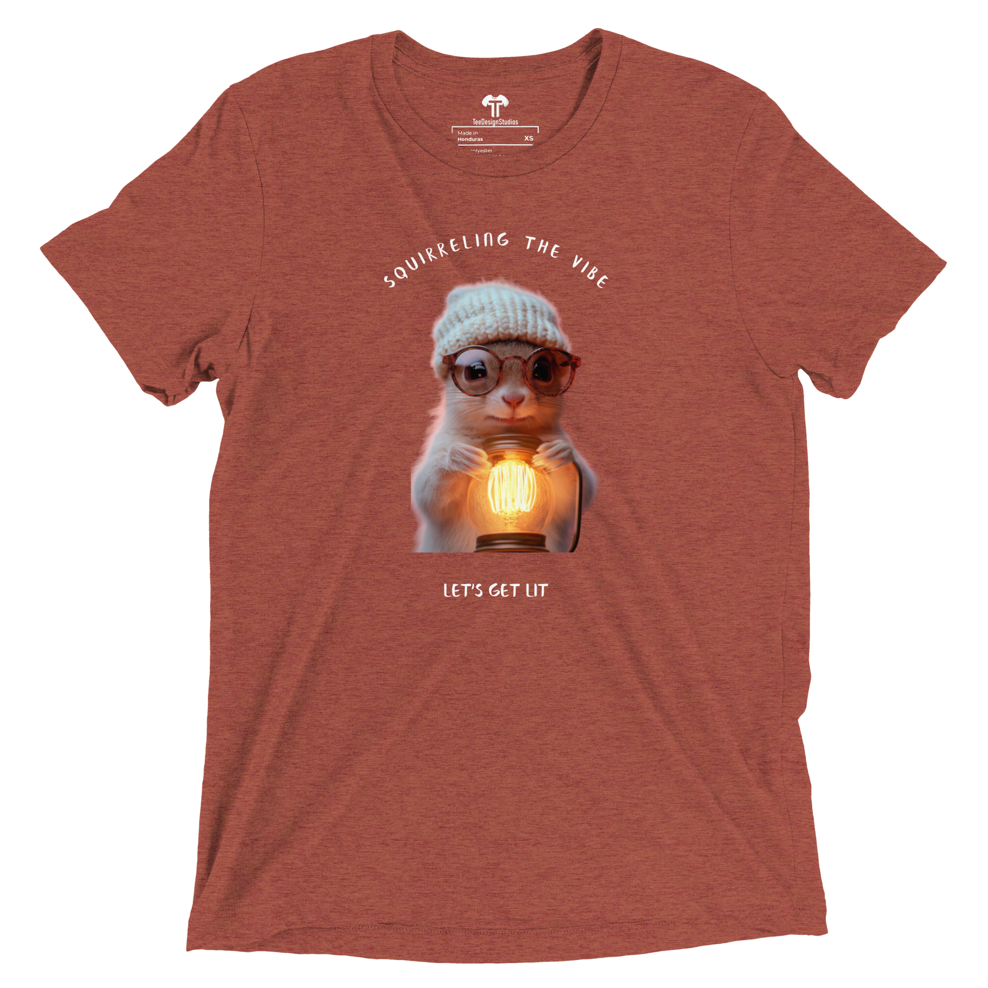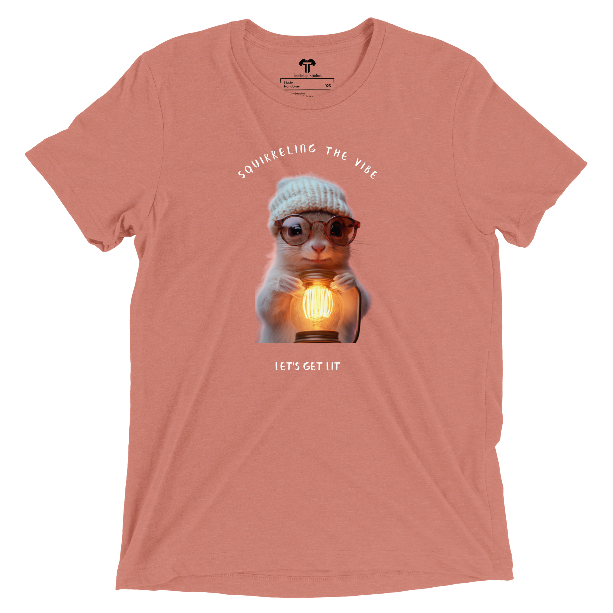 This short sleeve t-shirt features a tri-blend fabric that offers a vintage, tailored fit. Its exceptional durability ensures the shirt maintains comfort and shape even after many washes. The design showcases a smiling white squirrel wearing mirrored sunglasses, dancing on an Edison lamp against a soft pink pastel background with clear, bright colors, captured in a studio portrait style.
