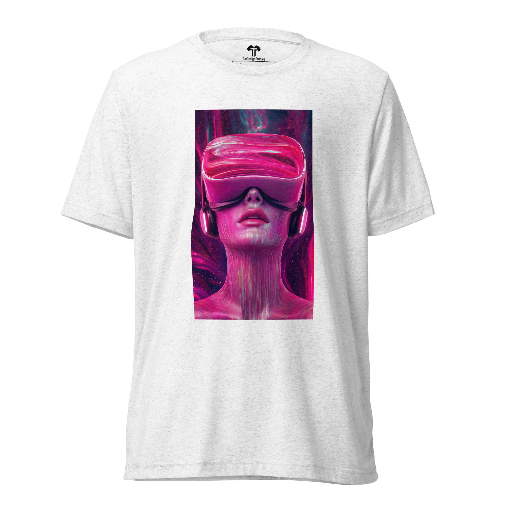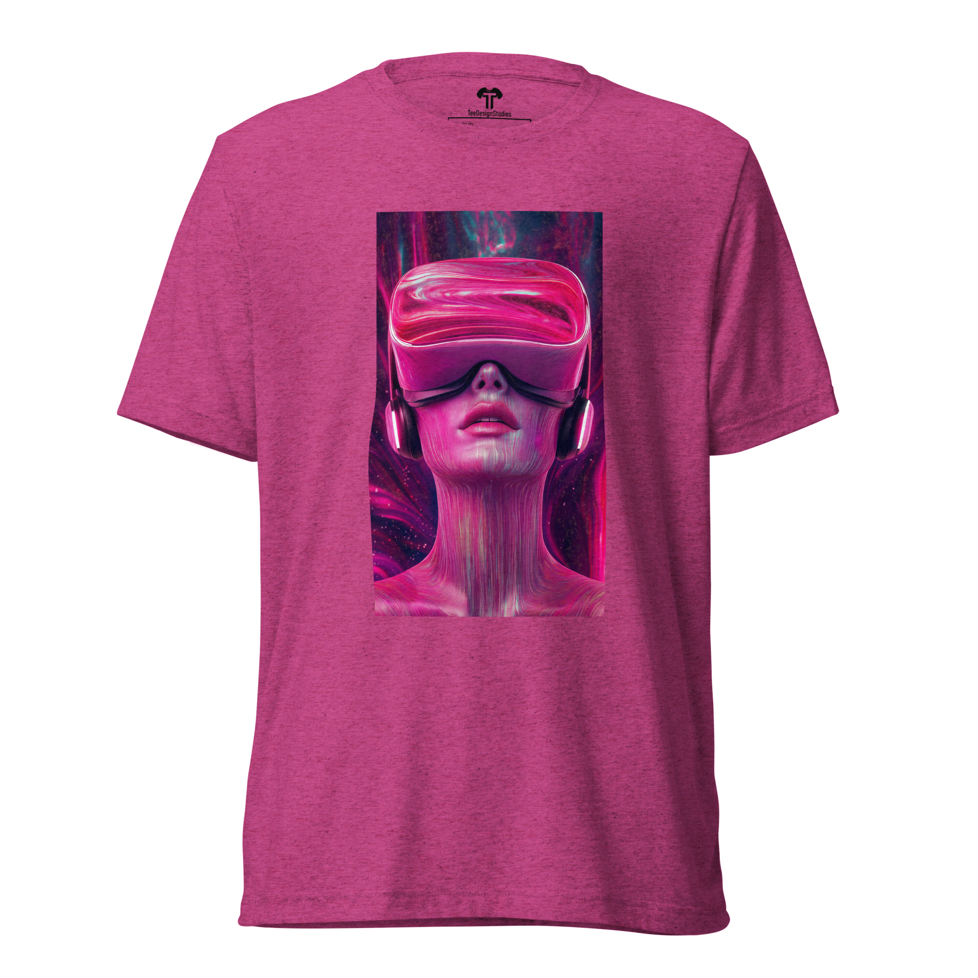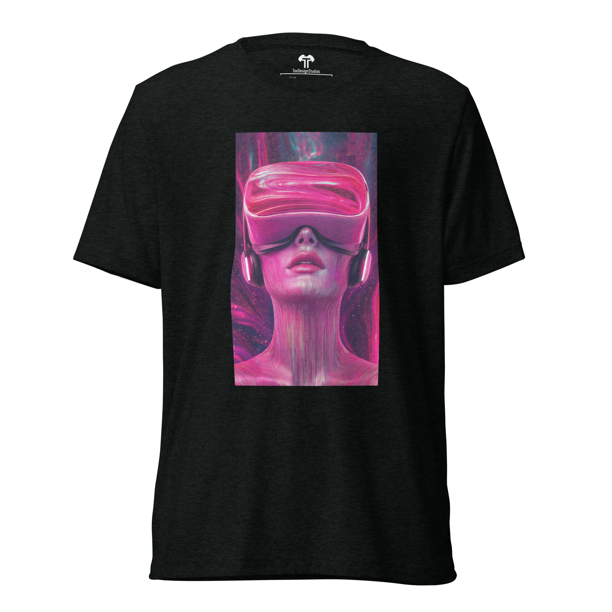 Crafted from tri-blend fabric, this short sleeve t-shirt offers a vintage-inspired, fitted silhouette. Its high durability ensures lasting comfort and shape retention through countless washes. The design evokes sleek, futuristic VR glasses highlighted by neon accents, situated within a vibrant 3D abstract setting full of swirling colors and dynamic lighting.