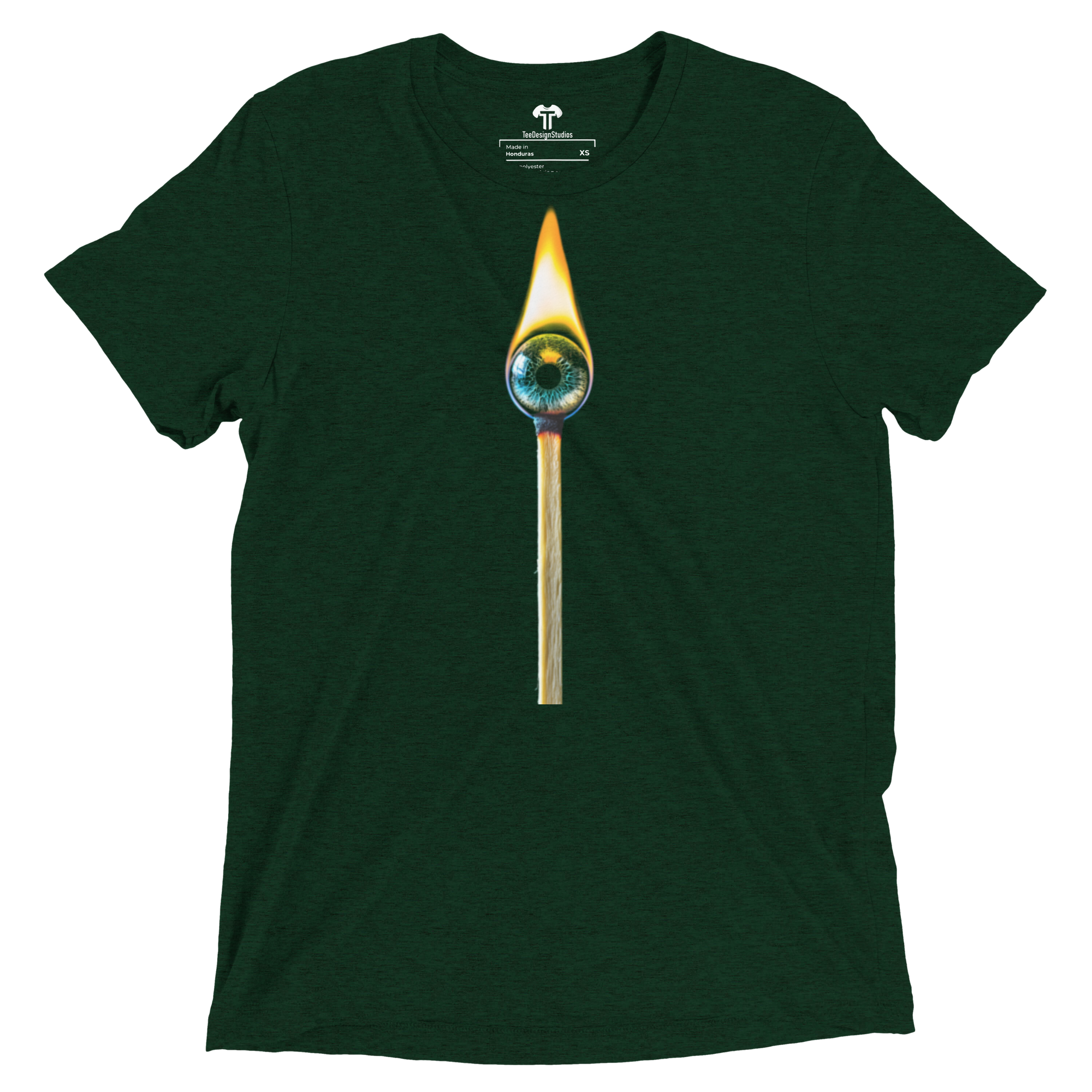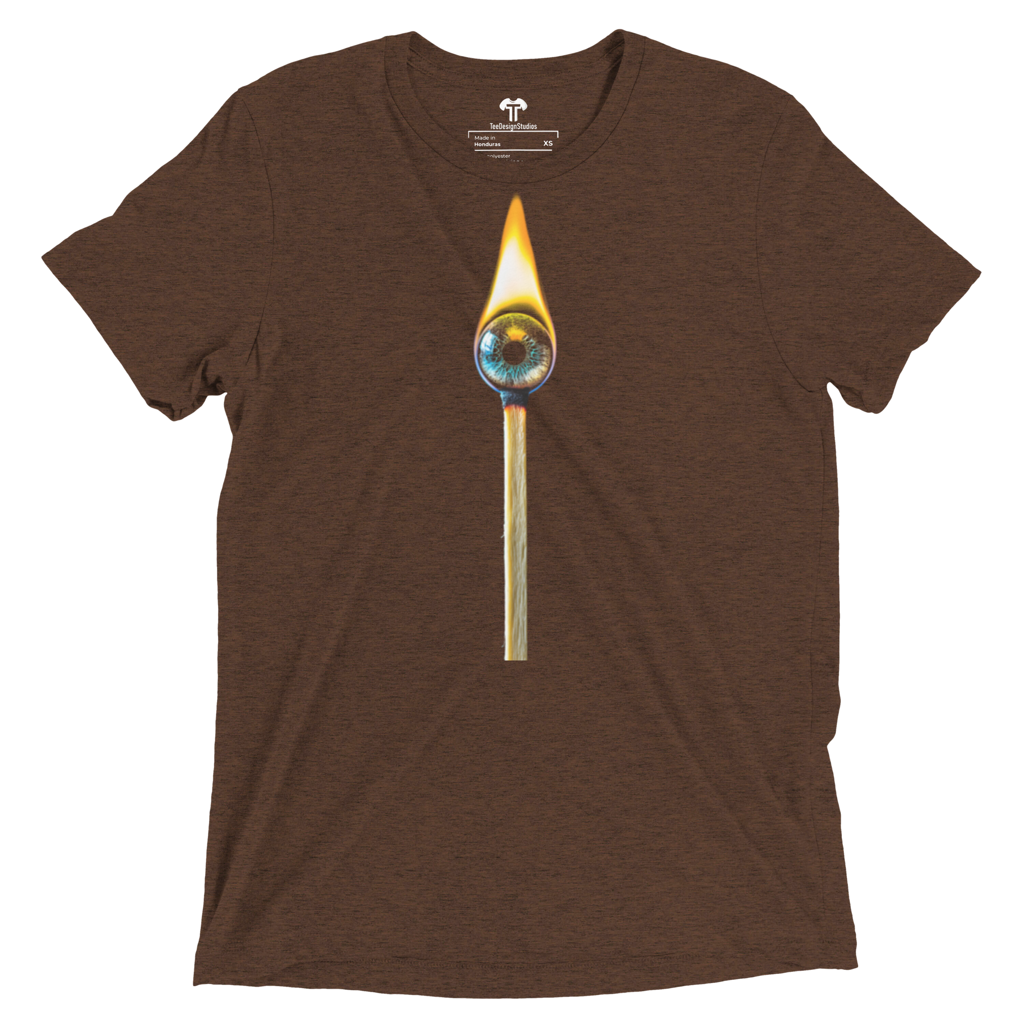 Crafted from tri-blend fabric, this short sleeve t-shirt offers a vintage, tailored fit with exceptional durability that holds up through countless washes while maintaining superior comfort. It showcases a surrealistic art illustration inspired by Salvador Dalí and René Magritte—a close-up of a flame burning on a match, featuring an eyeball with a rainbow gradient—bringing a unique, UHD visual impact to your wardrobe.