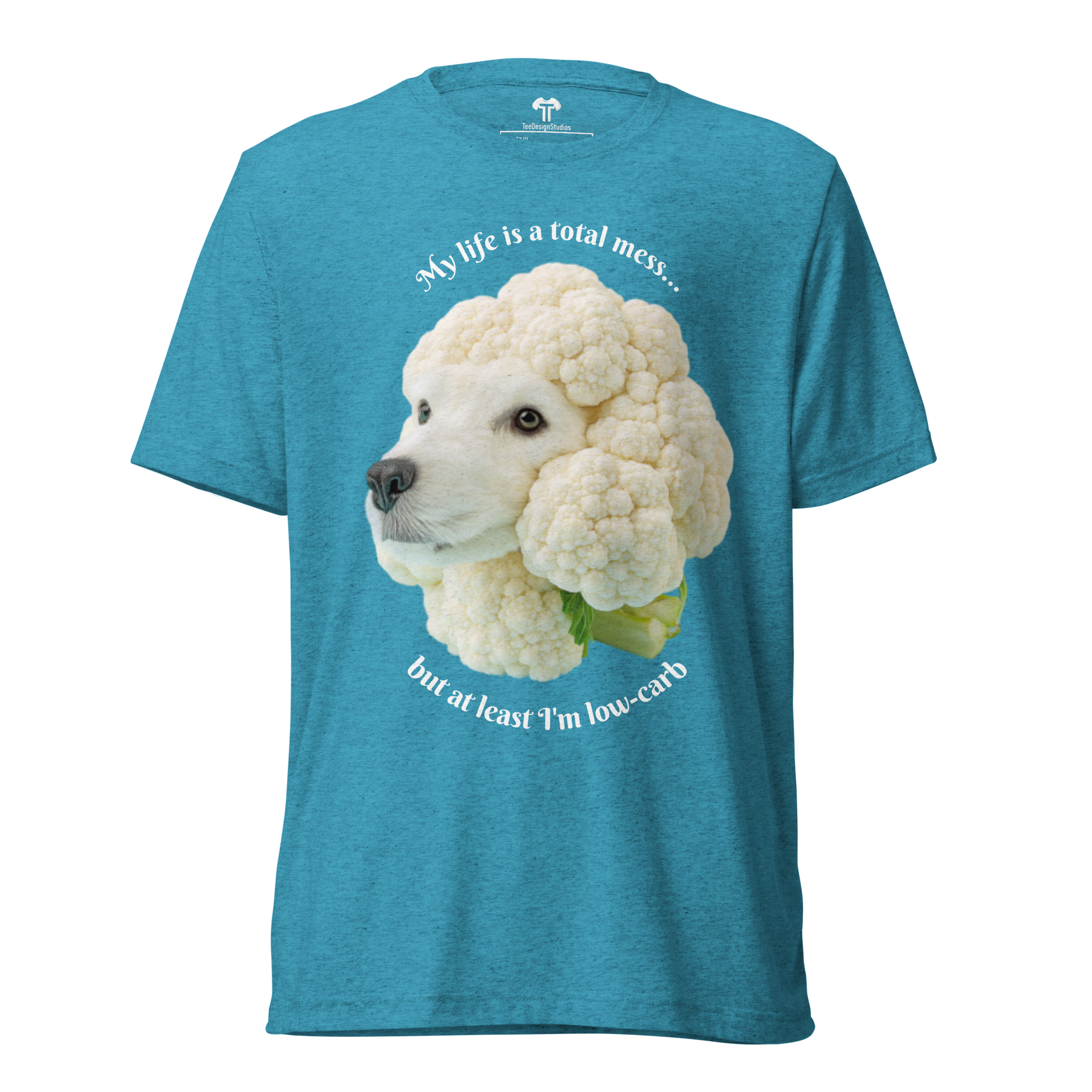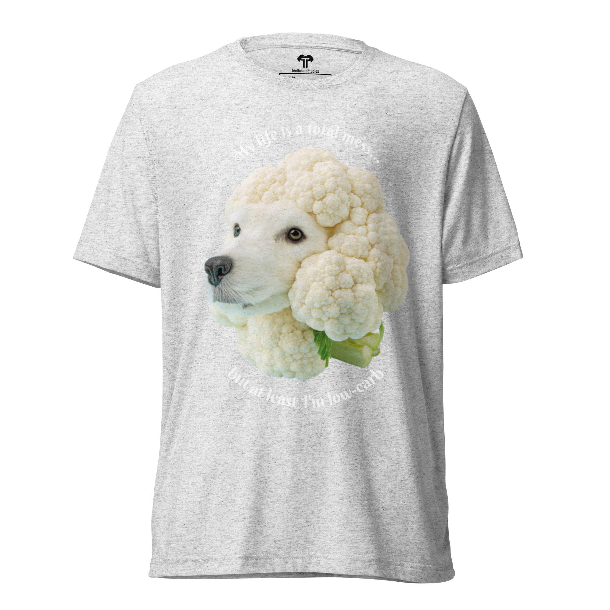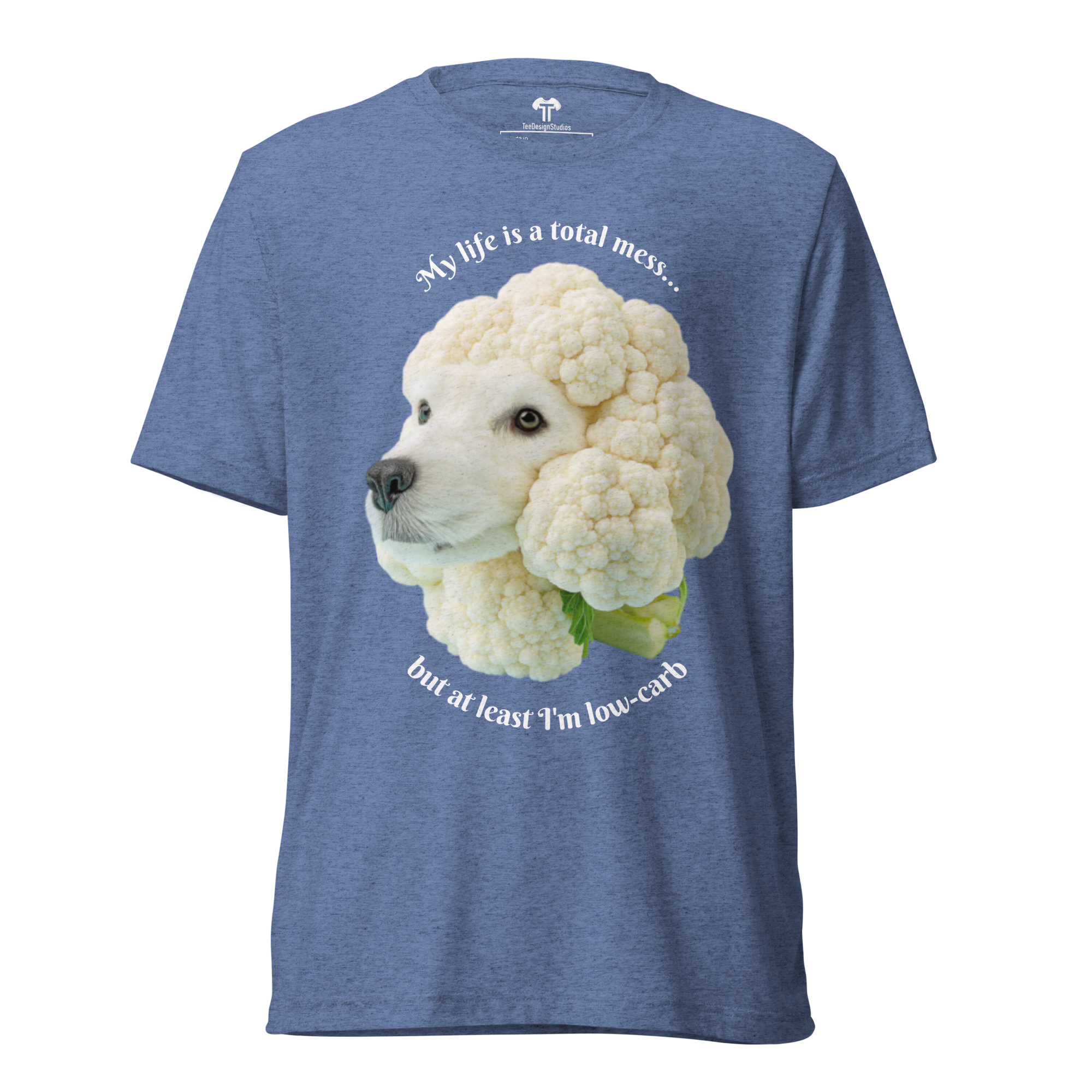 Crafted from premium tri-blend fabric, this t-shirt offers a soft, vintage-inspired fit with exceptional durability that maintains its comfort and shape wash after wash. The design features a surreal, minimalist photograph of a cute dog's head sculpted from white, beige, and light grey cauliflower, set against a soft blue background. This whimsical artwork is perfectly paired with the self-aware phrase: 'My life is a total mess... but at least I'm low-carb,' blending humor and artistry for a uniquely charming top.
