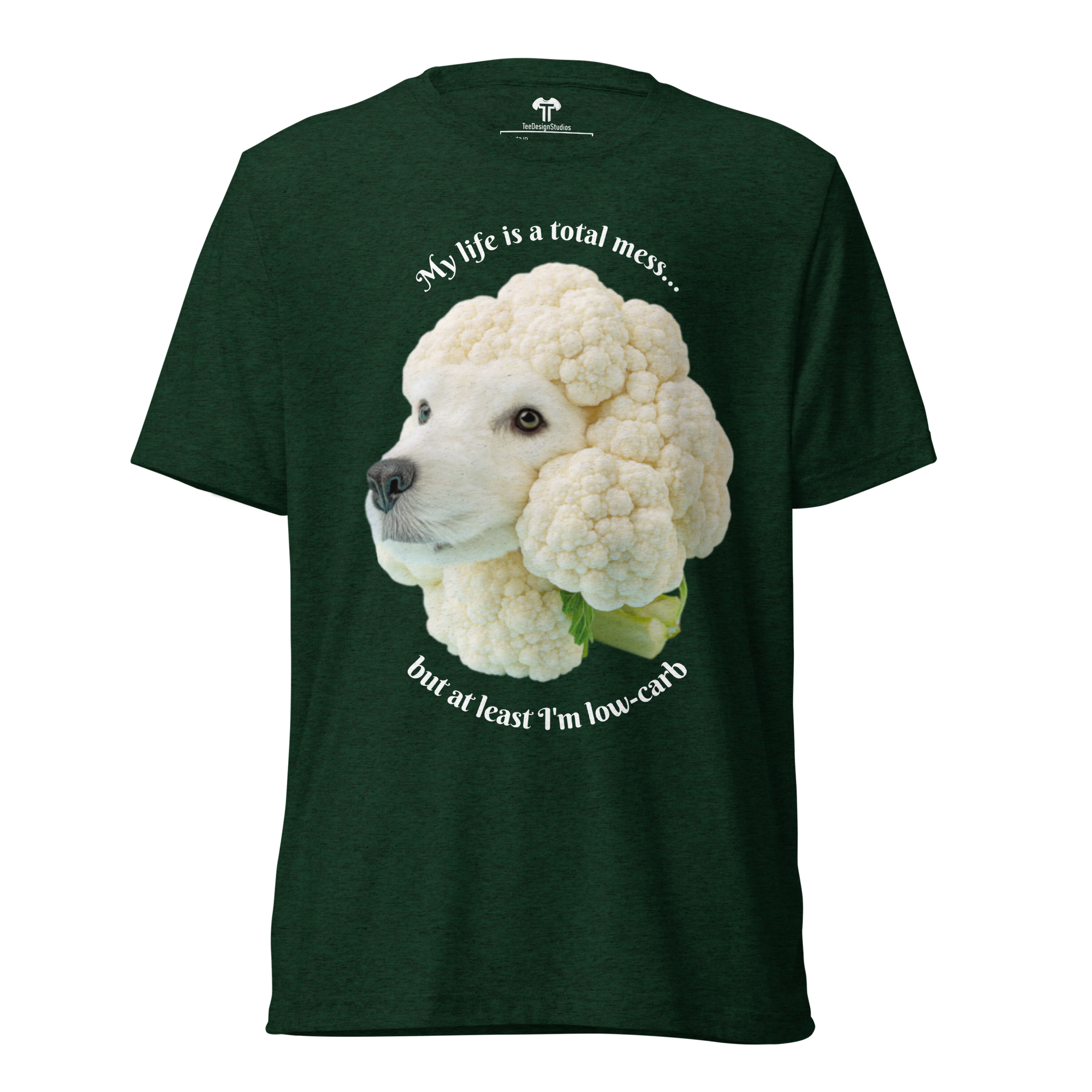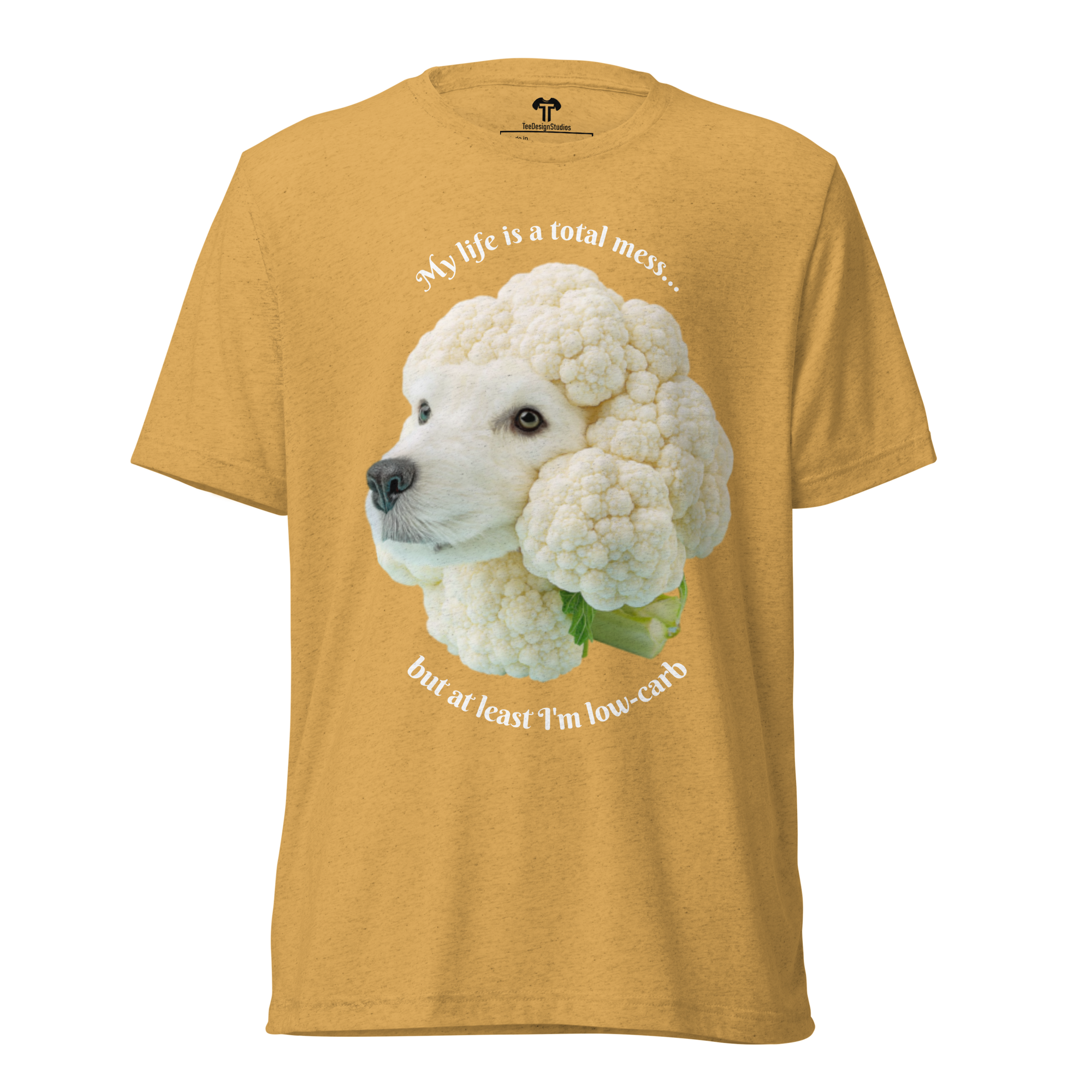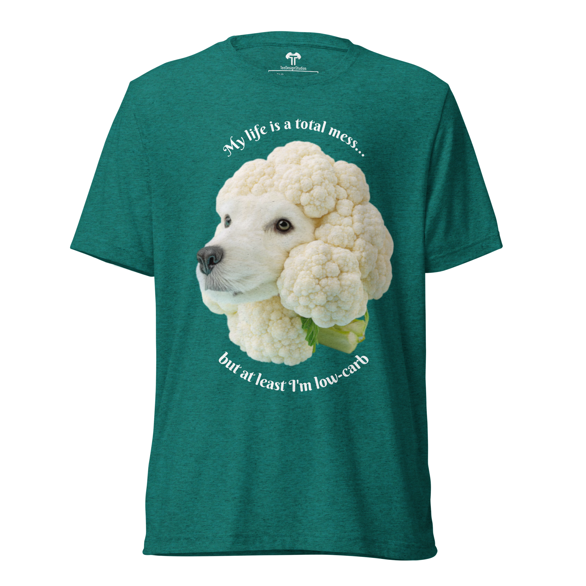 Crafted from premium tri-blend fabric, this t-shirt offers a soft, vintage-inspired fit with exceptional durability that maintains its comfort and shape wash after wash. The design features a surreal, minimalist photograph of a cute dog's head sculpted from white, beige, and light grey cauliflower, set against a soft blue background. This whimsical artwork is perfectly paired with the self-aware phrase: 'My life is a total mess... but at least I'm low-carb,' blending humor and artistry for a uniquely charming top.