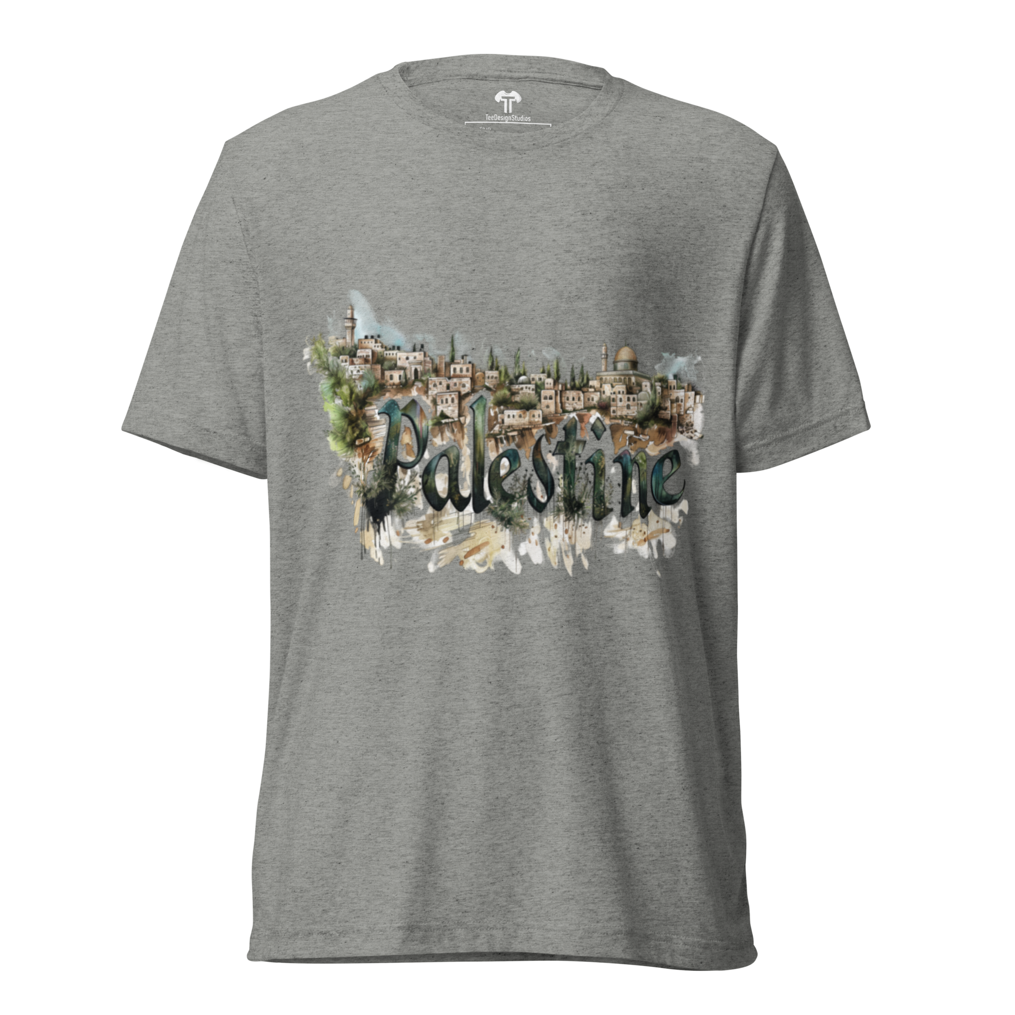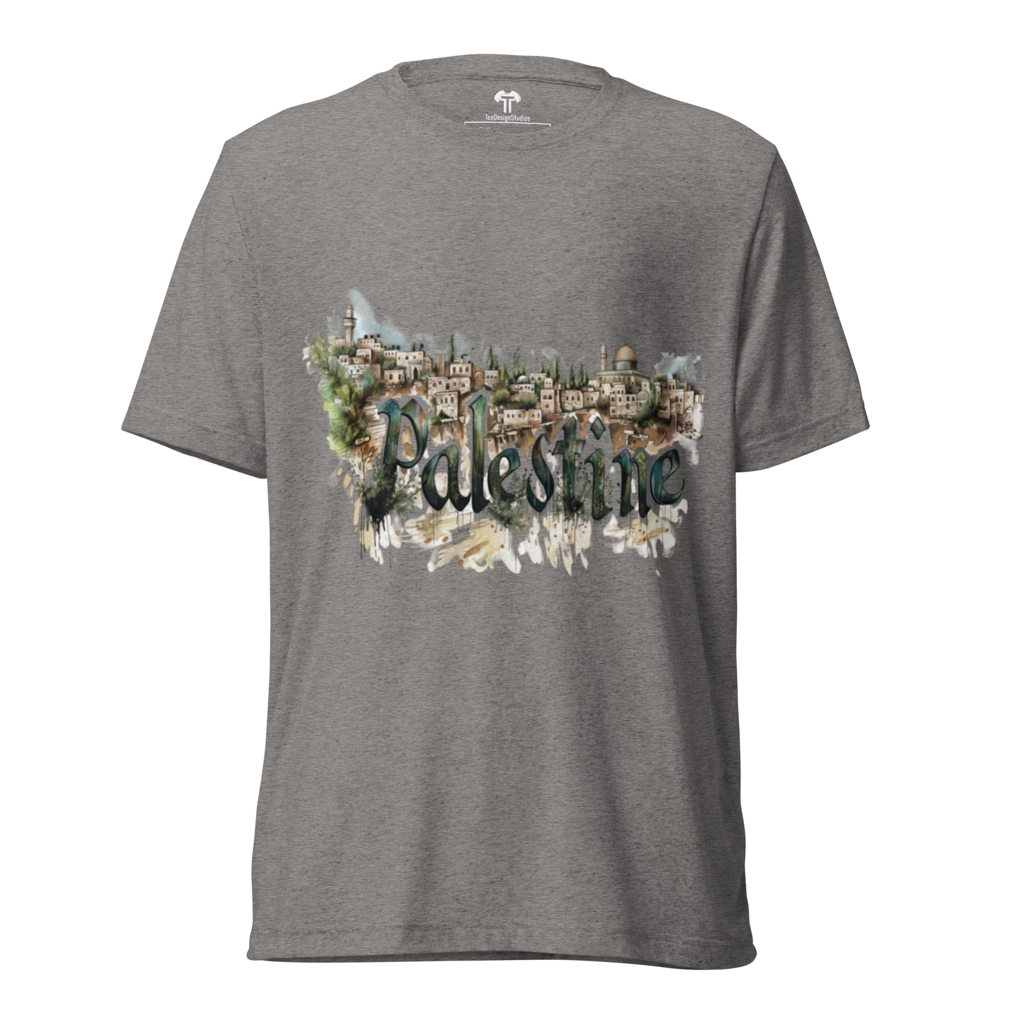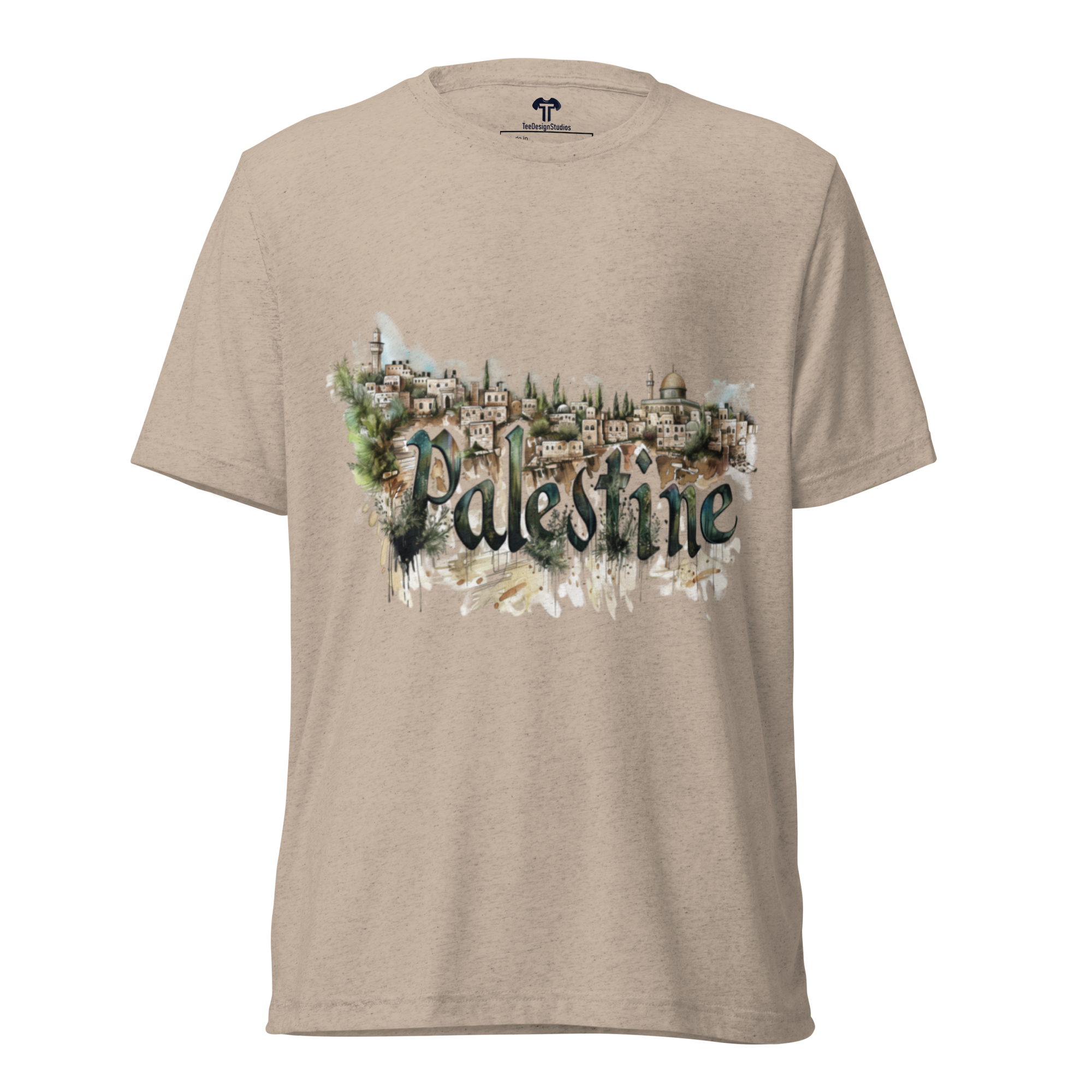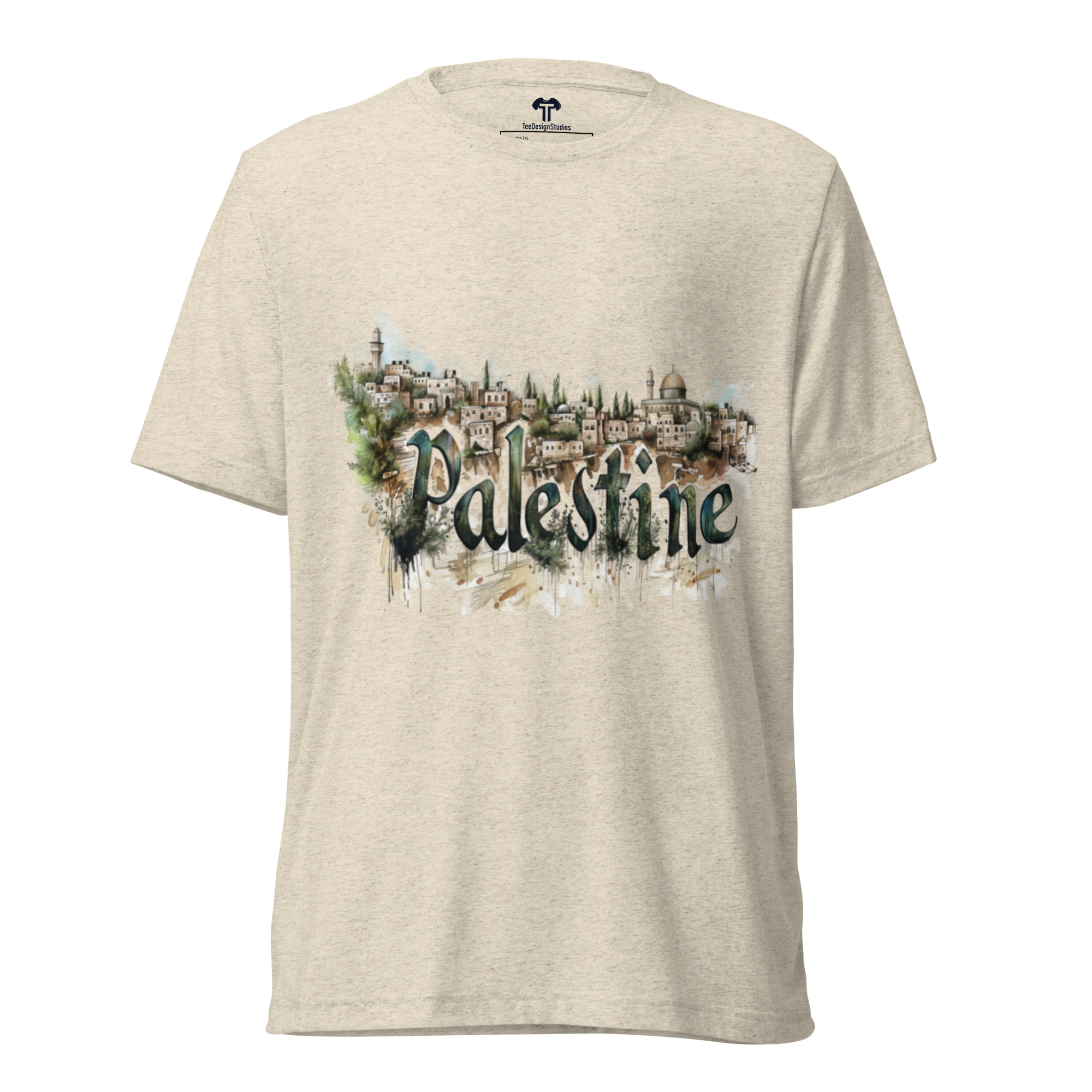 Crafted from tri-blend fabric, this t-shirt offers a vintage, tailored fit with exceptional durability, maintaining comfort even after many washes. The design features the word "Palestine" in refined calligraphy, with each letter intricately filled with landscapes of olive groves and stone houses rendered in earth tones against a clean white background.