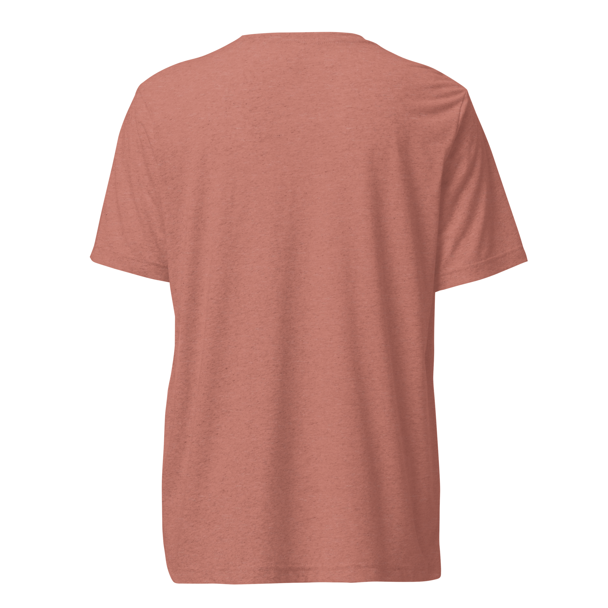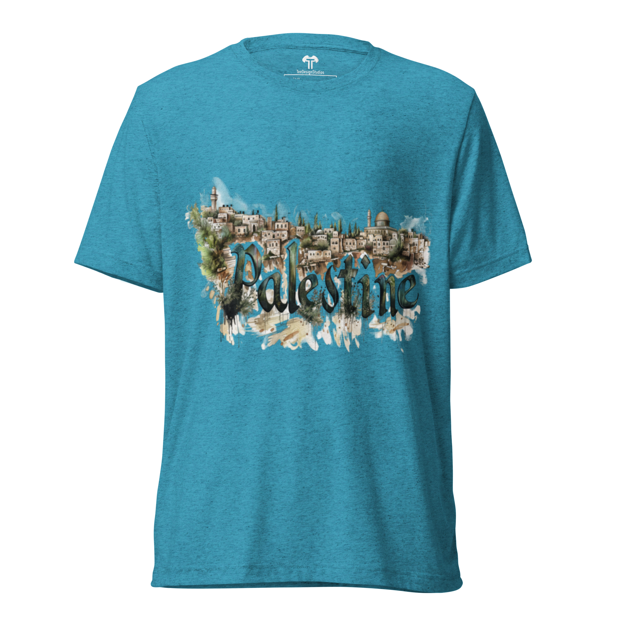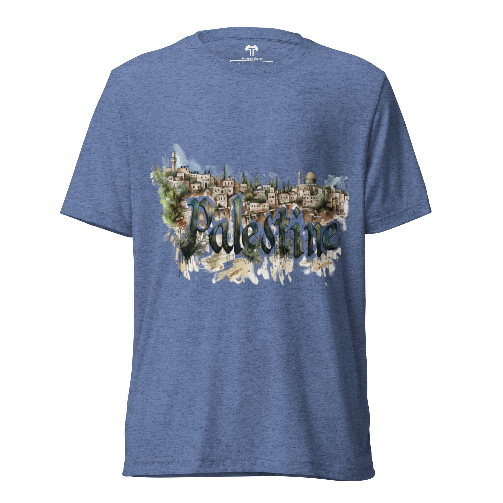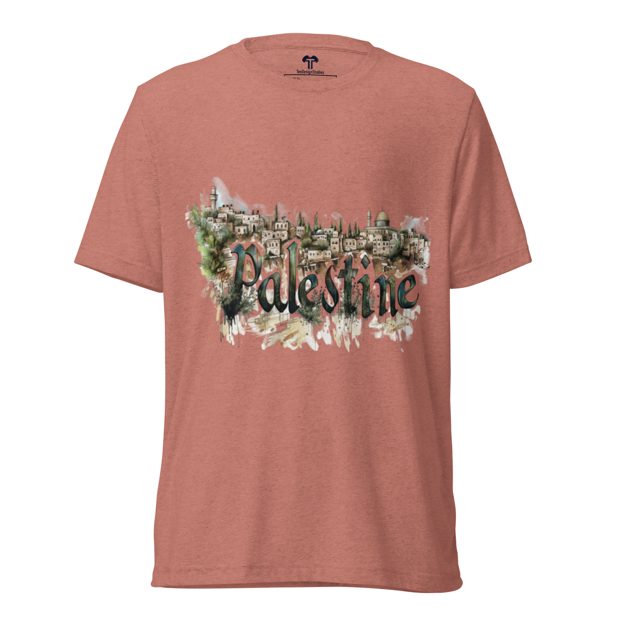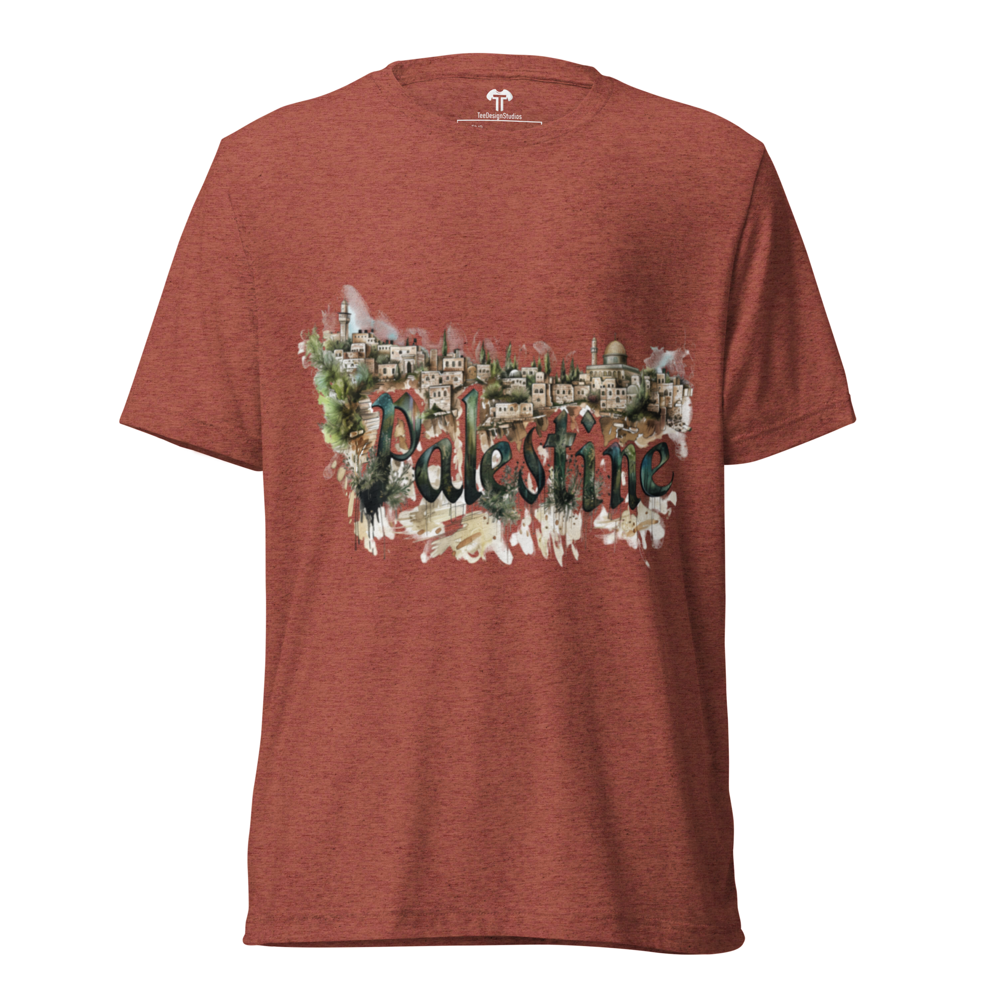 Crafted from tri-blend fabric, this t-shirt offers a vintage, tailored fit with exceptional durability, maintaining comfort even after many washes. The design features the word "Palestine" in refined calligraphy, with each letter intricately filled with landscapes of olive groves and stone houses rendered in earth tones against a clean white background.