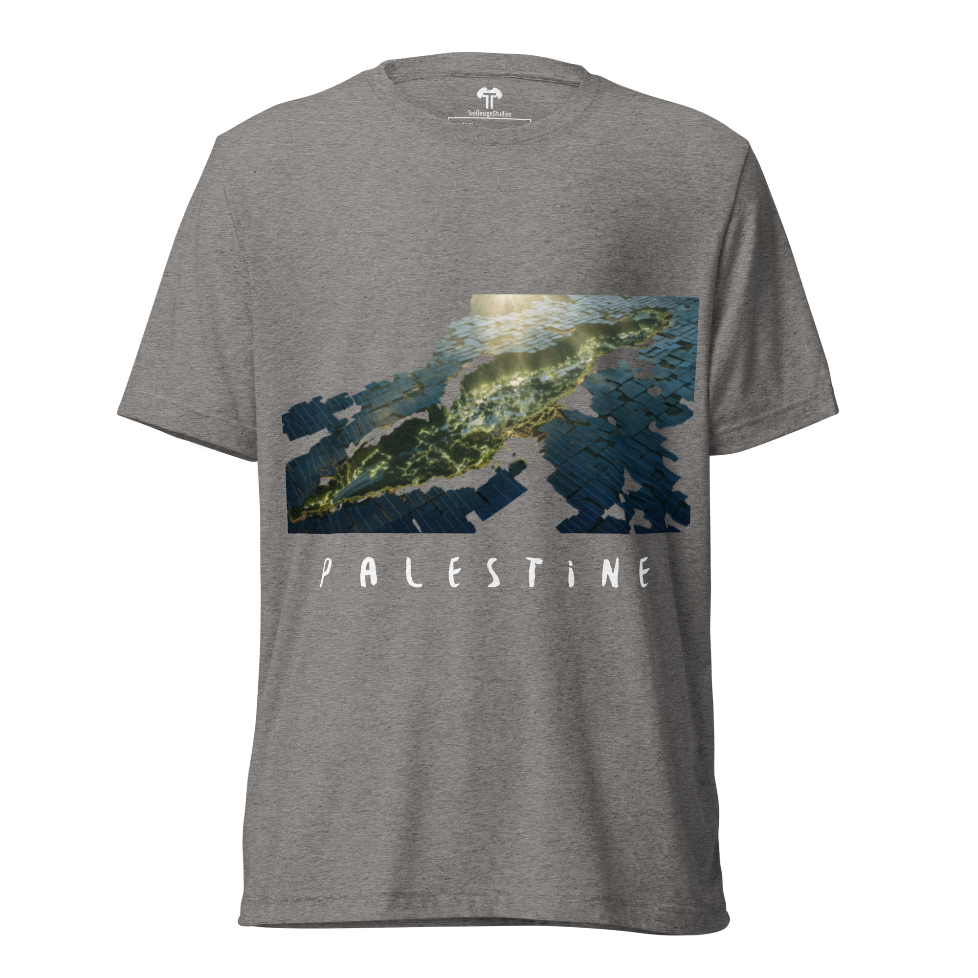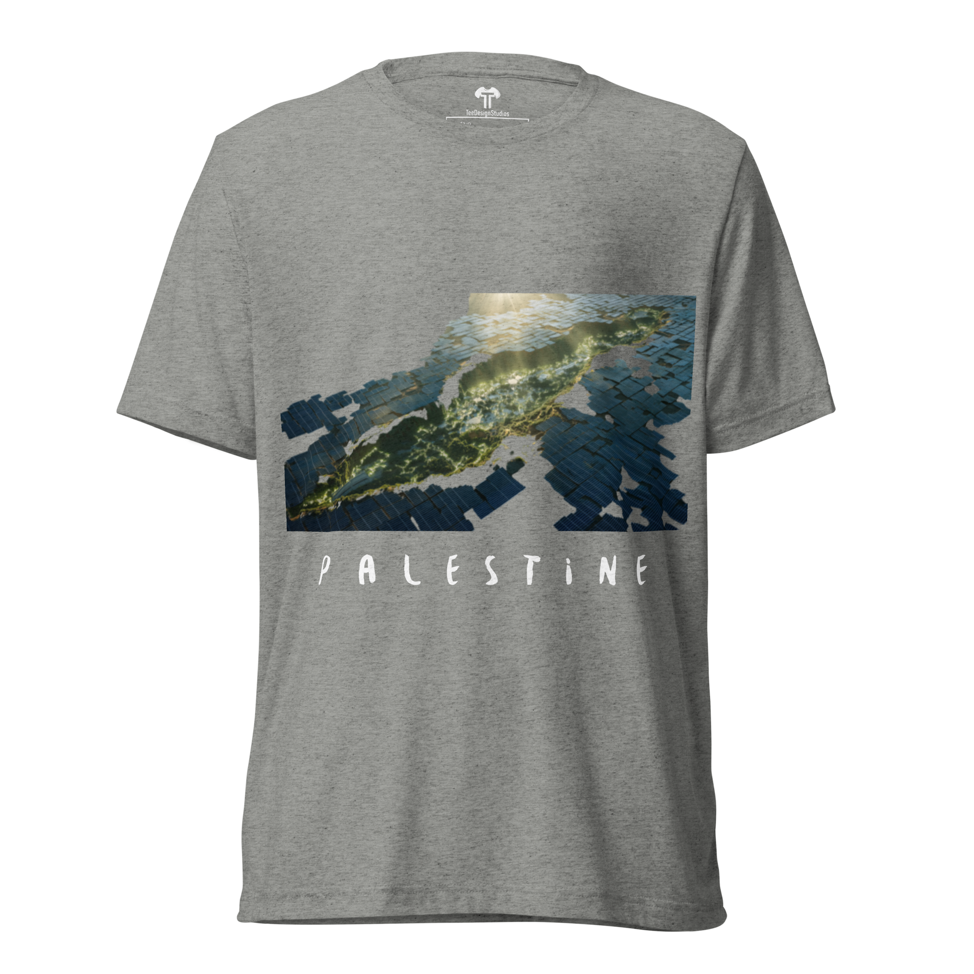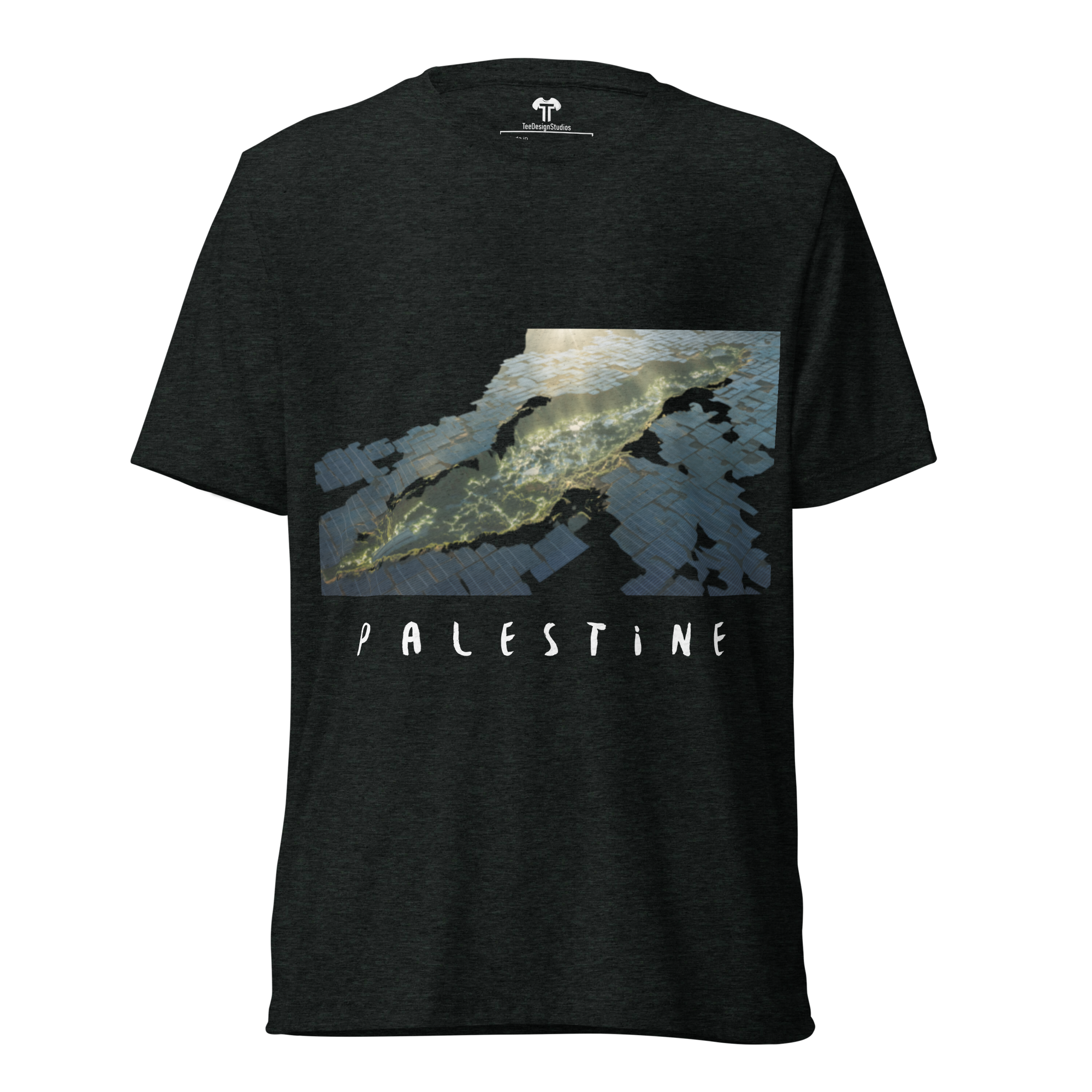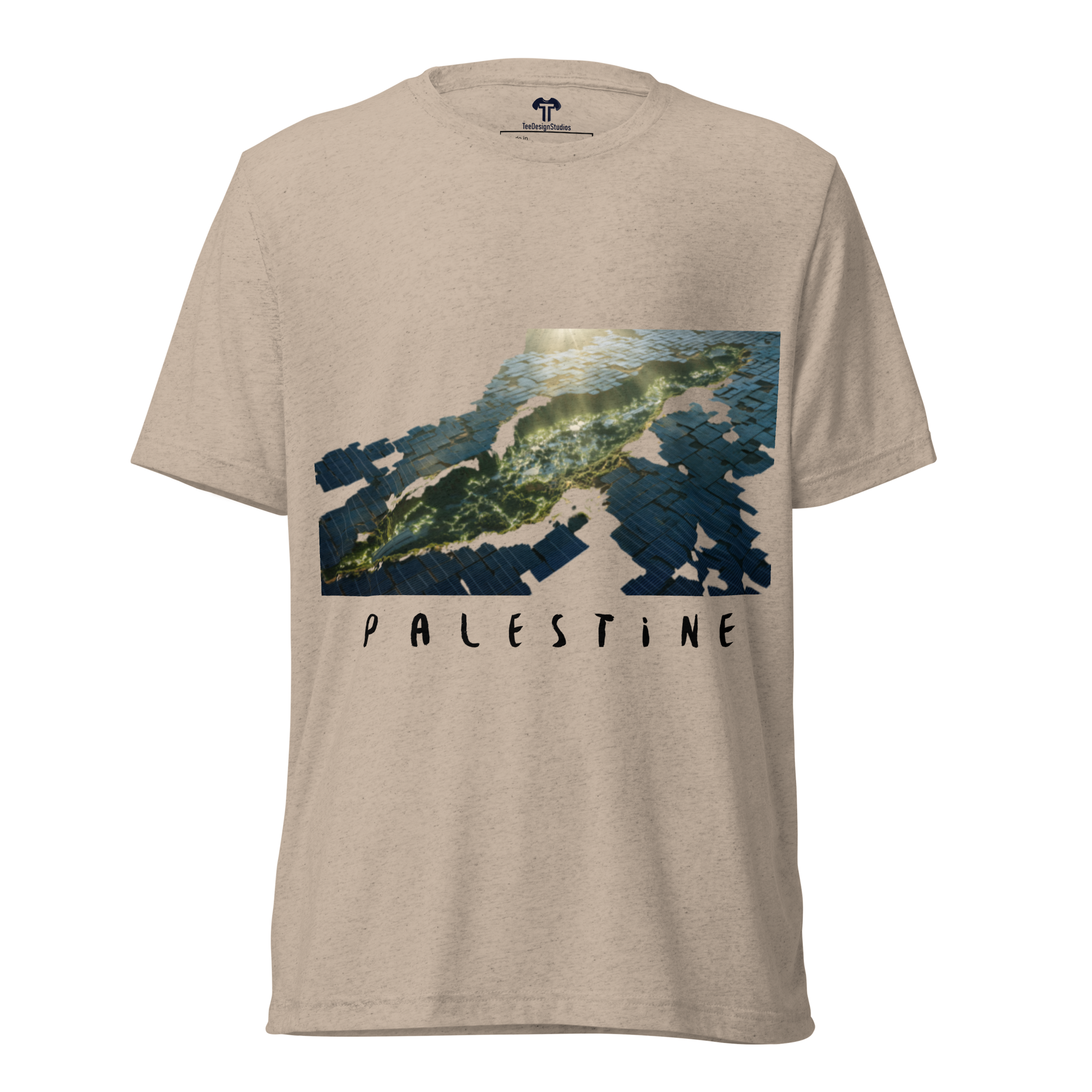 This short sleeve t-shirt features tri-blend fabric for a vintage, fitted look and long-lasting comfort through many washes. The design shows a solar panel farm shaped like the map of Palestine, with glowing light roots beneath revealing underground gardens and libraries.