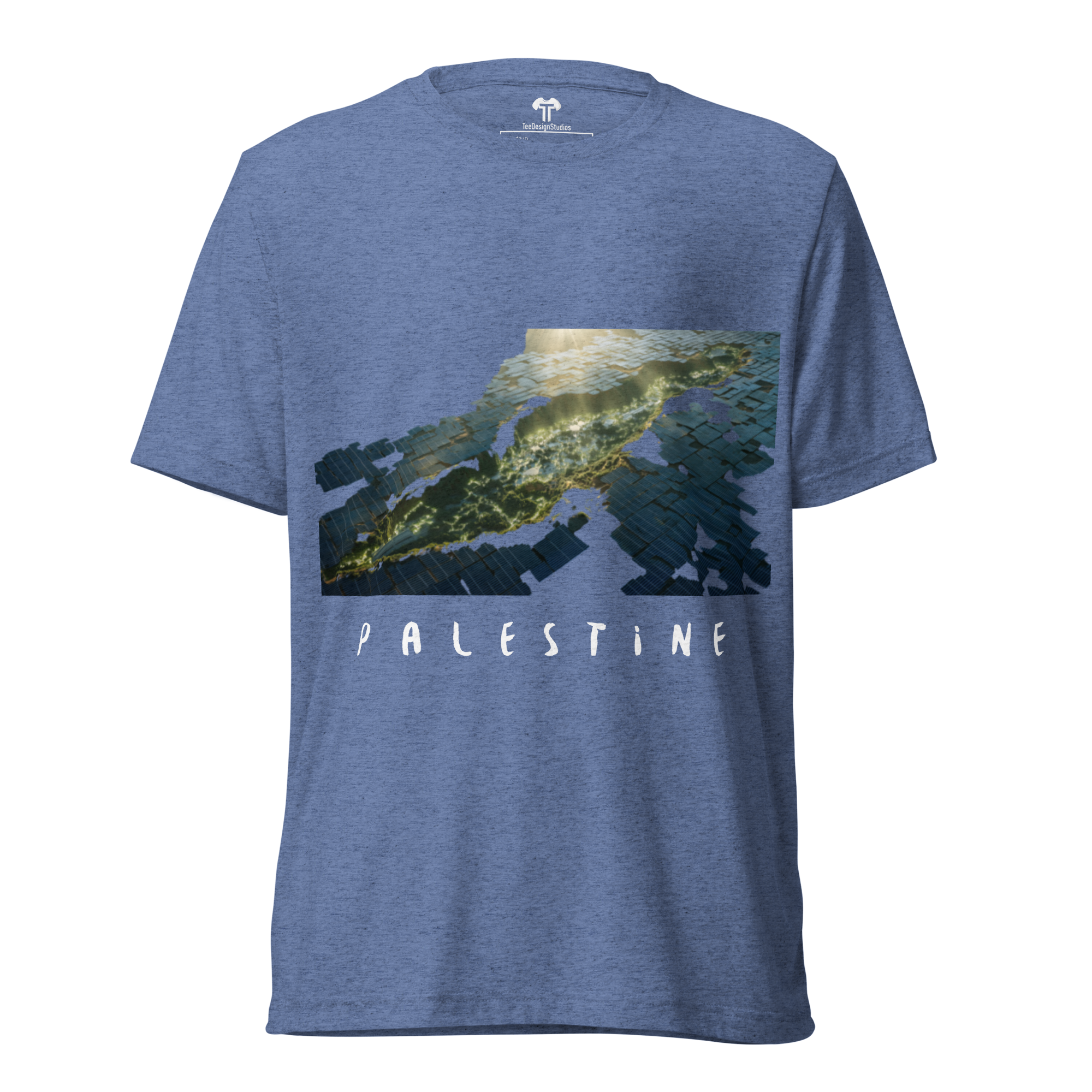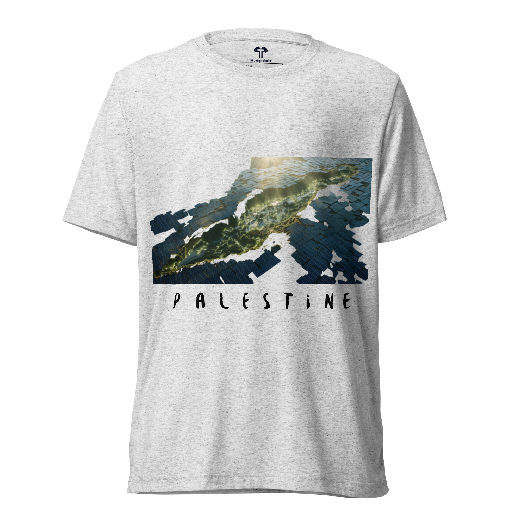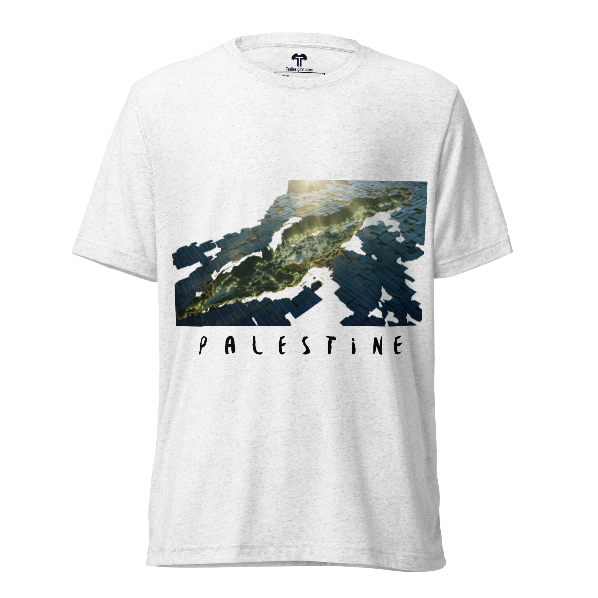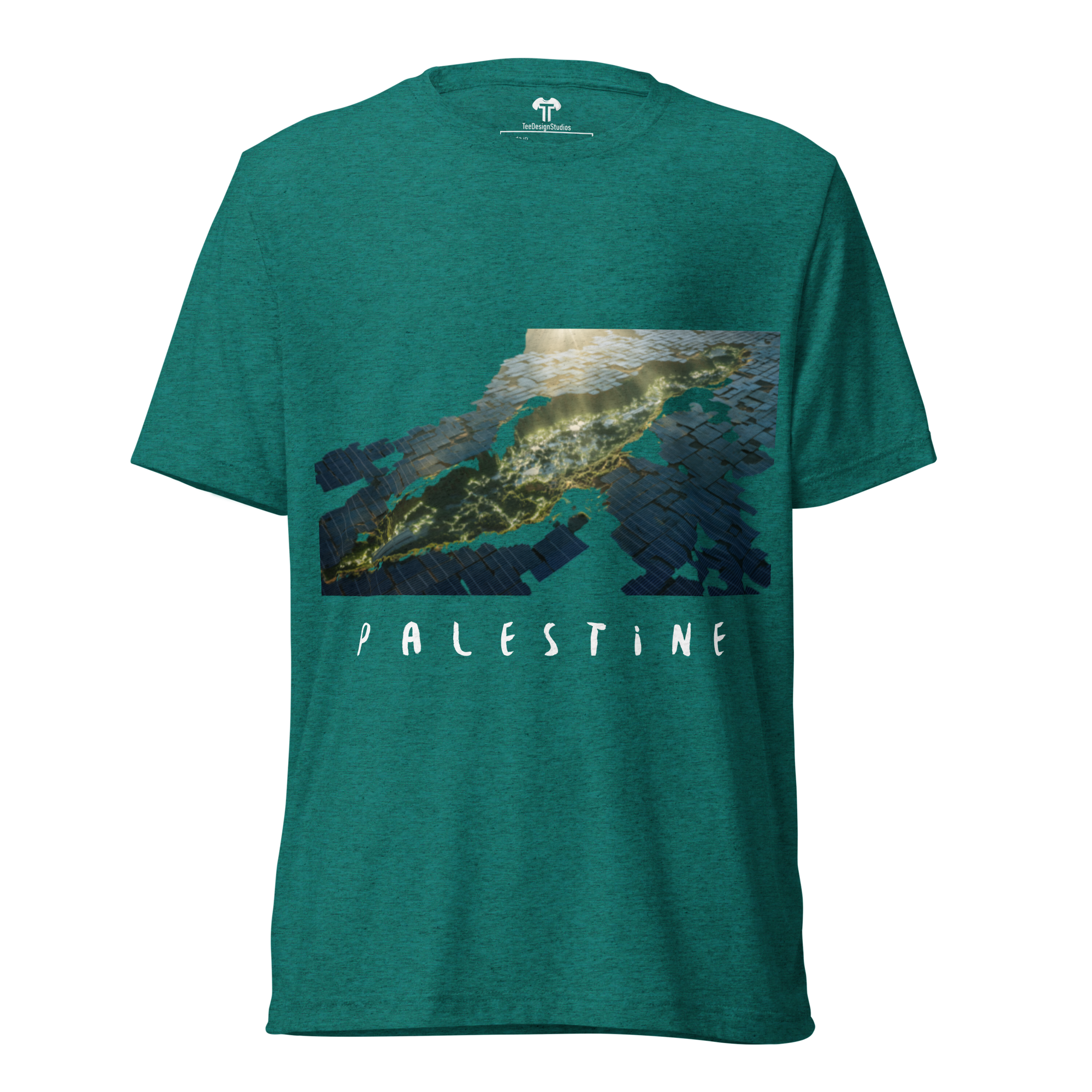 This short sleeve t-shirt features tri-blend fabric for a vintage, fitted look and long-lasting comfort through many washes. The design shows a solar panel farm shaped like the map of Palestine, with glowing light roots beneath revealing underground gardens and libraries.