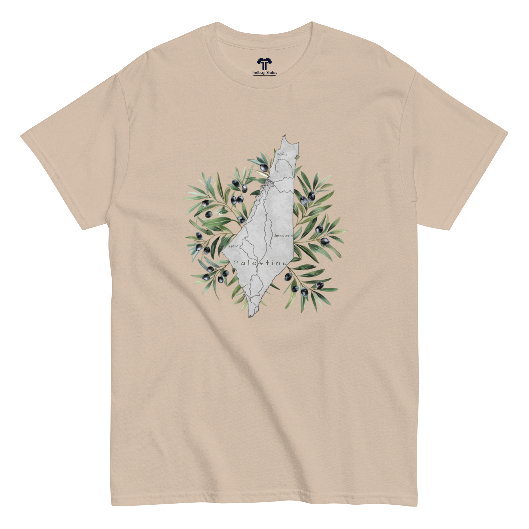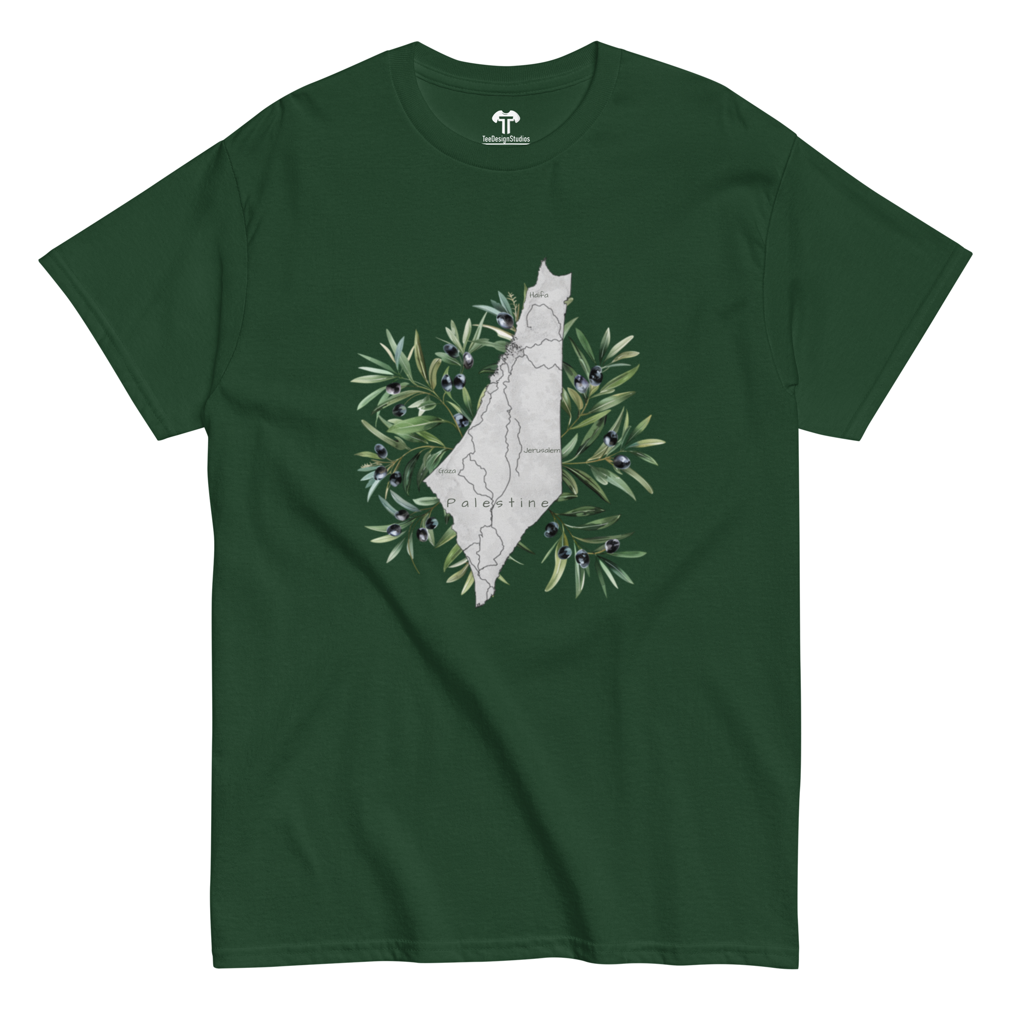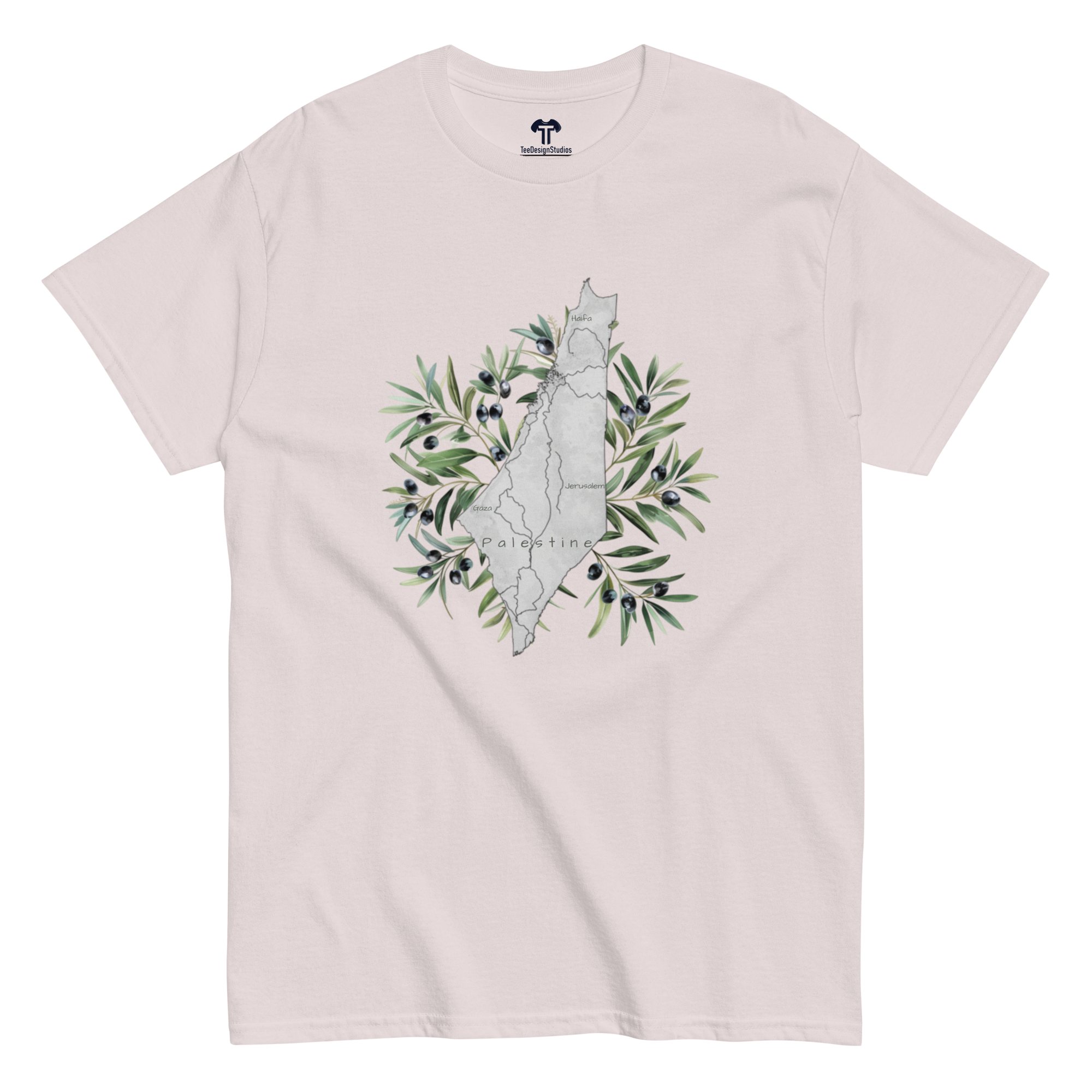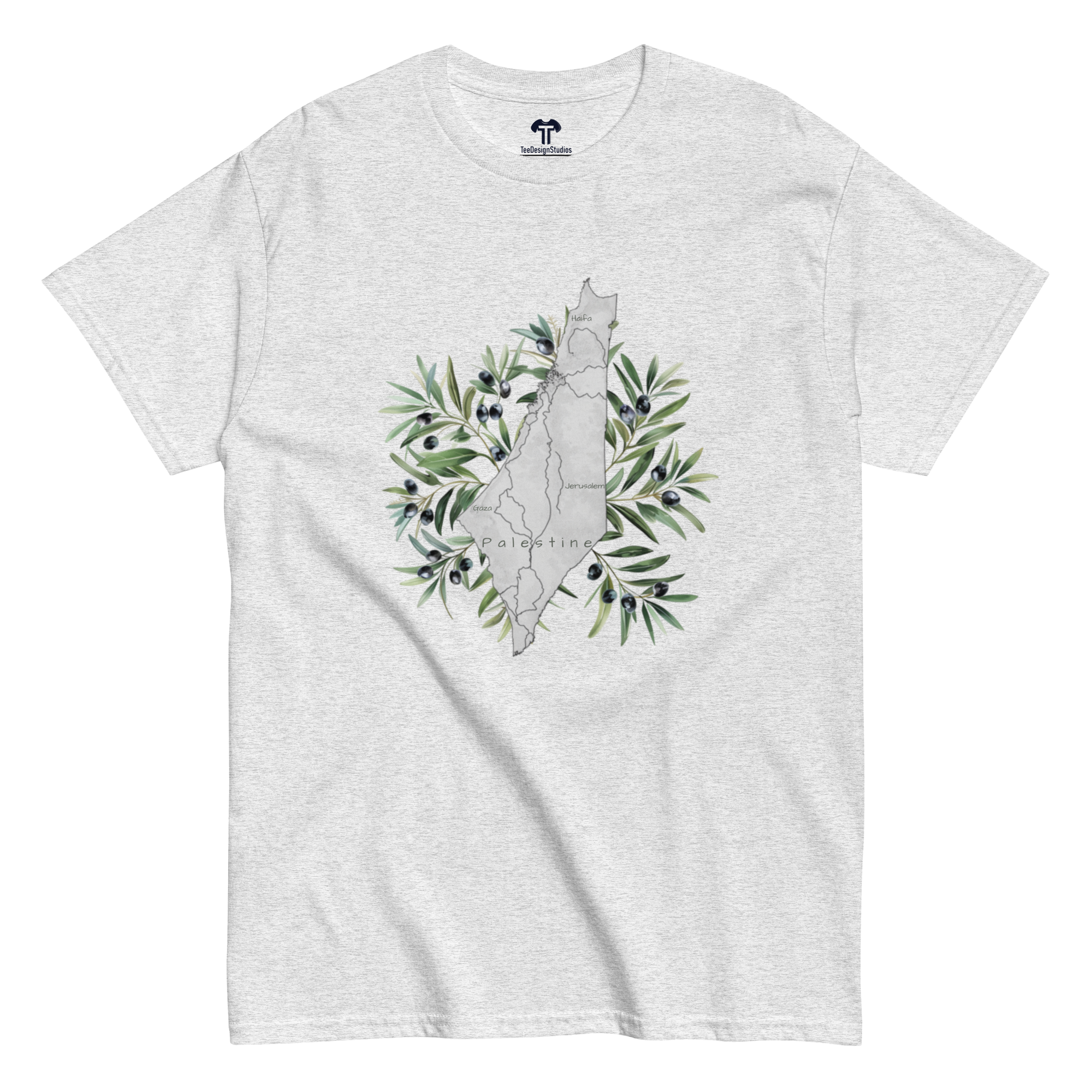 Crafted from 100% cotton, this unisex classic tee offers a structured fit that enhances your silhouette. It maintains crisp edges and pairs seamlessly with layered streetwear styles, making it a fashionable staple. The shirt features a botanical watercolor design of olive branches with detailed green leaves and black olives arranged in a radial pattern, complemented by a clean outline of the map of Palestine for a minimalist, modern geographic aesthetic.