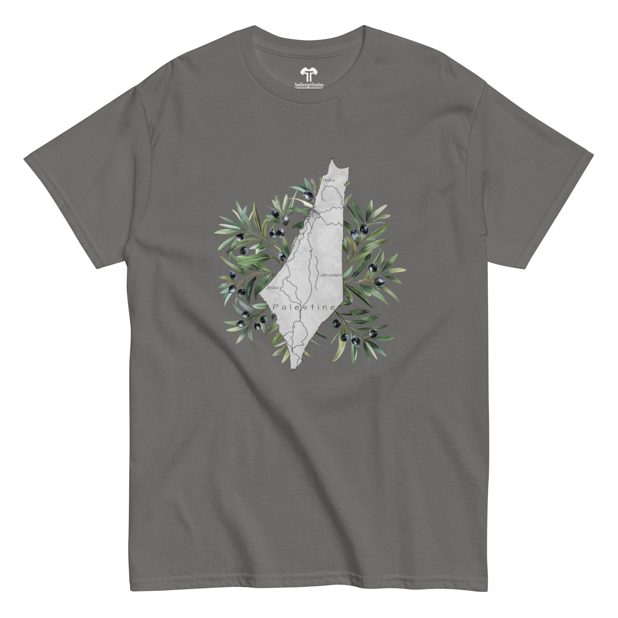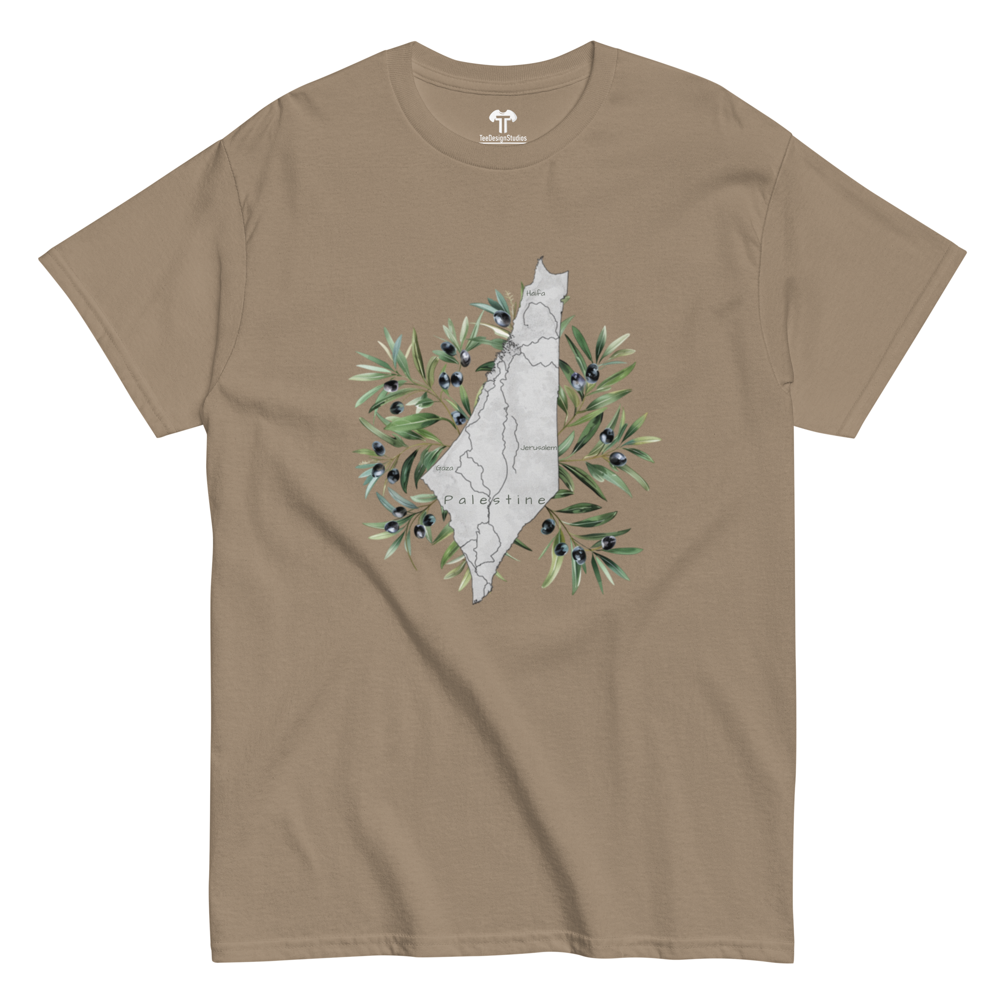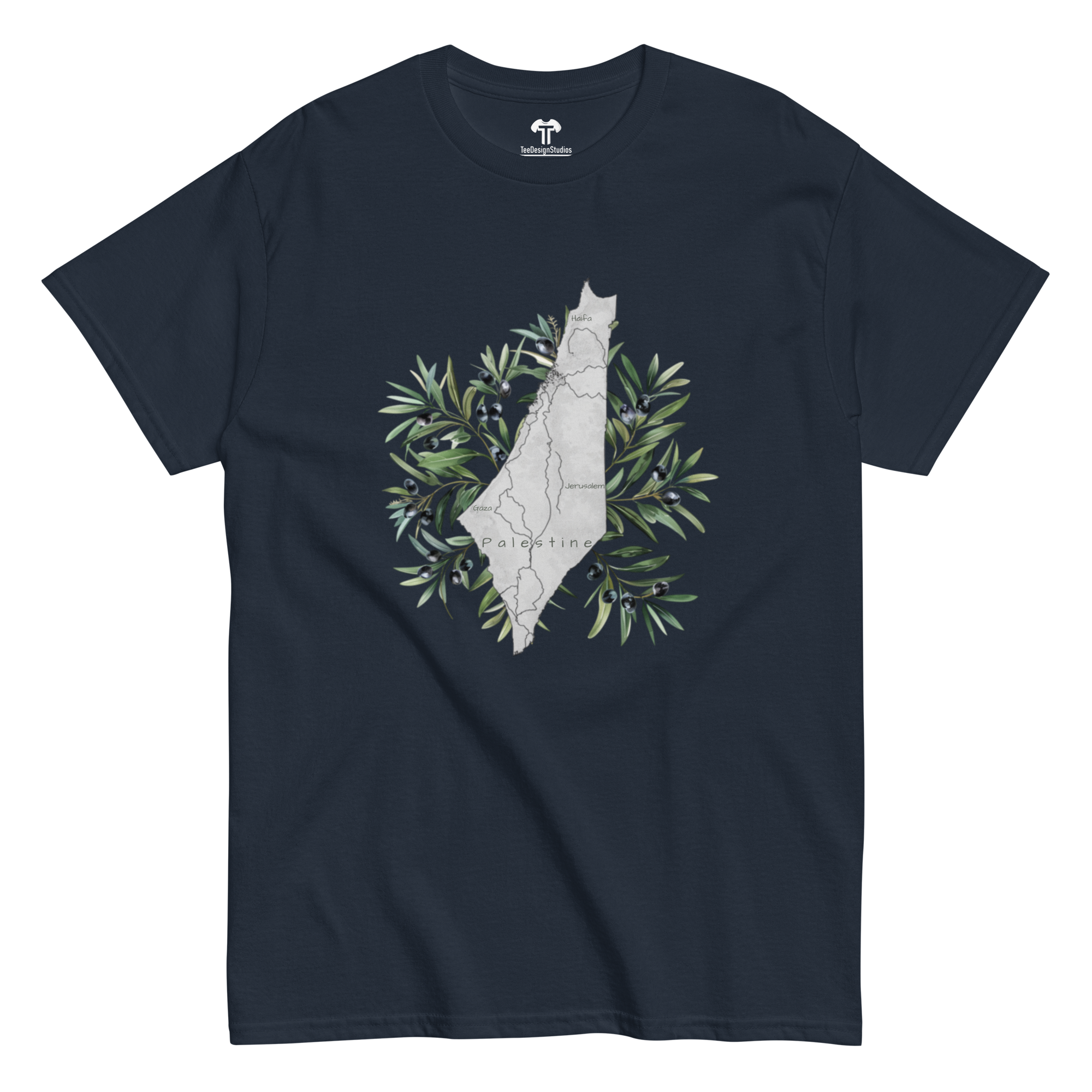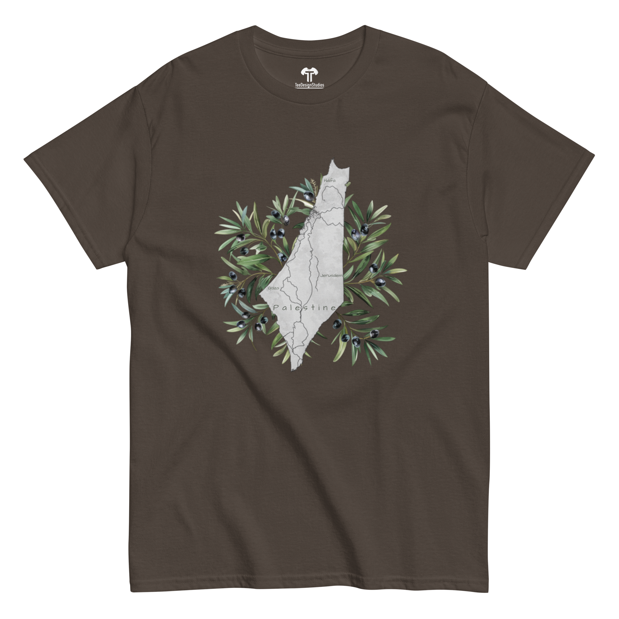 Crafted from 100% cotton, this unisex classic tee offers a structured fit that enhances your silhouette. It maintains crisp edges and pairs seamlessly with layered streetwear styles, making it a fashionable staple. The shirt features a botanical watercolor design of olive branches with detailed green leaves and black olives arranged in a radial pattern, complemented by a clean outline of the map of Palestine for a minimalist, modern geographic aesthetic.