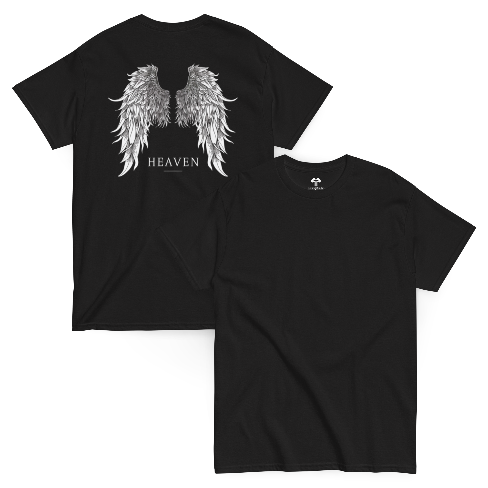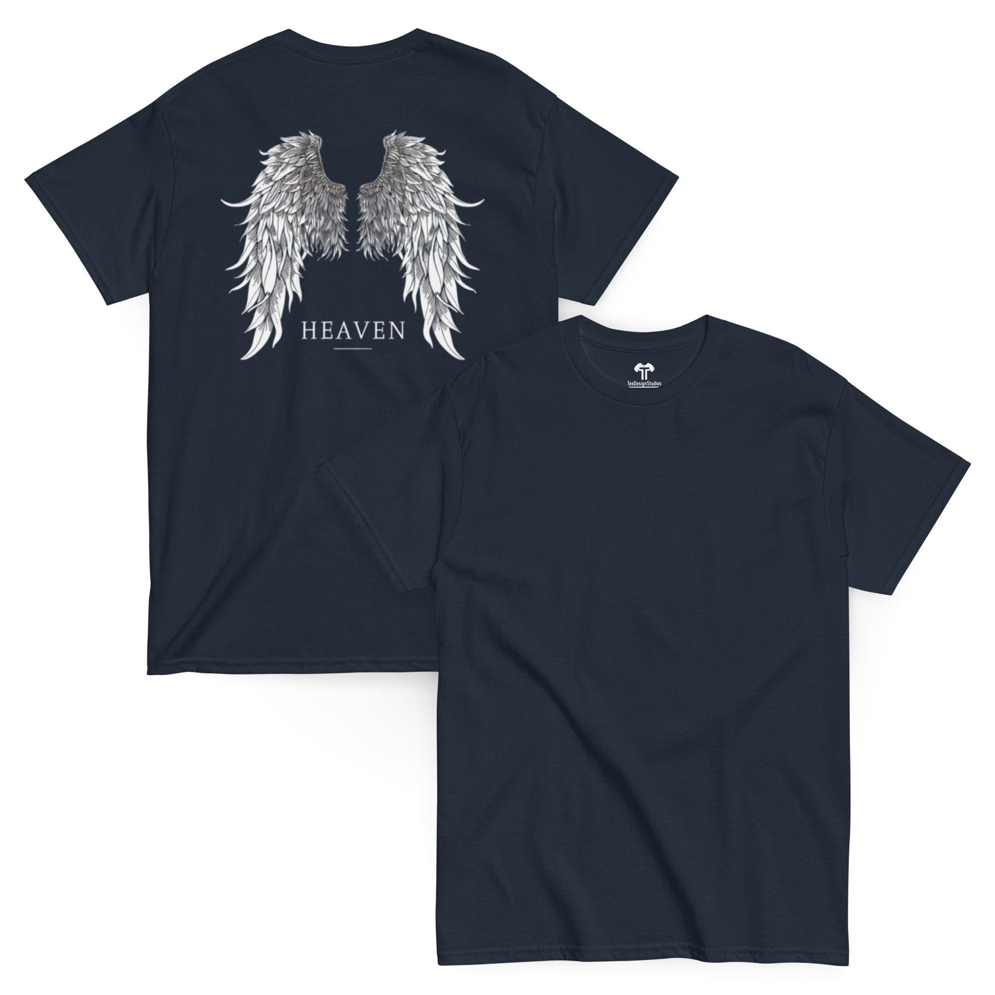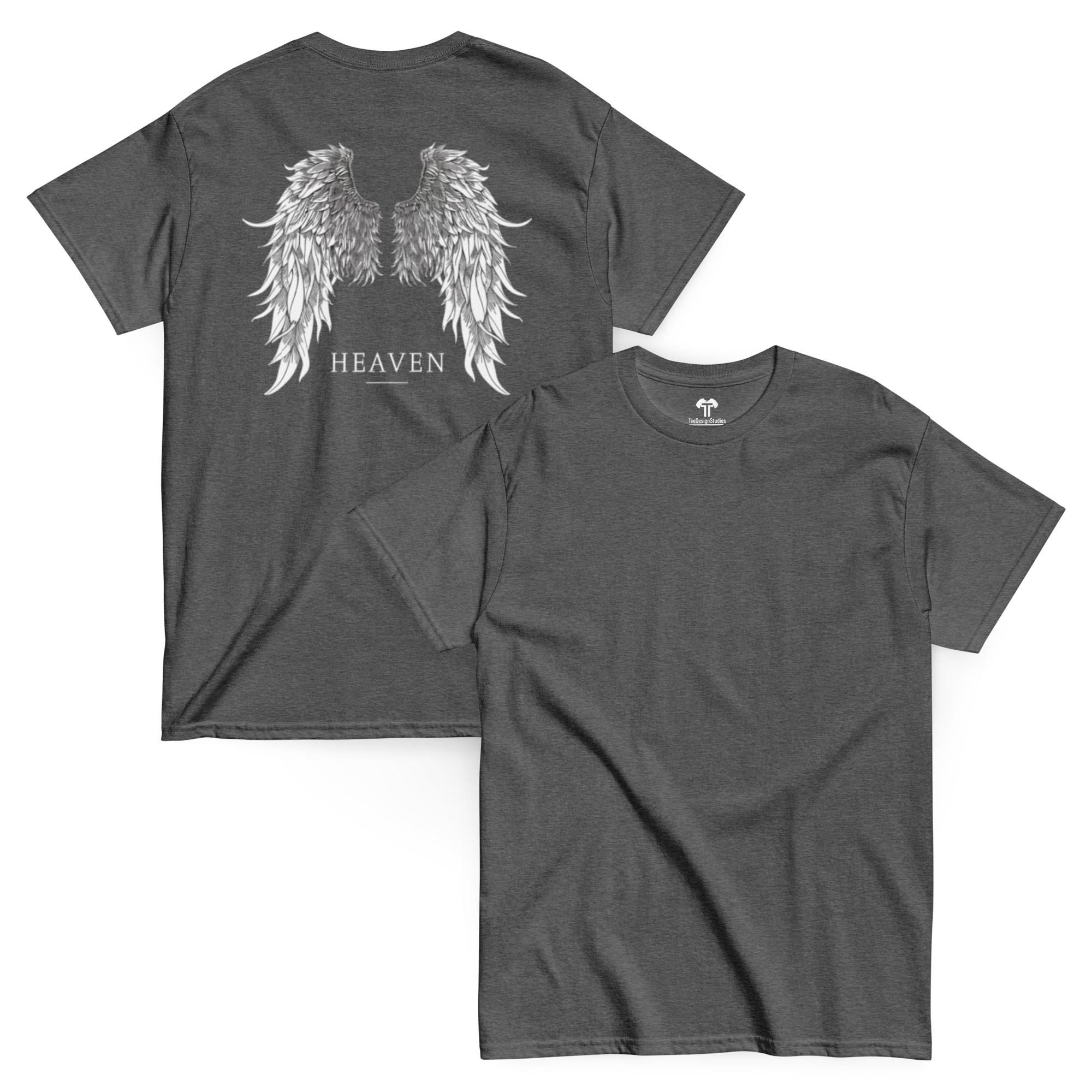 The 100% cotton unisex classic tee offers a clean, structured silhouette, holding crisp edges that complement layered streetwear styles. Its minimalist design features a single continuous line drawing of angel wings with the word "HEAVEN" in a delicate, thin font, embodying refined minimalism with modern appeal.