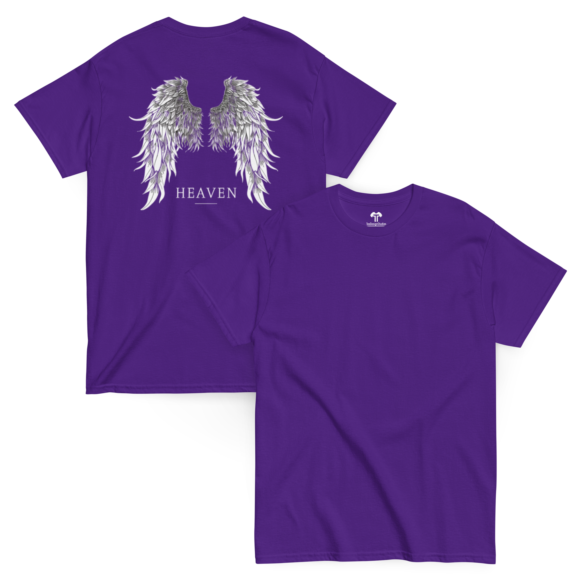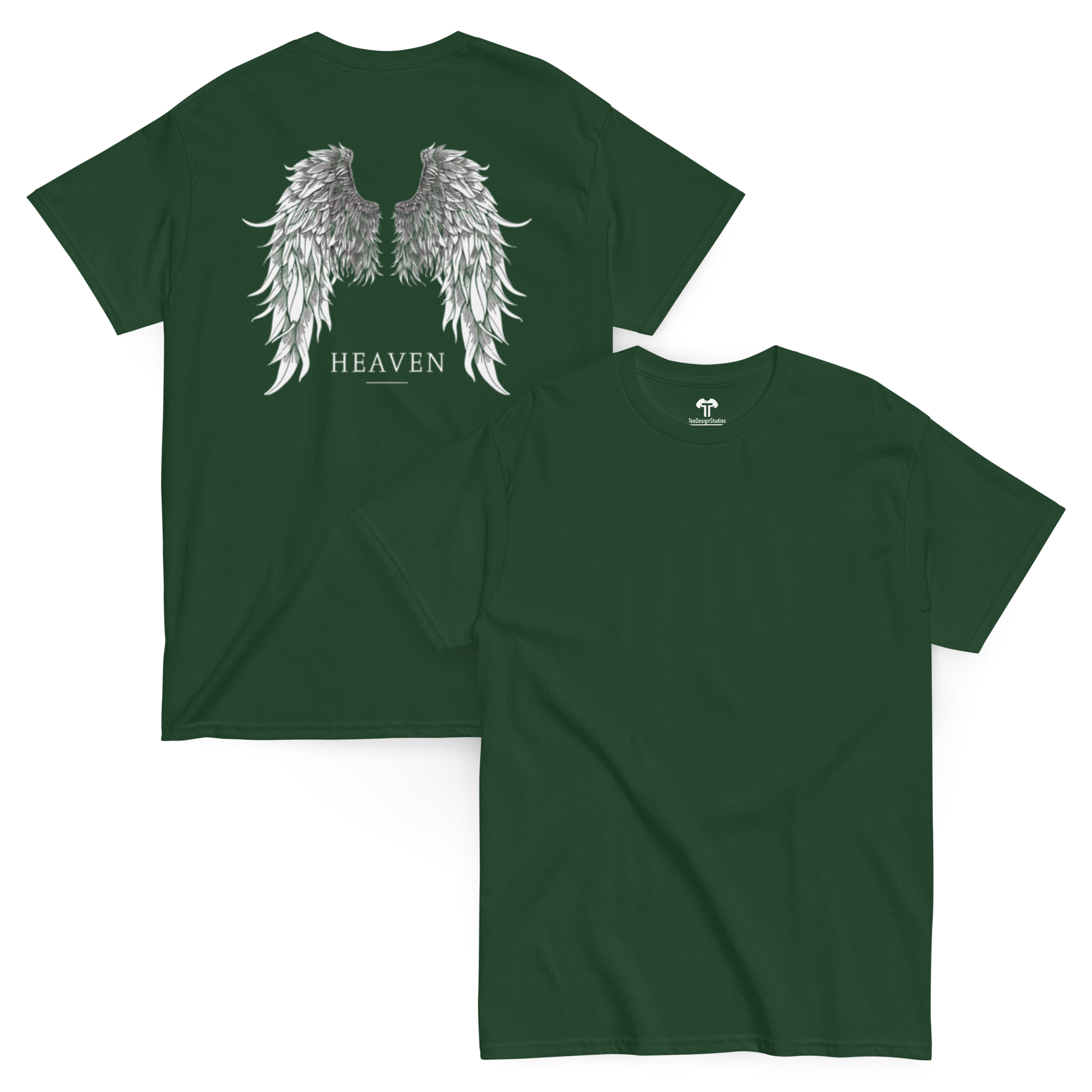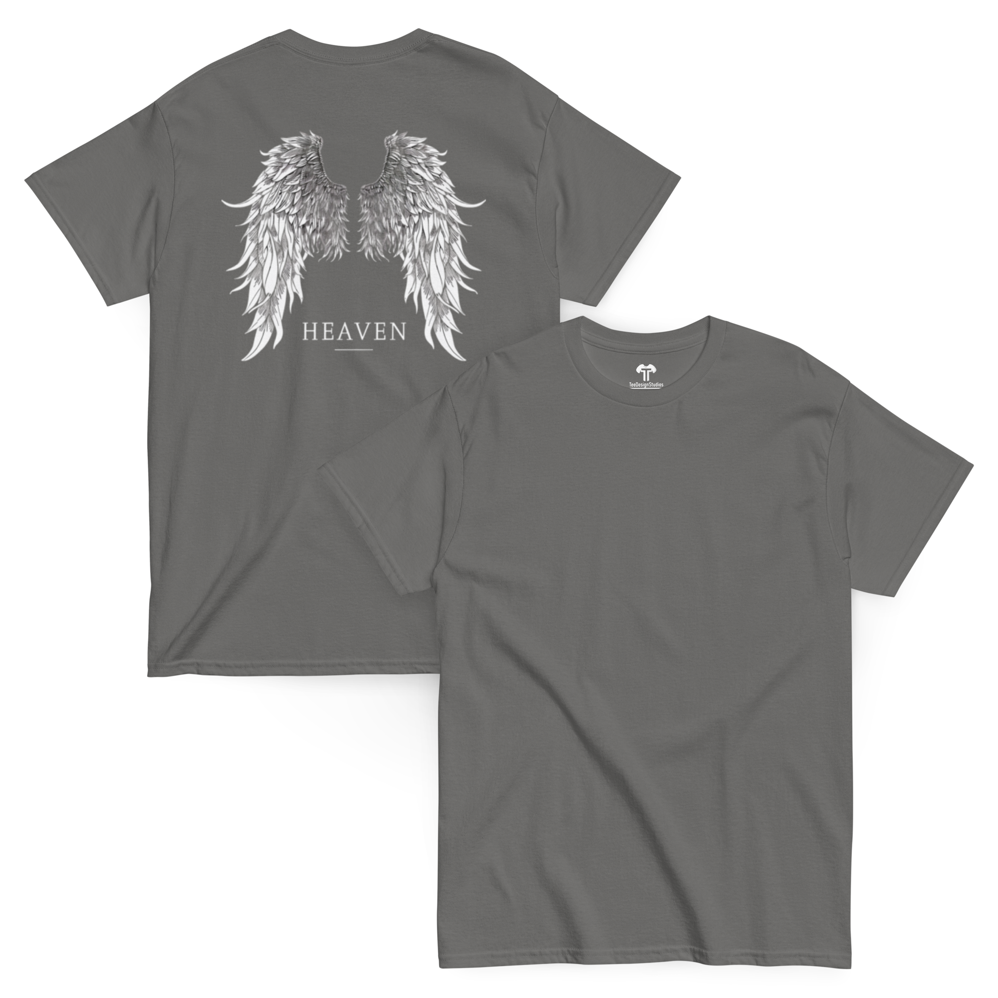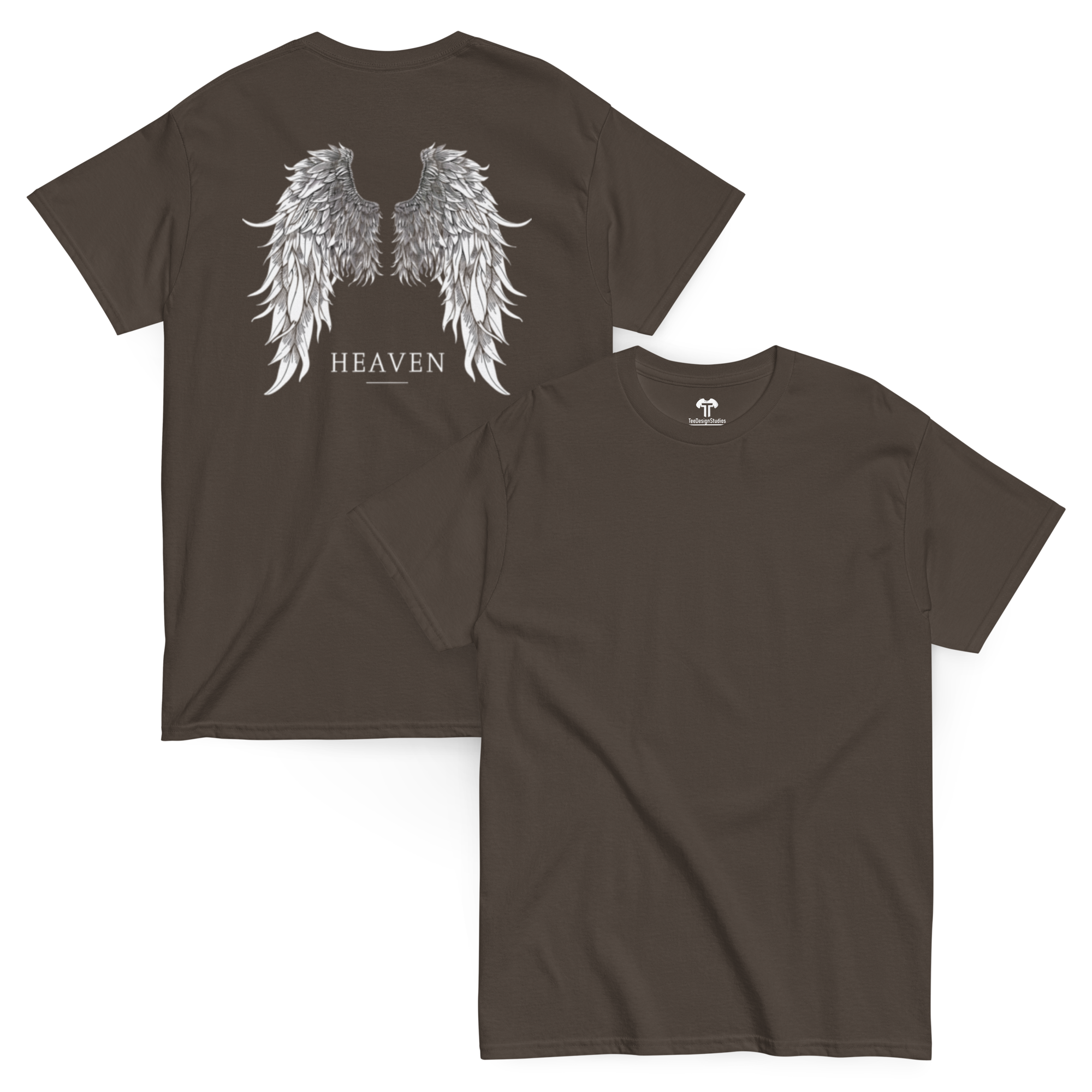 The 100% cotton unisex classic tee offers a clean, structured silhouette, holding crisp edges that complement layered streetwear styles. Its minimalist design features a single continuous line drawing of angel wings with the word "HEAVEN" in a delicate, thin font, embodying refined minimalism with modern appeal.
