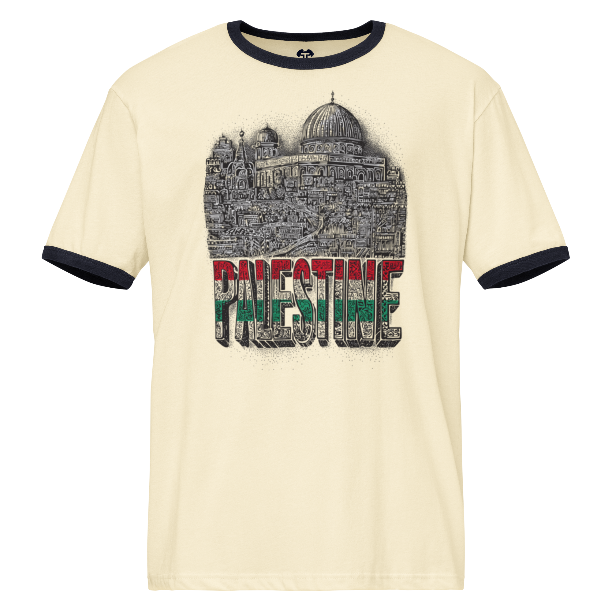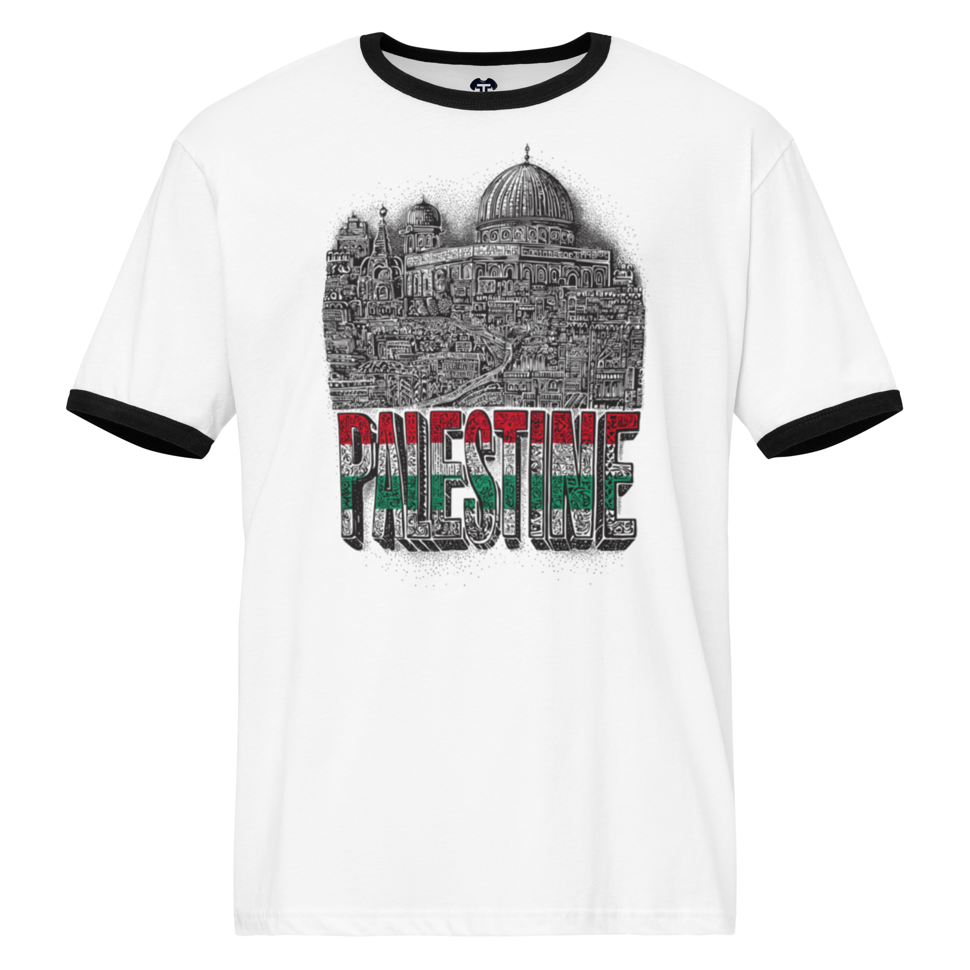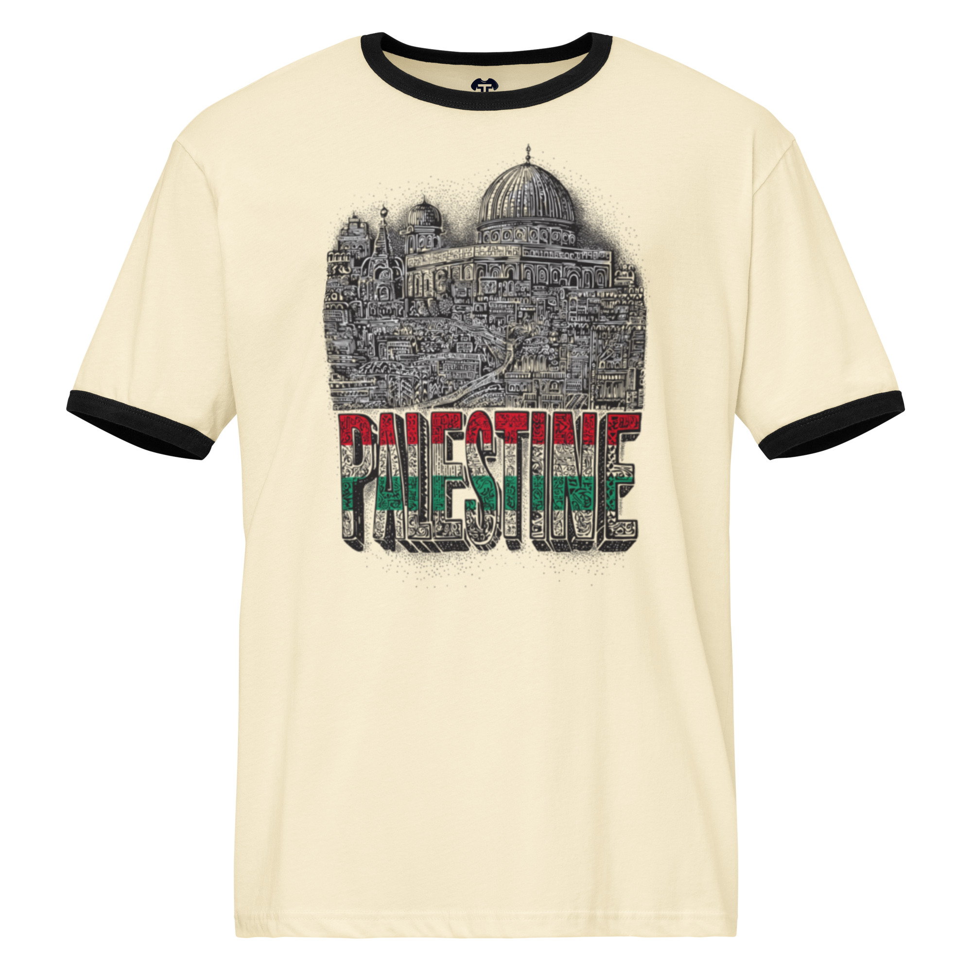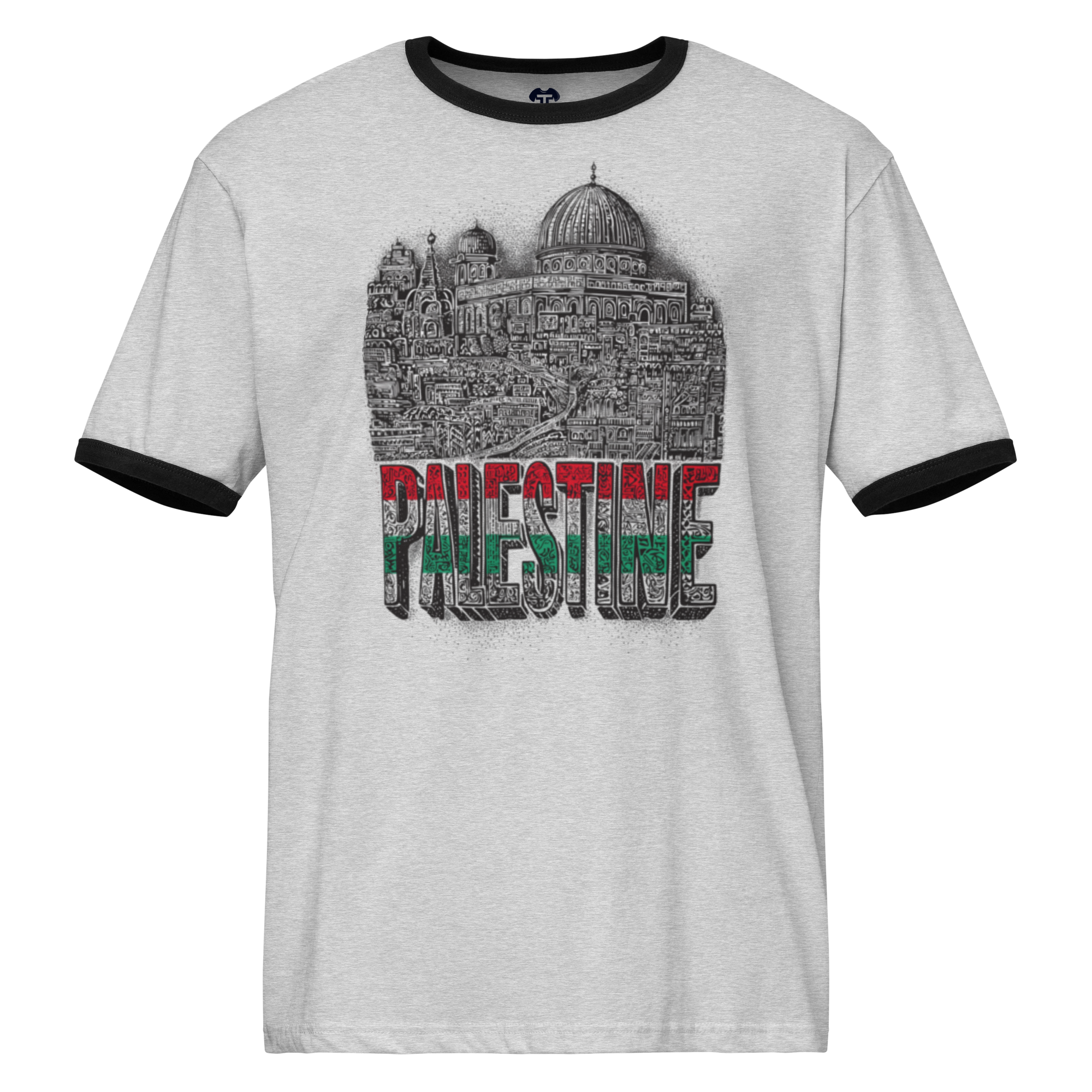 This lightweight cotton ringer t-shirt offers a relaxed fit complemented by contrasting trims for a classic retro appeal. Perfect for pairing with jeans, shorts, or joggers, it creates a comfortable and casual everyday look. The design showcases the word PALESTINE in three colors, with the city of Palestine displayed above, embodying a detailed and symbolic representation of unity in diversity.