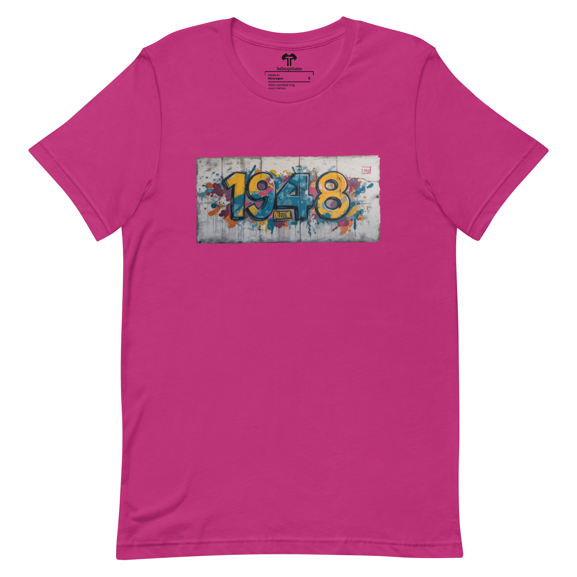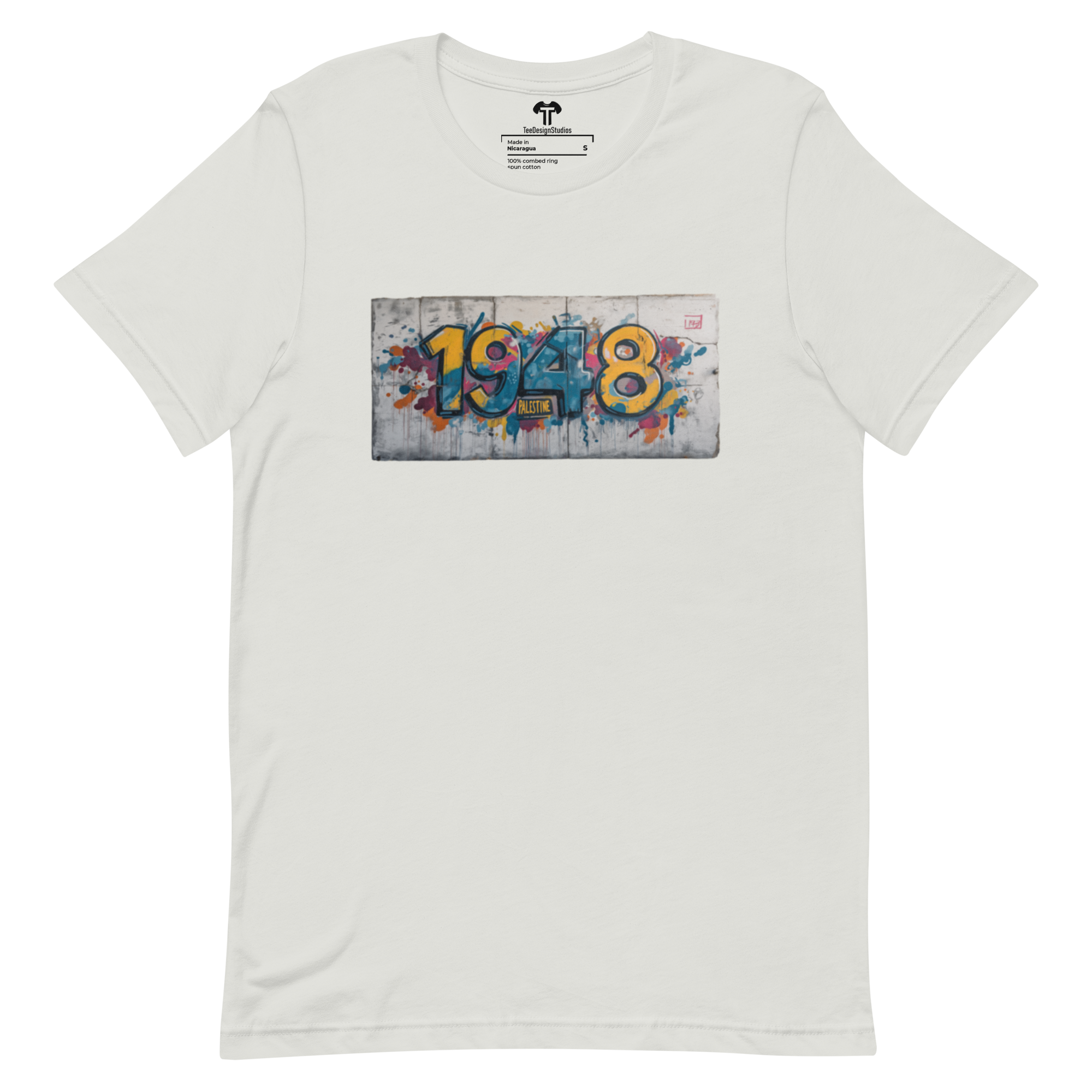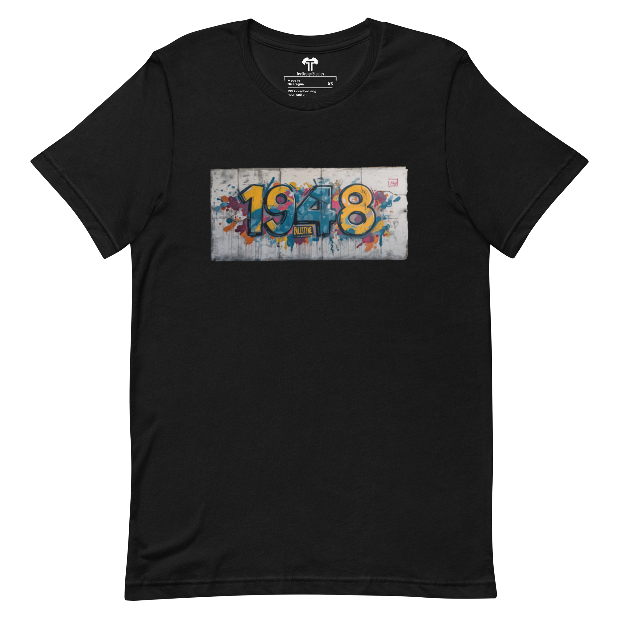 This t-shirt combines softness and lightness with a perfect stretch, offering comfort and a flattering fit for everyone. It showcases a bold graffiti mural-inspired design featuring "1948 PALESTINE" in bubble letters with spray paint drips, embodying the raw energy and authentic street protest vibe of urban art.
