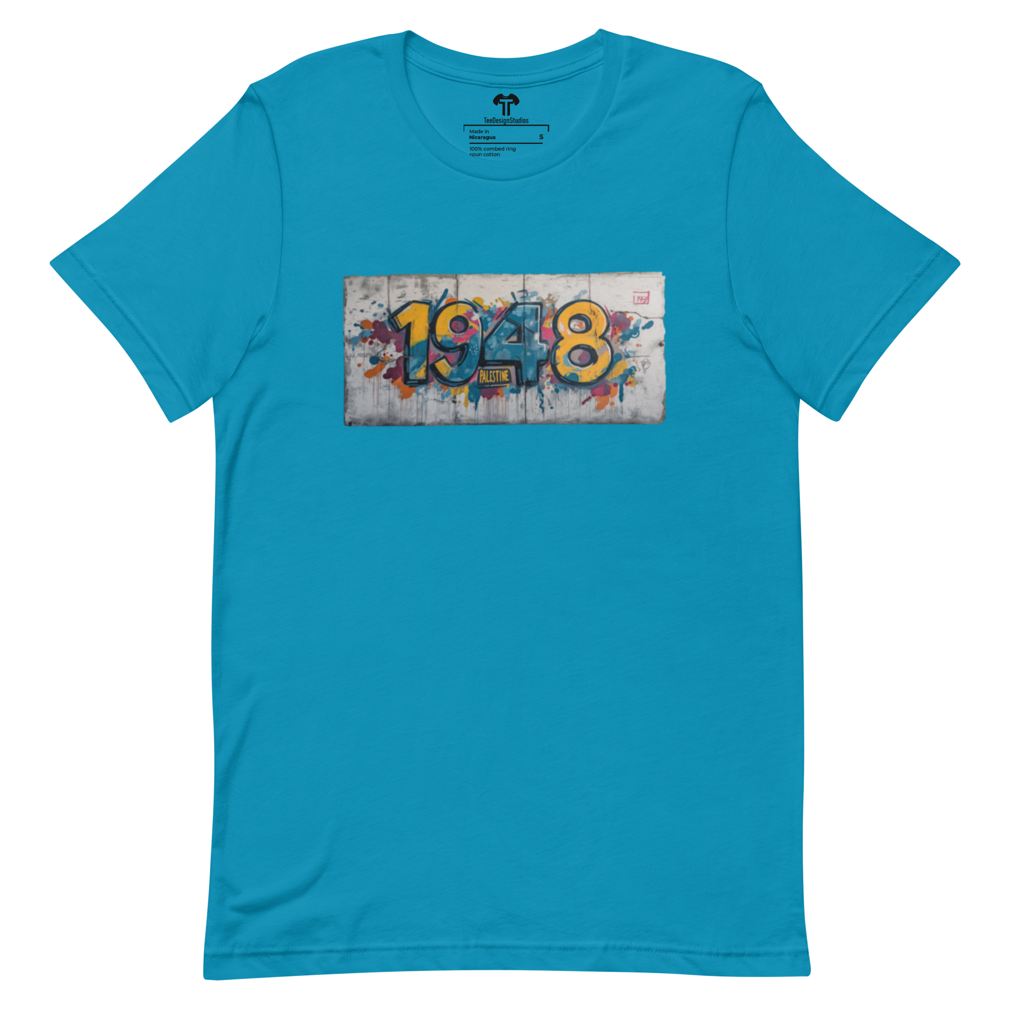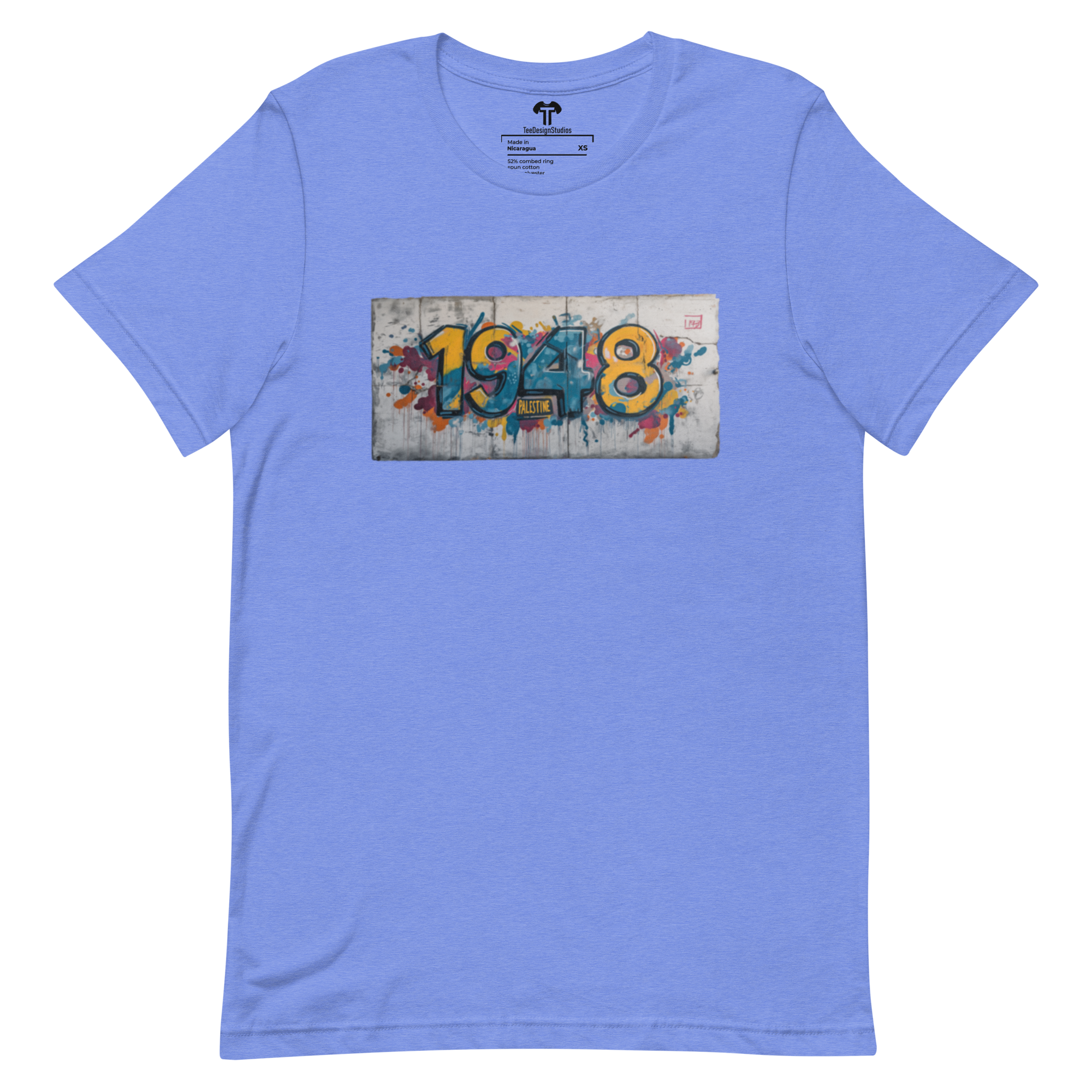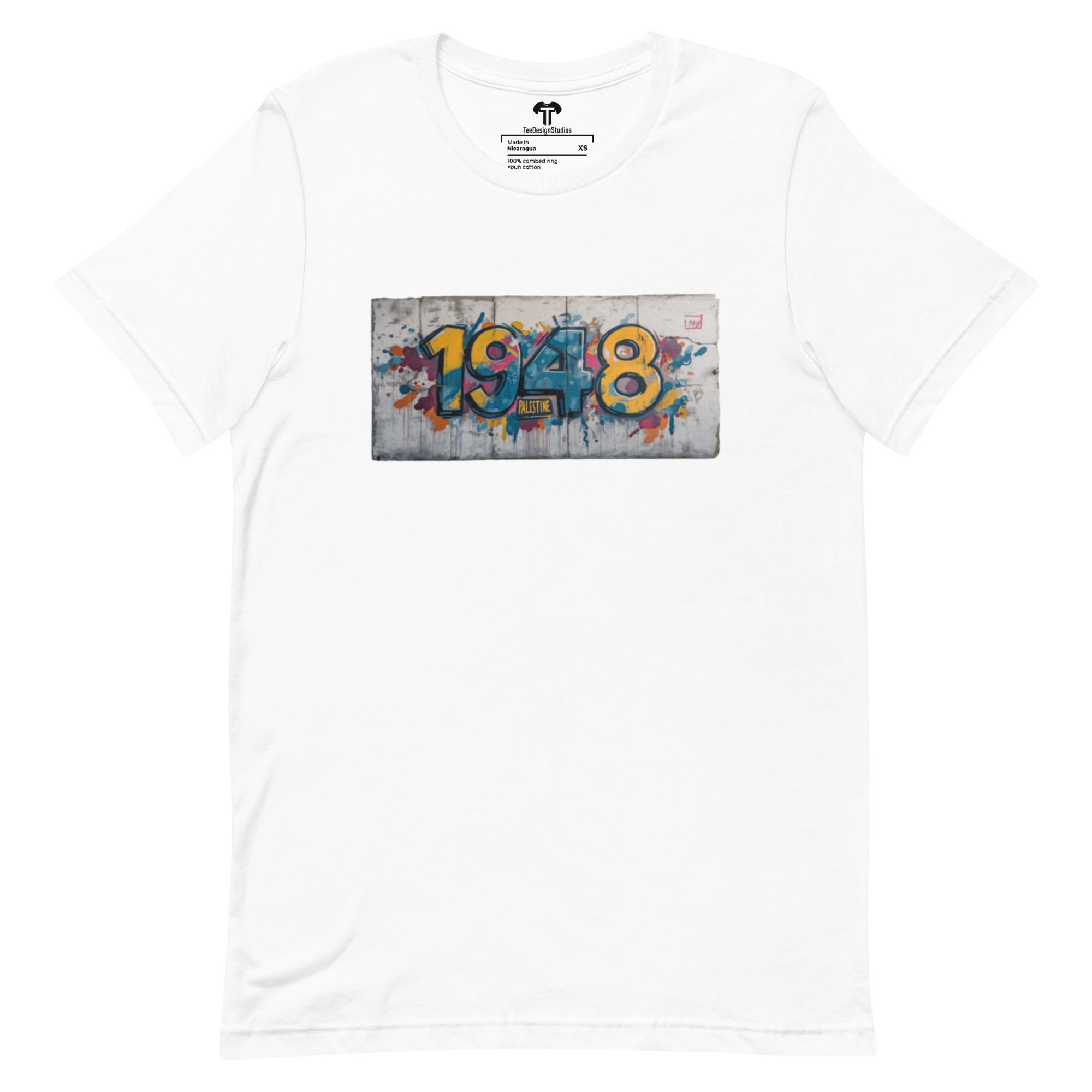This t-shirt combines softness and lightness with a perfect stretch, offering comfort and a flattering fit for everyone. It showcases a bold graffiti mural-inspired design featuring "1948 PALESTINE" in bubble letters with spray paint drips, embodying the raw energy and authentic street protest vibe of urban art.