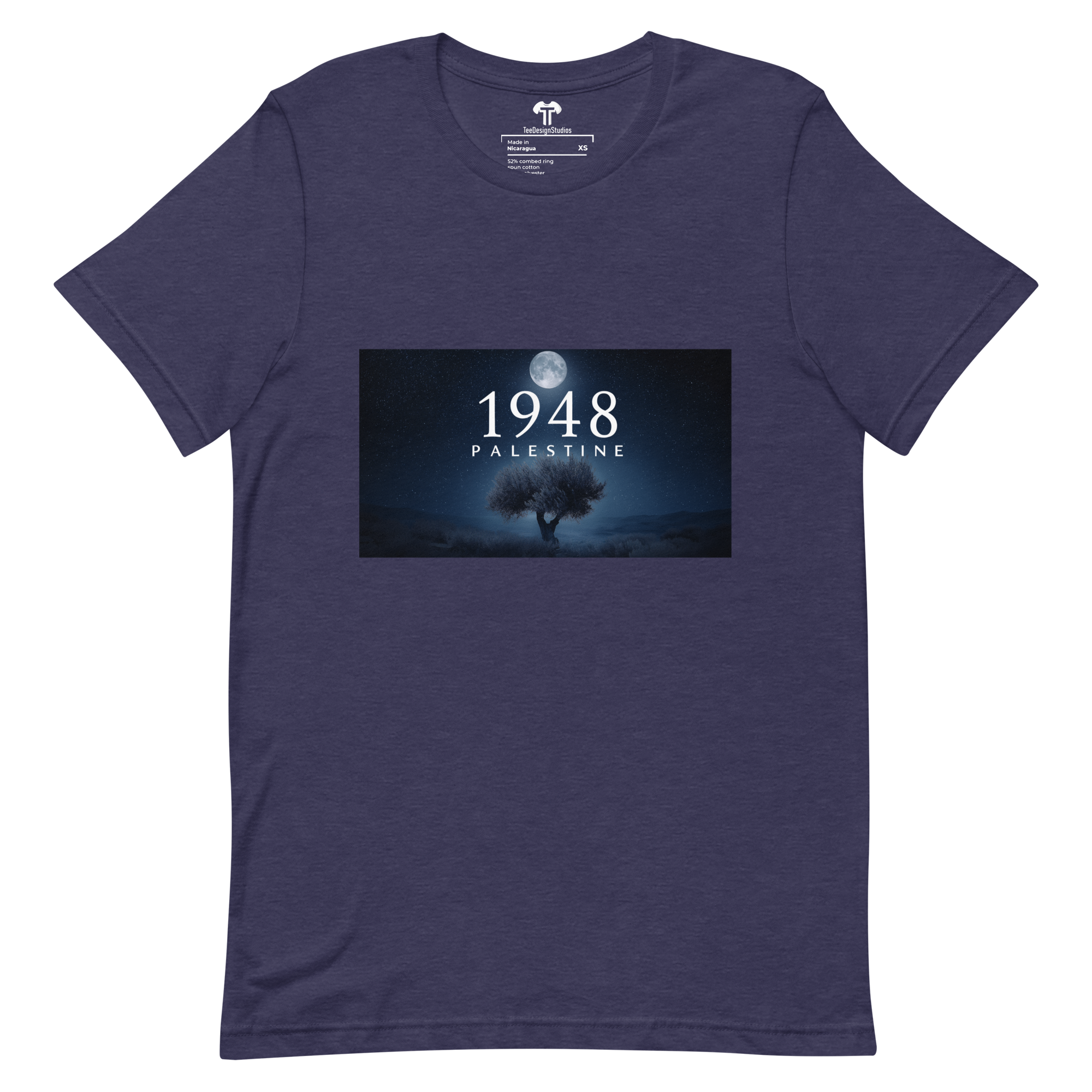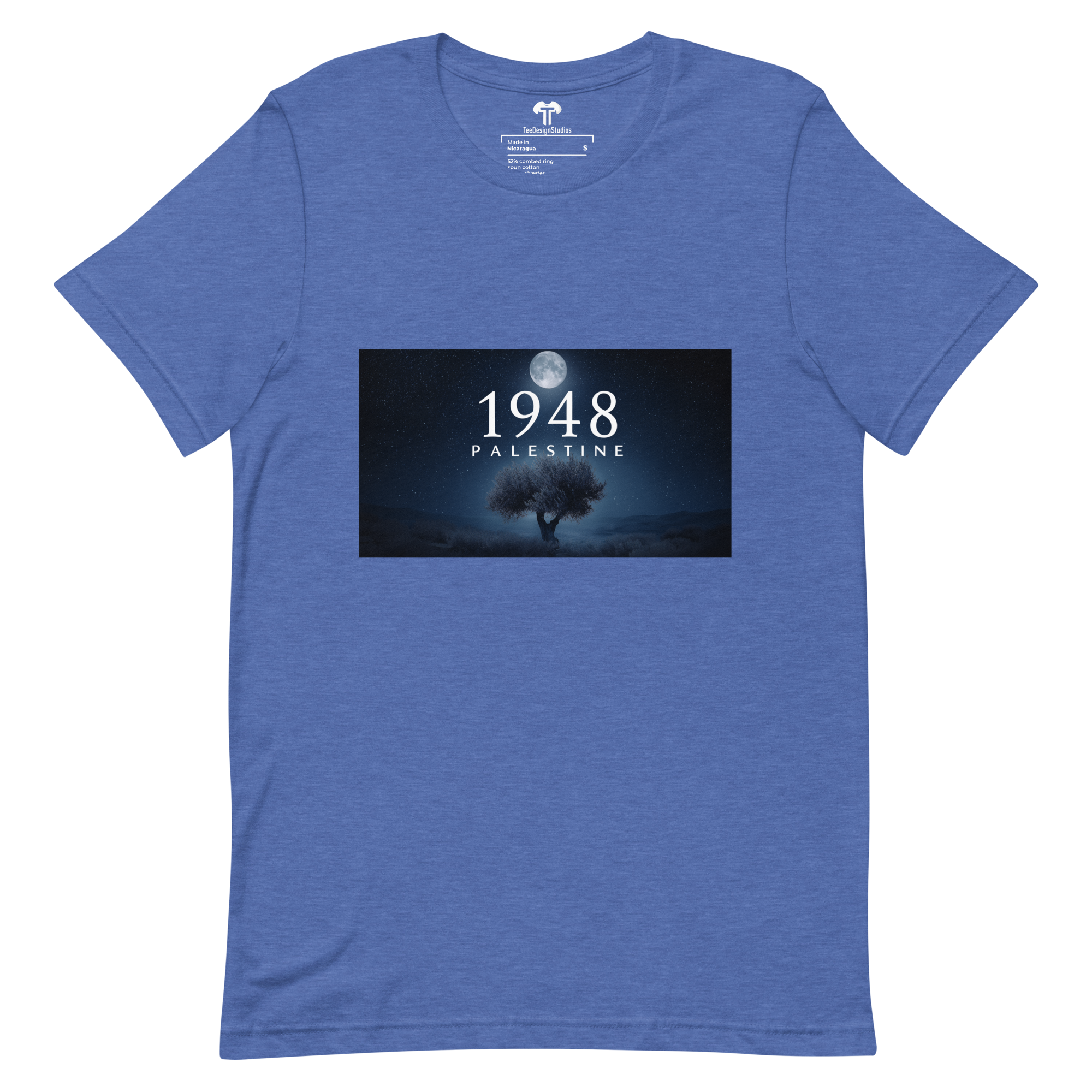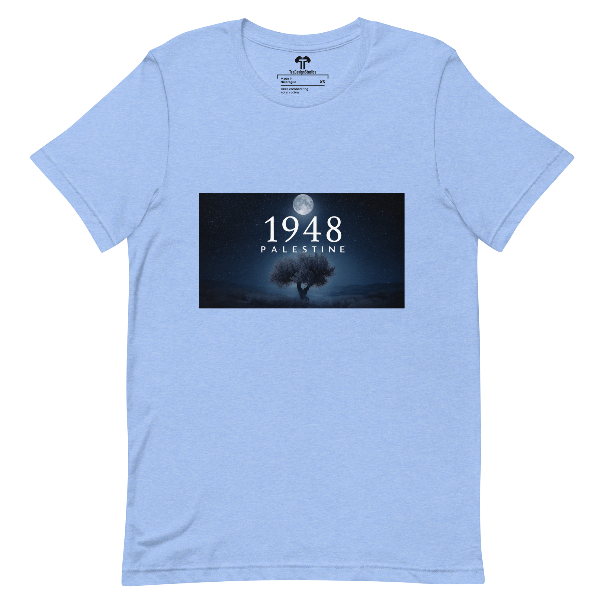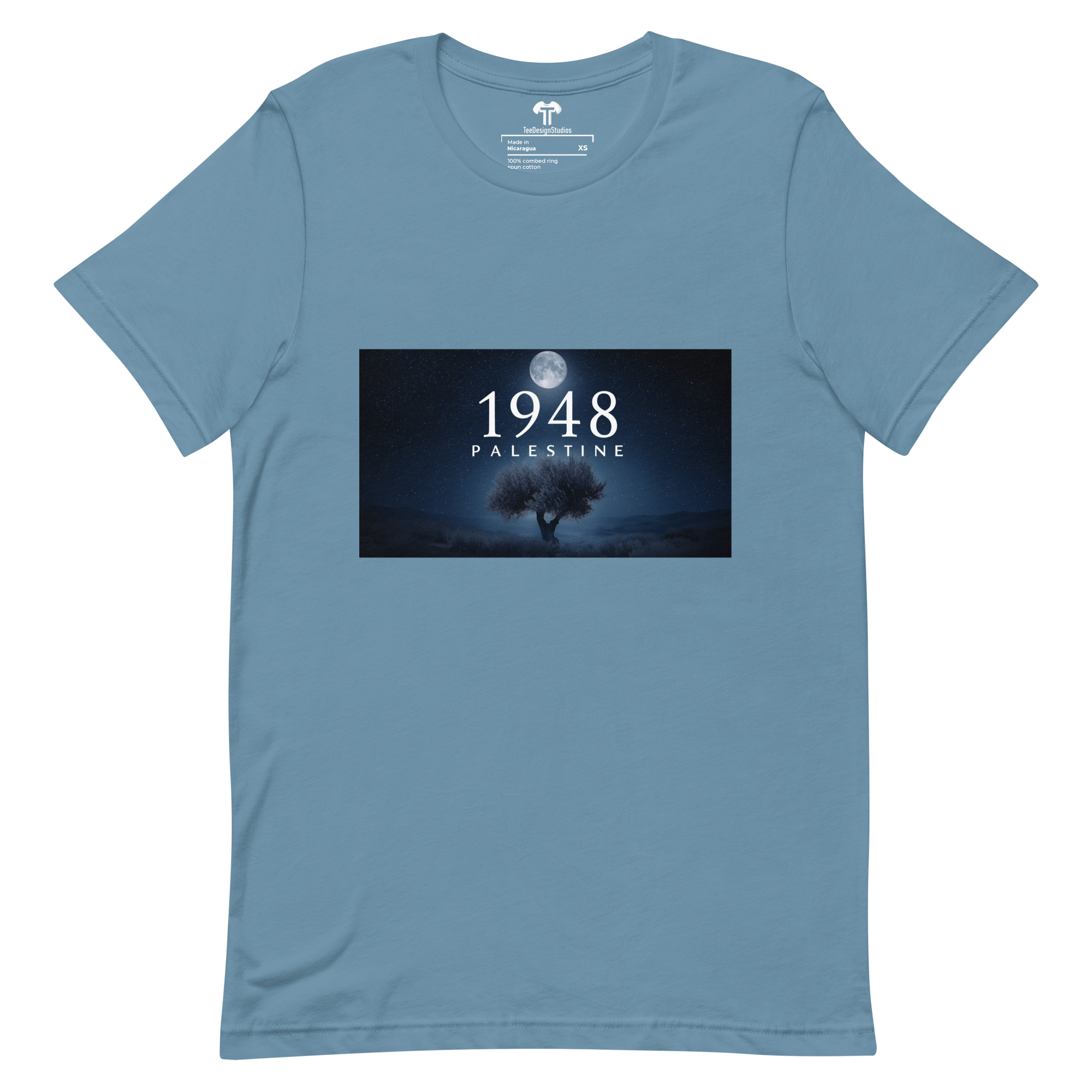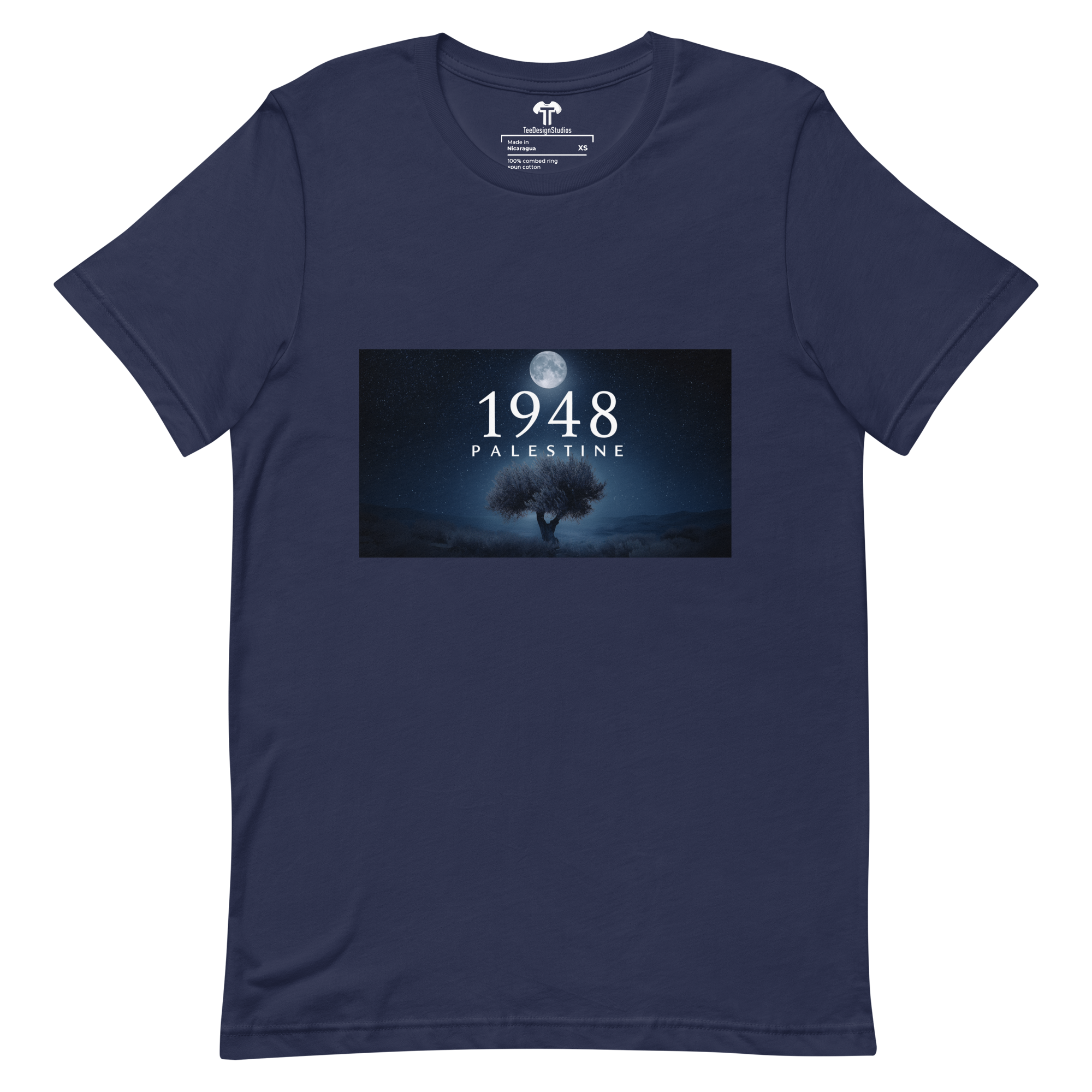 This t-shirt combines soft, lightweight fabric with just the right stretch for lasting comfort and a flattering fit for everyone. Its design features "1948 Palestine" as a silhouette set against a full moon in a starry night sky, with a solitary olive tree in the foreground. Rendered in monochromatic blue tones, the image evokes a serene yet powerful cinematic atmosphere.