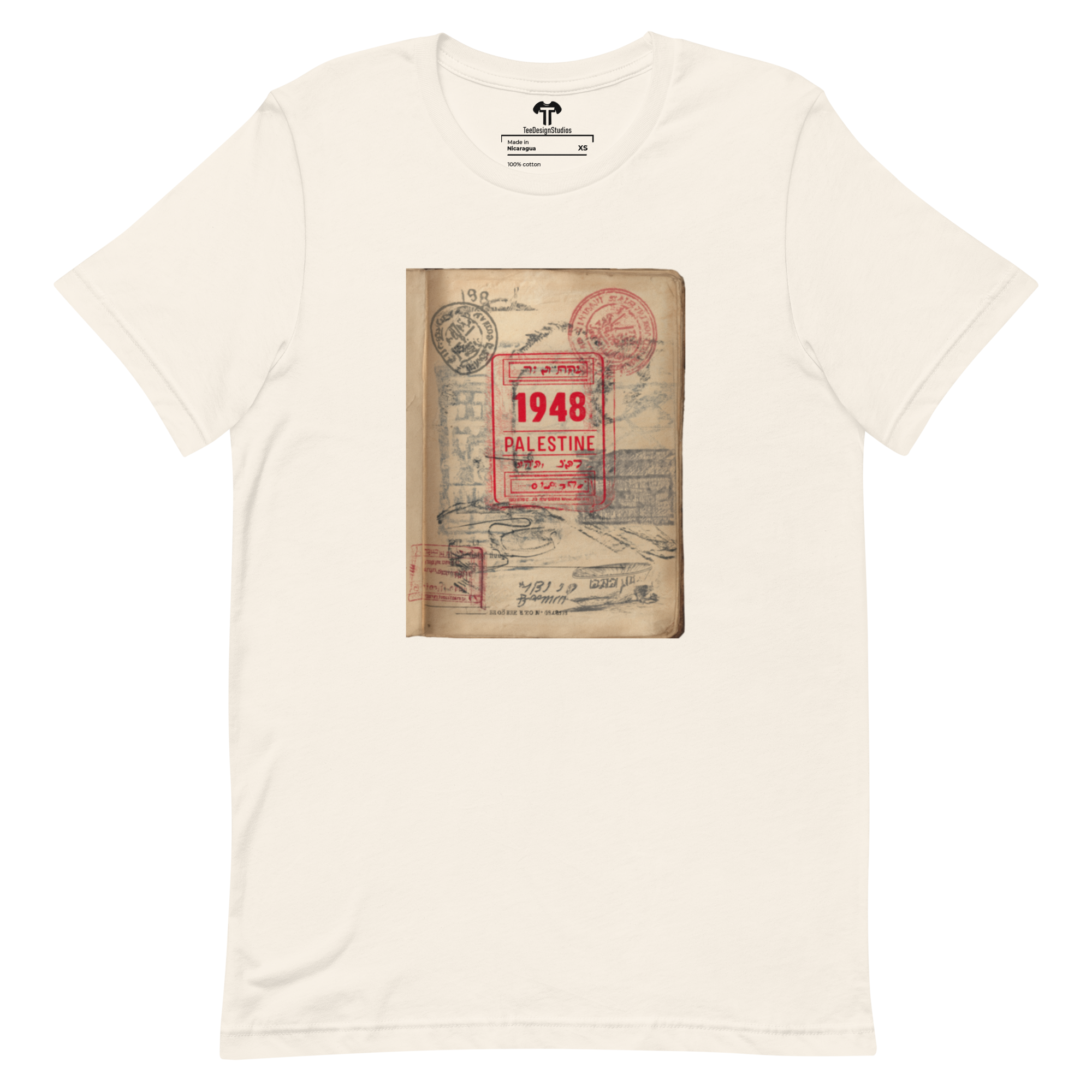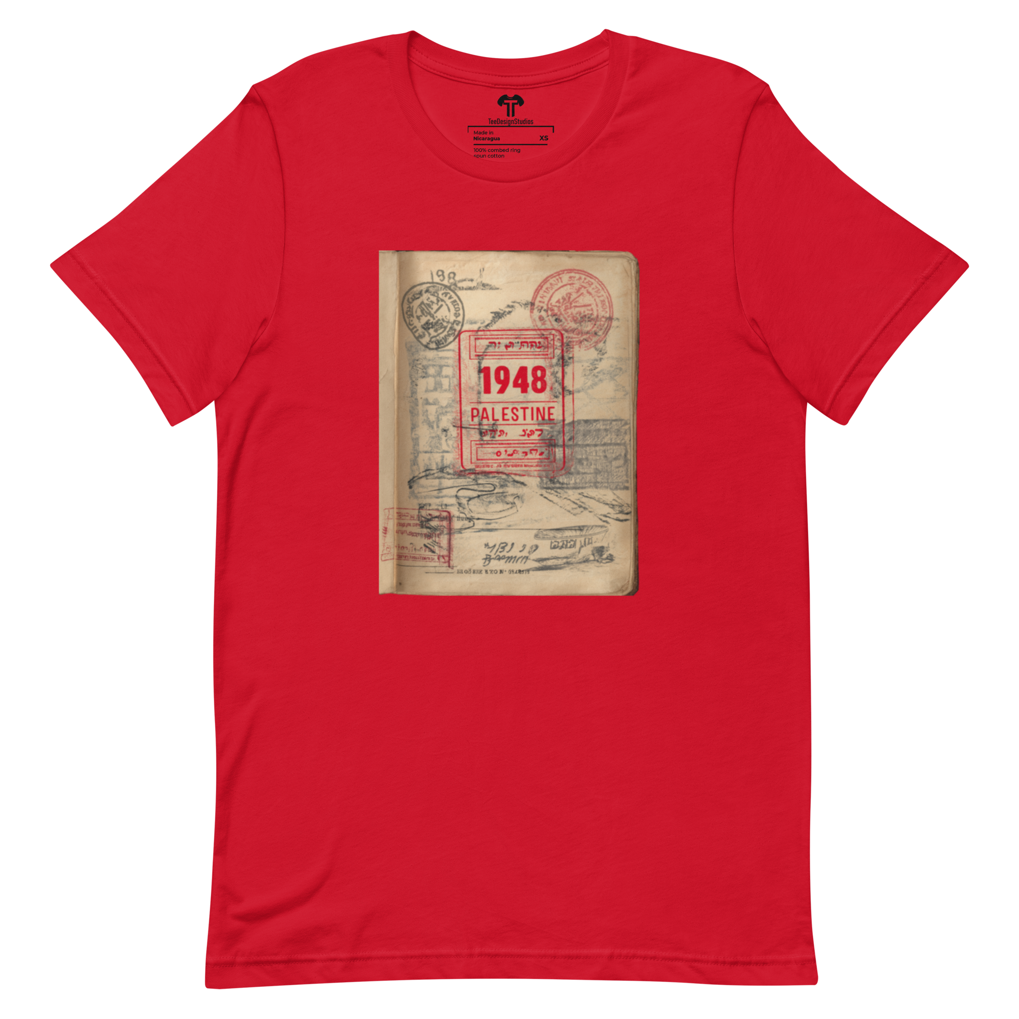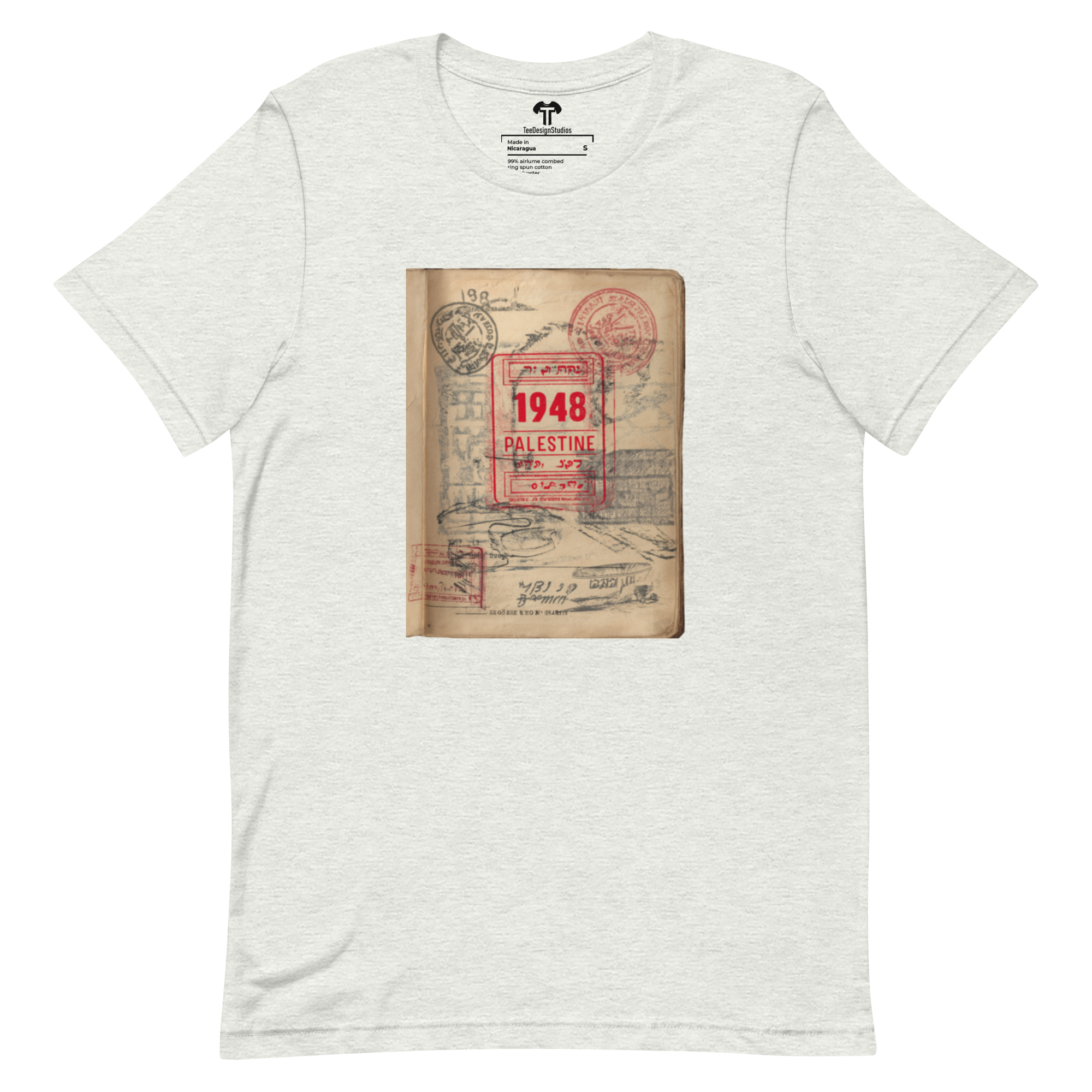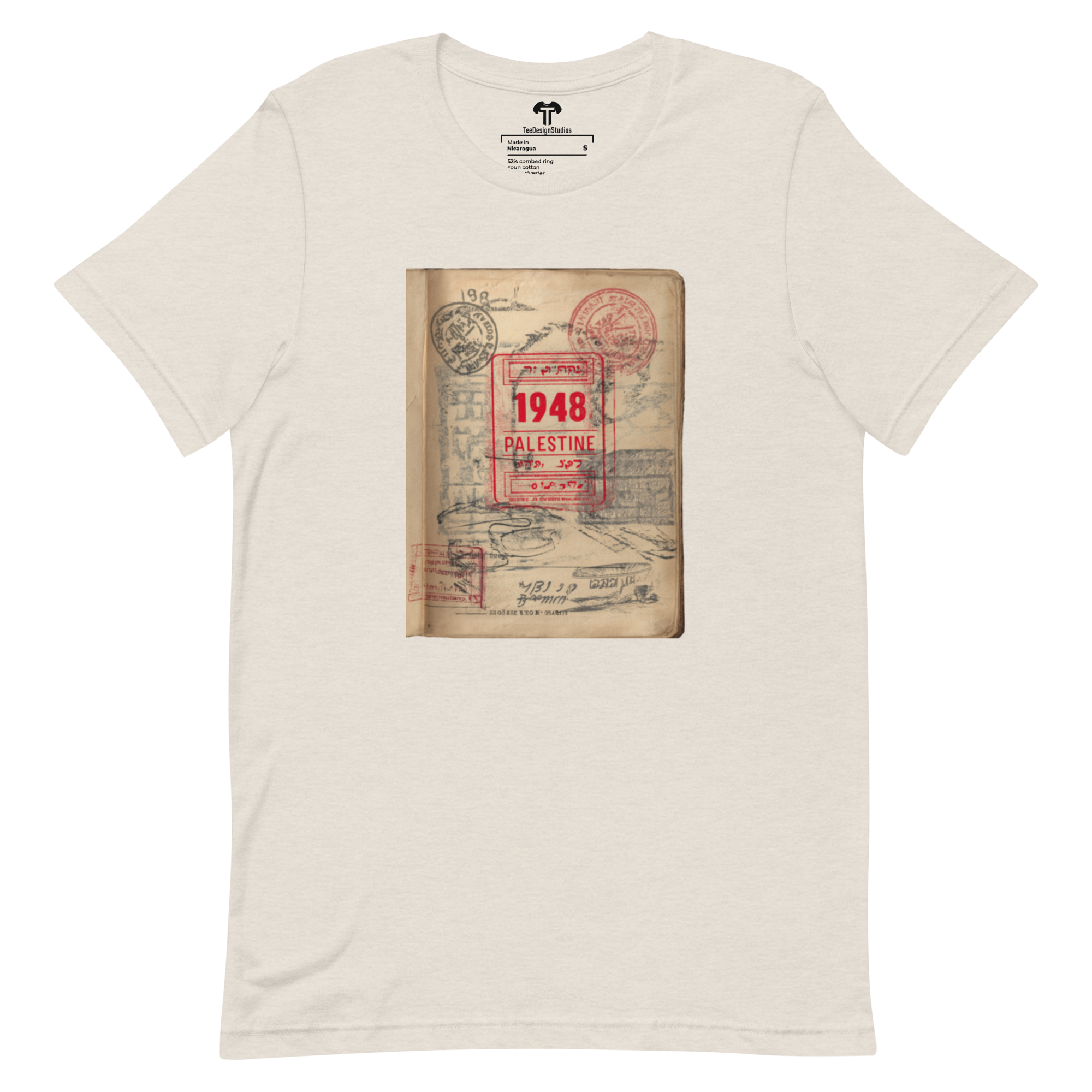 This t-shirt combines a soft, lightweight feel with the perfect amount of stretch for comfort and a flattering fit on all. Its design features a vintage passport page with a prominent red official stamp reading "1948 PALESTINE," surrounded by faded passport marks, symbolizing themes of identity and displacement in a conceptual style.