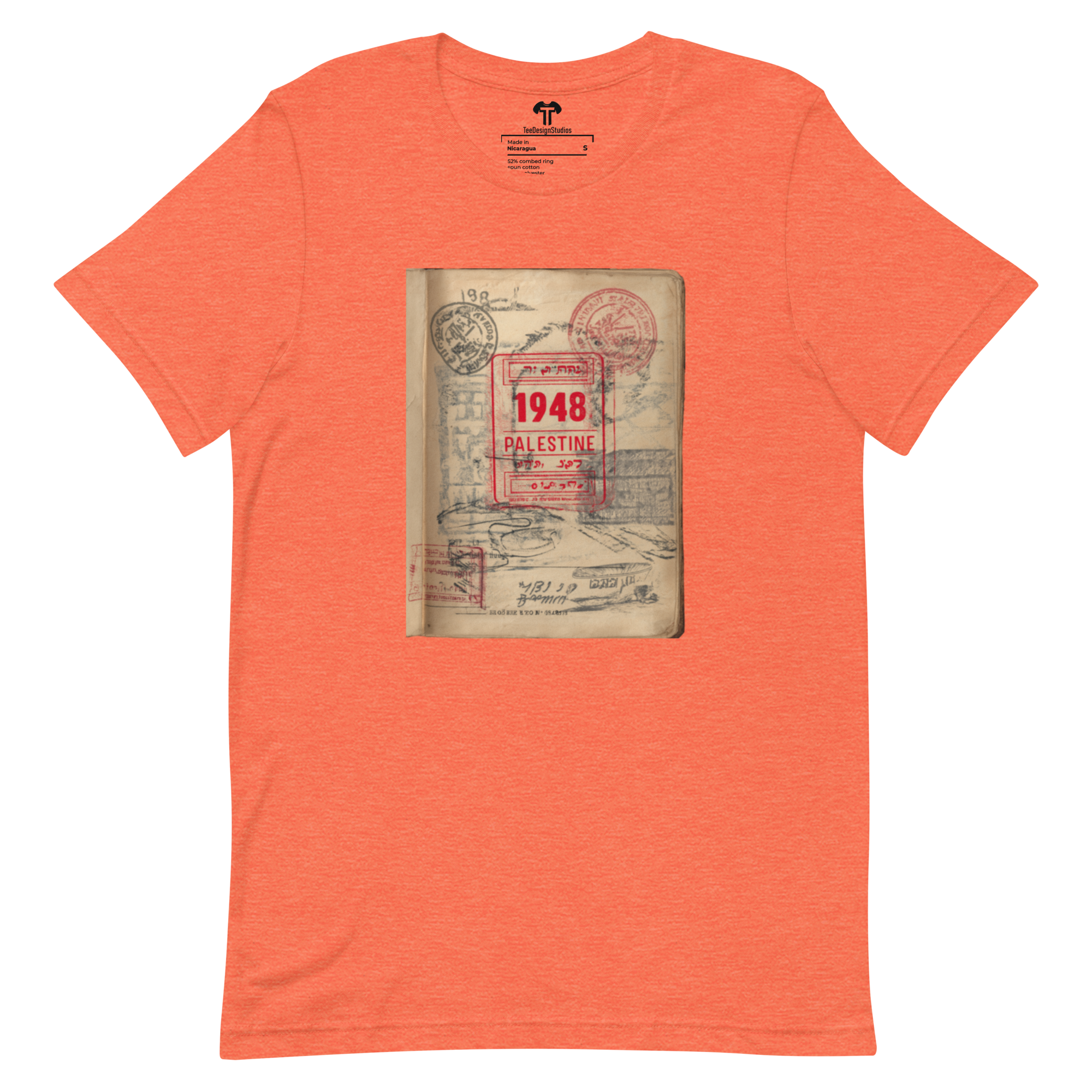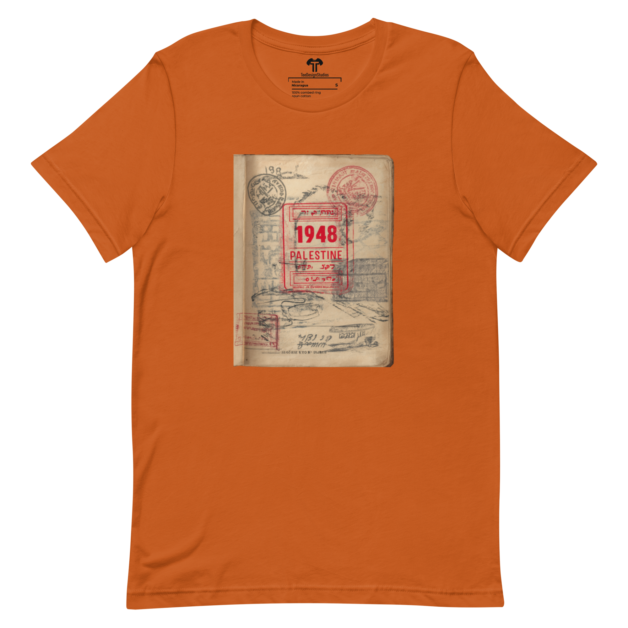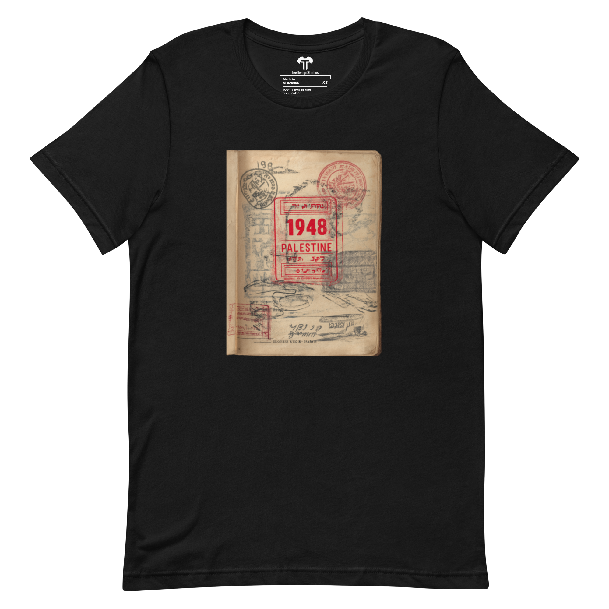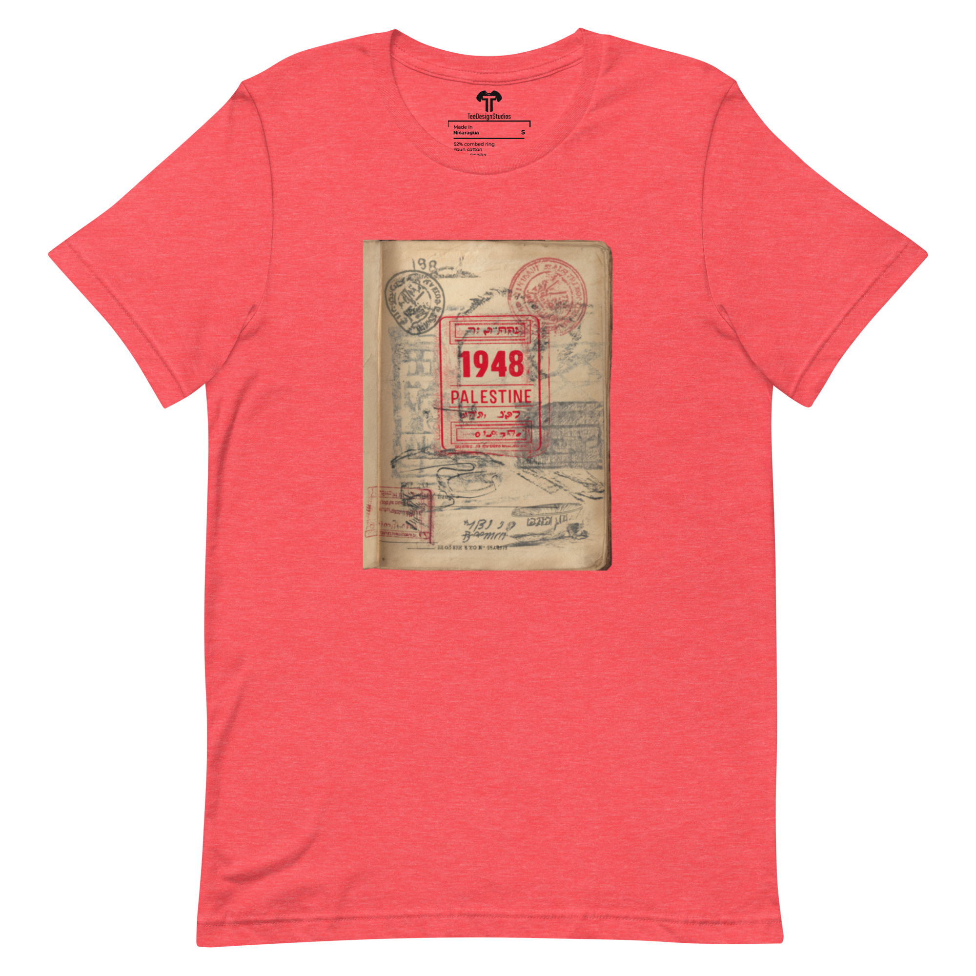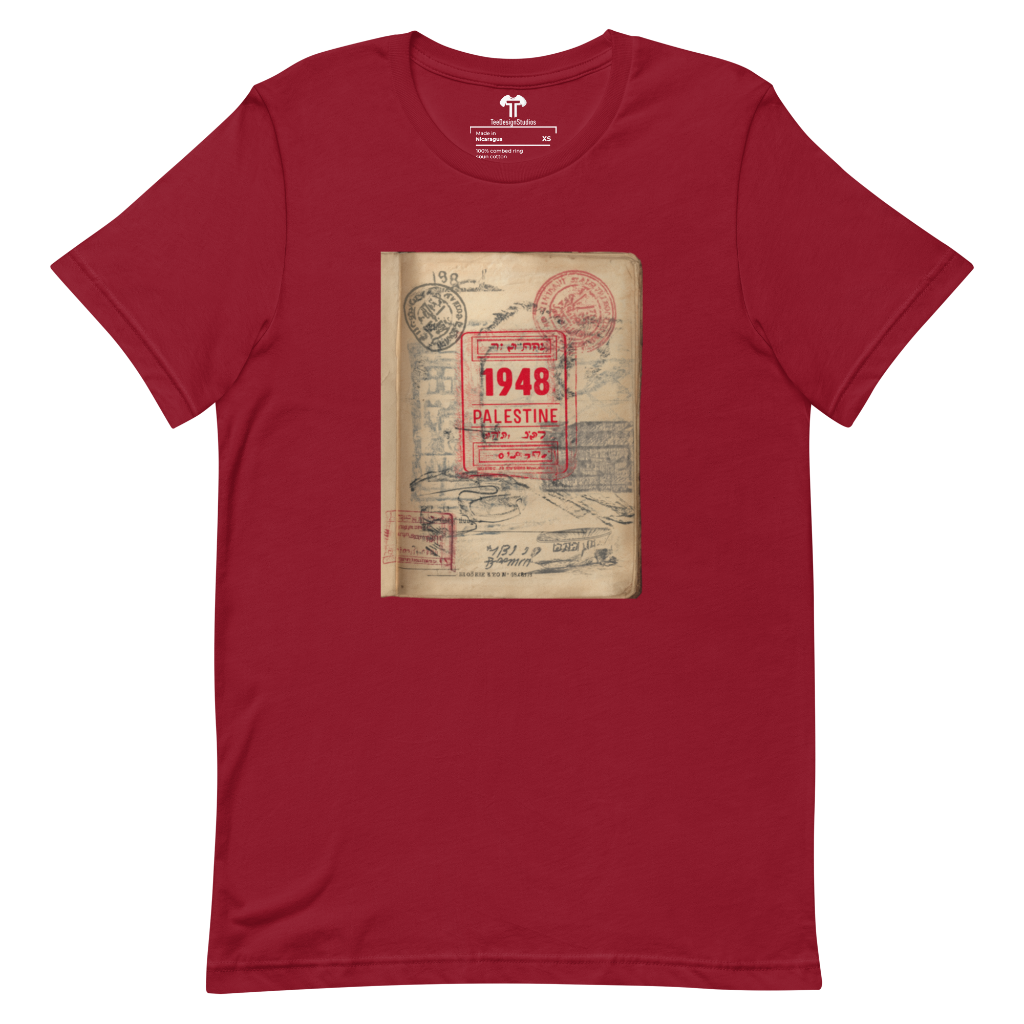 This t-shirt combines a soft, lightweight feel with the perfect amount of stretch for comfort and a flattering fit on all. Its design features a vintage passport page with a prominent red official stamp reading "1948 PALESTINE," surrounded by faded passport marks, symbolizing themes of identity and displacement in a conceptual style.