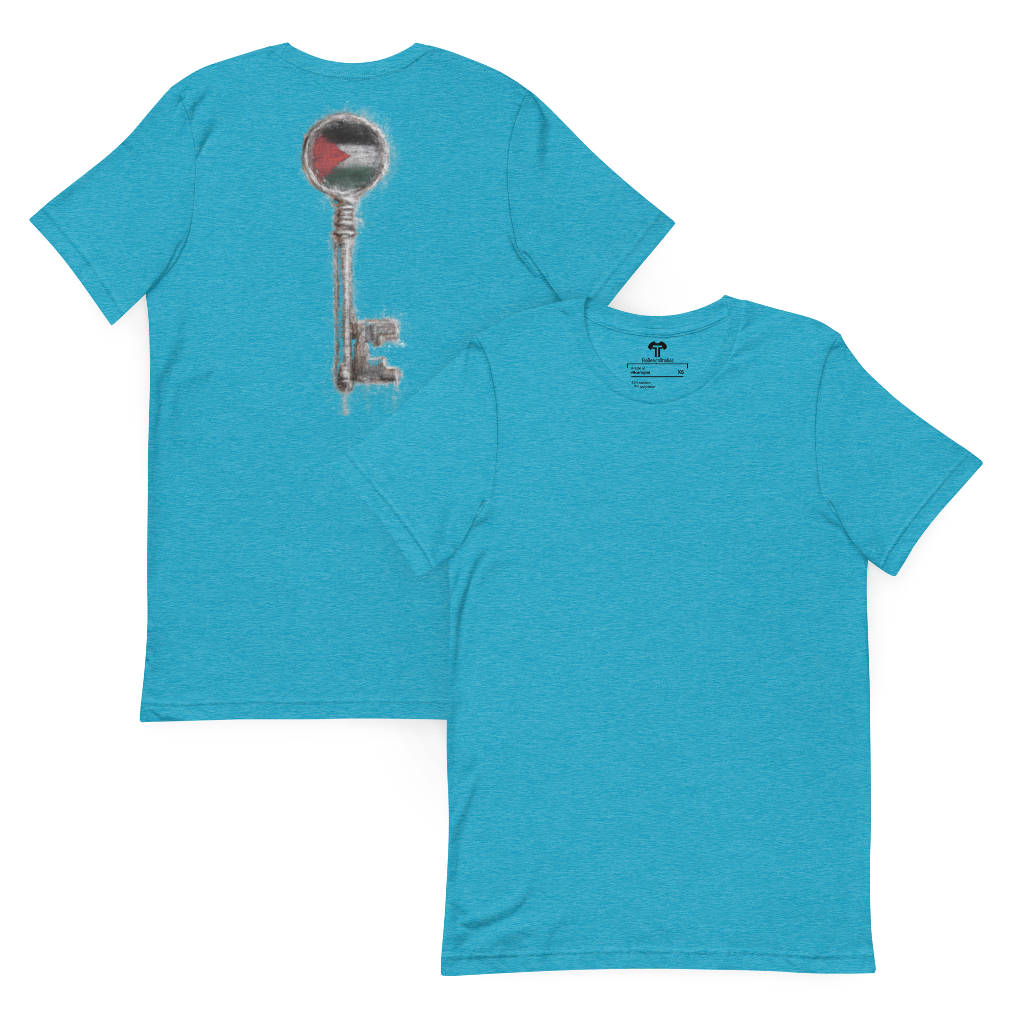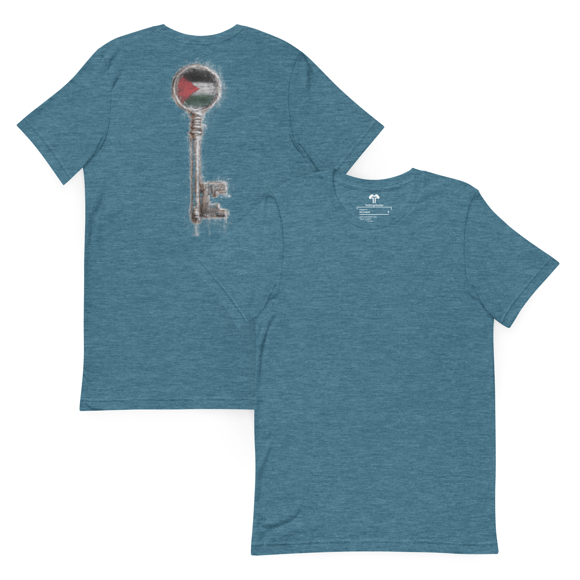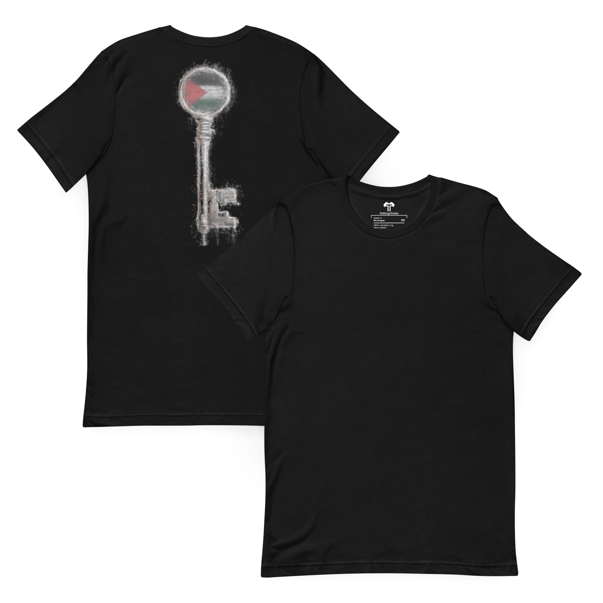 This t-shirt features a soft, lightweight material with a perfect stretch that ensures both comfort and a flattering fit for everyone. Its design showcases a chalkboard texture with a prominent vintage key sketched in white chalk. The key’s bow encloses the Palestinian flag, and chalk dust gently falls beneath, embodying powerful protest art symbolizing the right of return.
