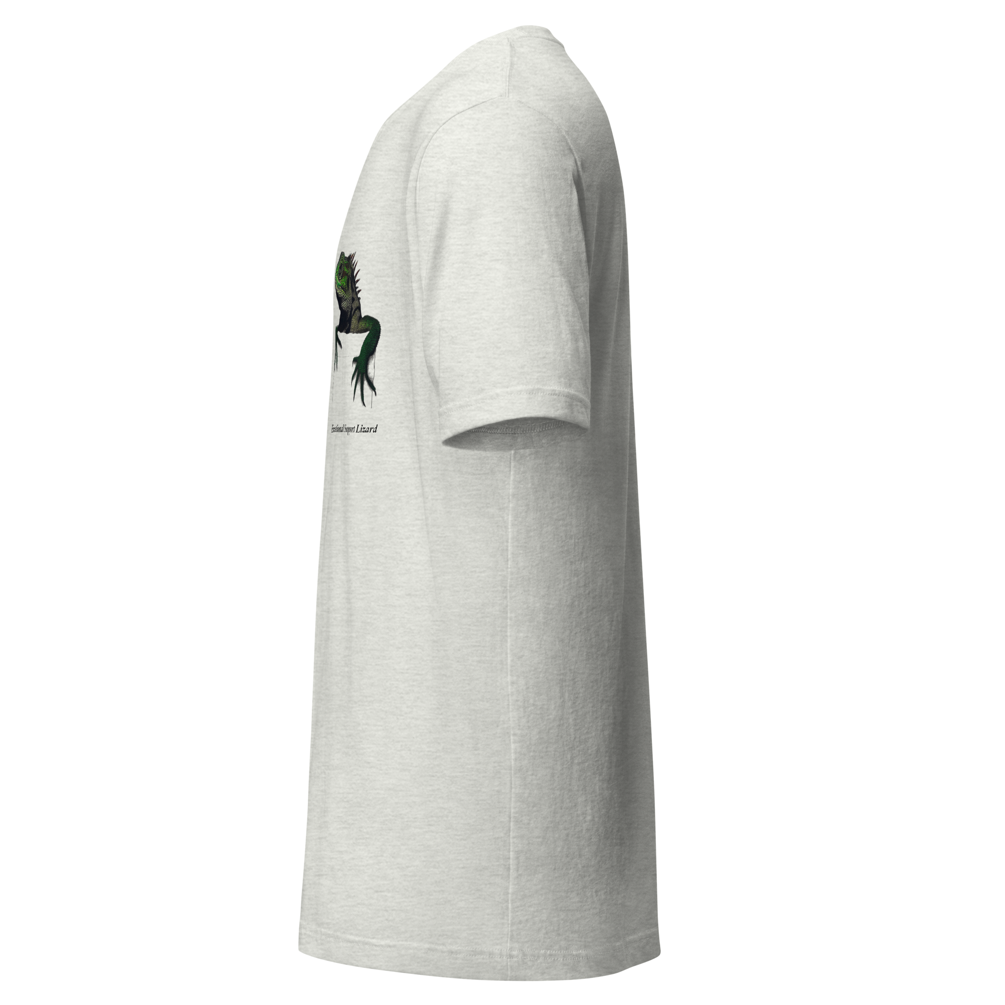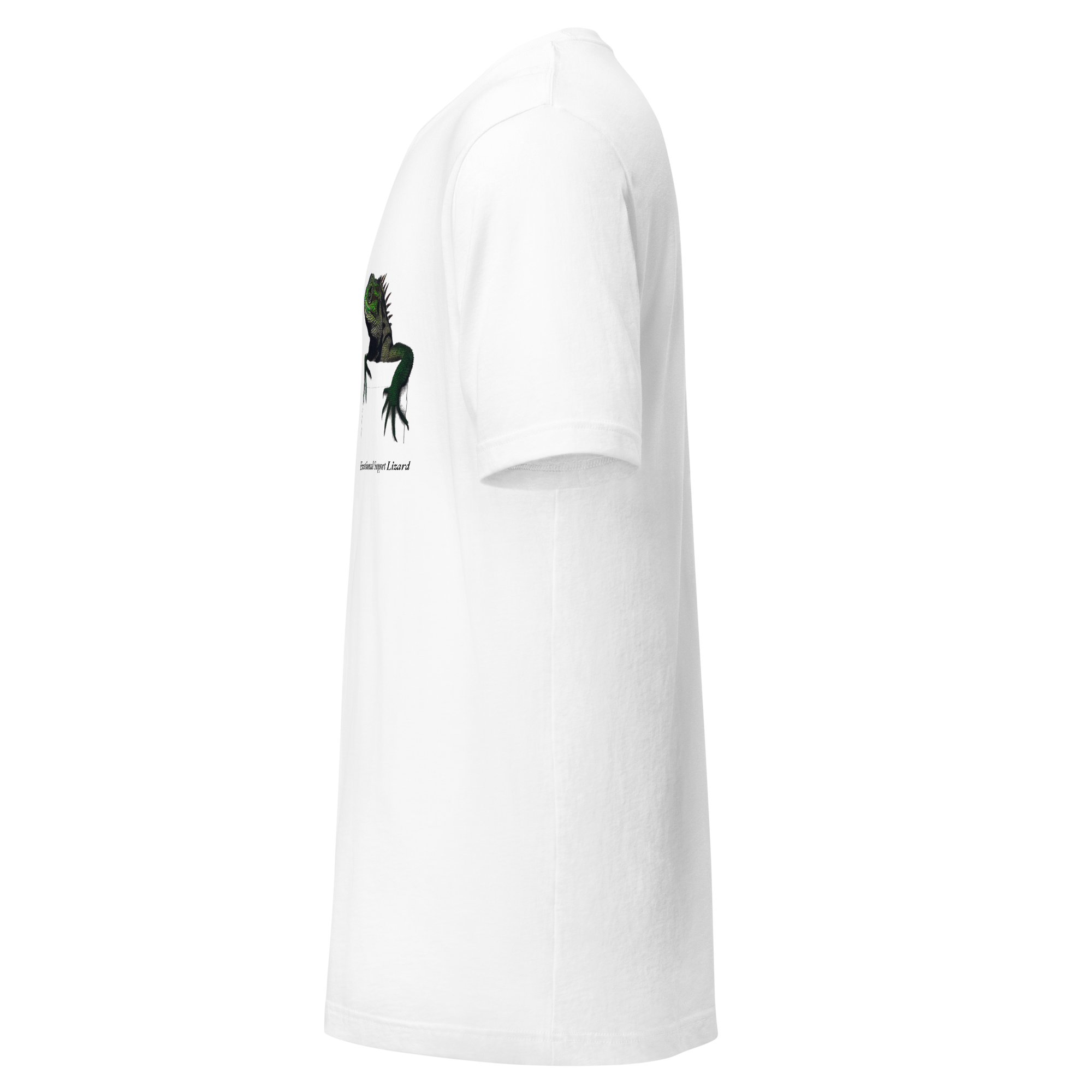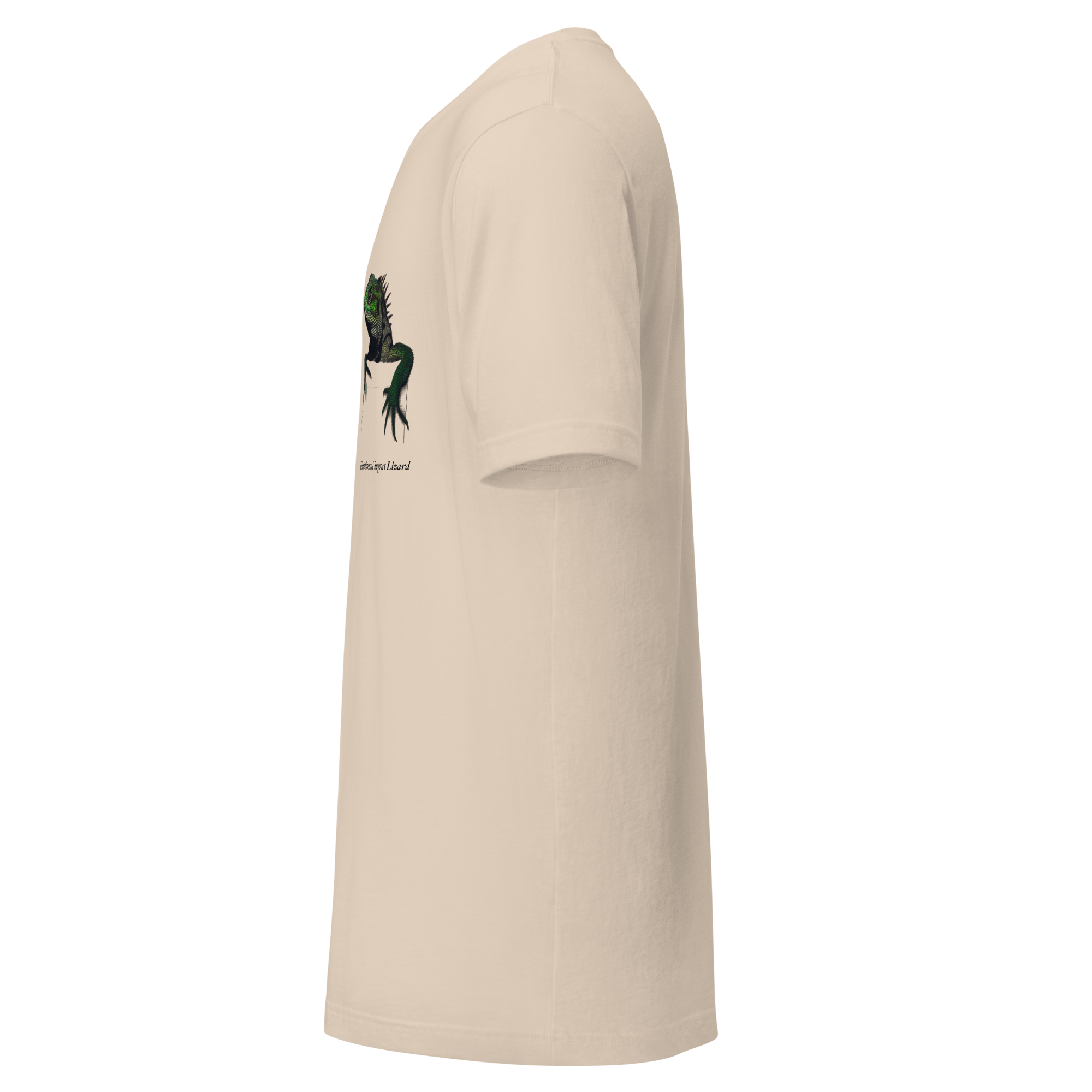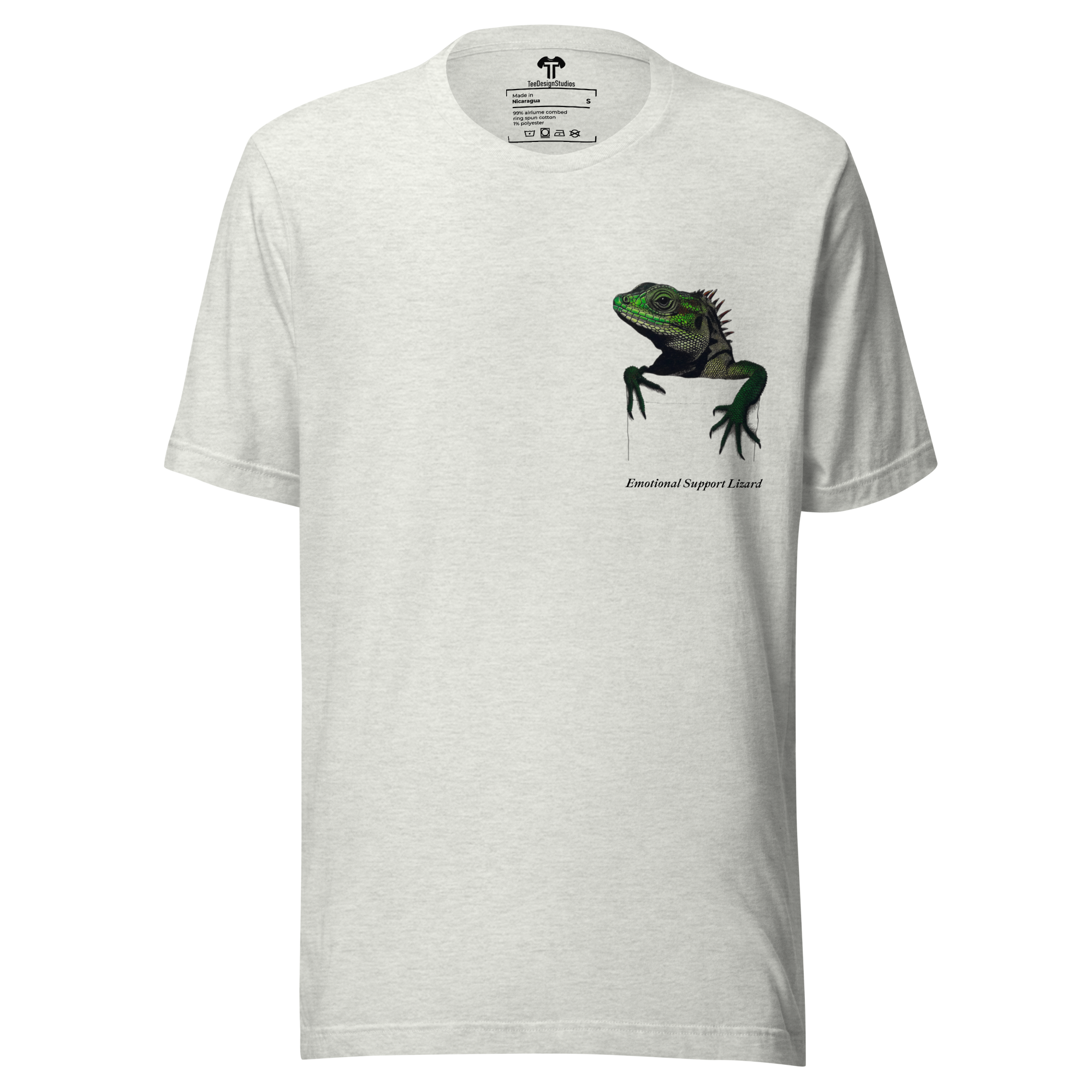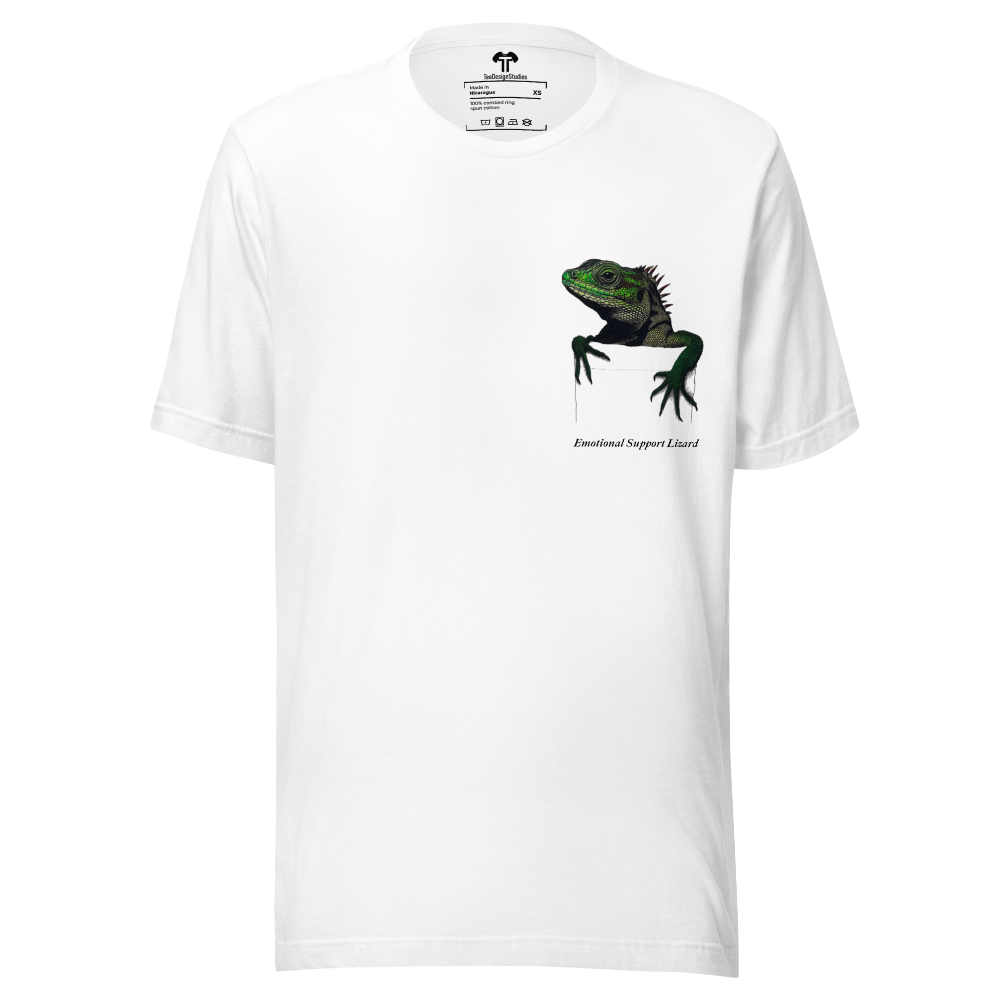 This unisex t-shirt offers a perfect combination of softness, lightweight feel, and just the right stretch for a comfortable, flattering fit. The design showcases a green lizard climbing on the pocket in a clean, sticker-style line drawing against a white background, creating a playful yet subtle detail without shadows.