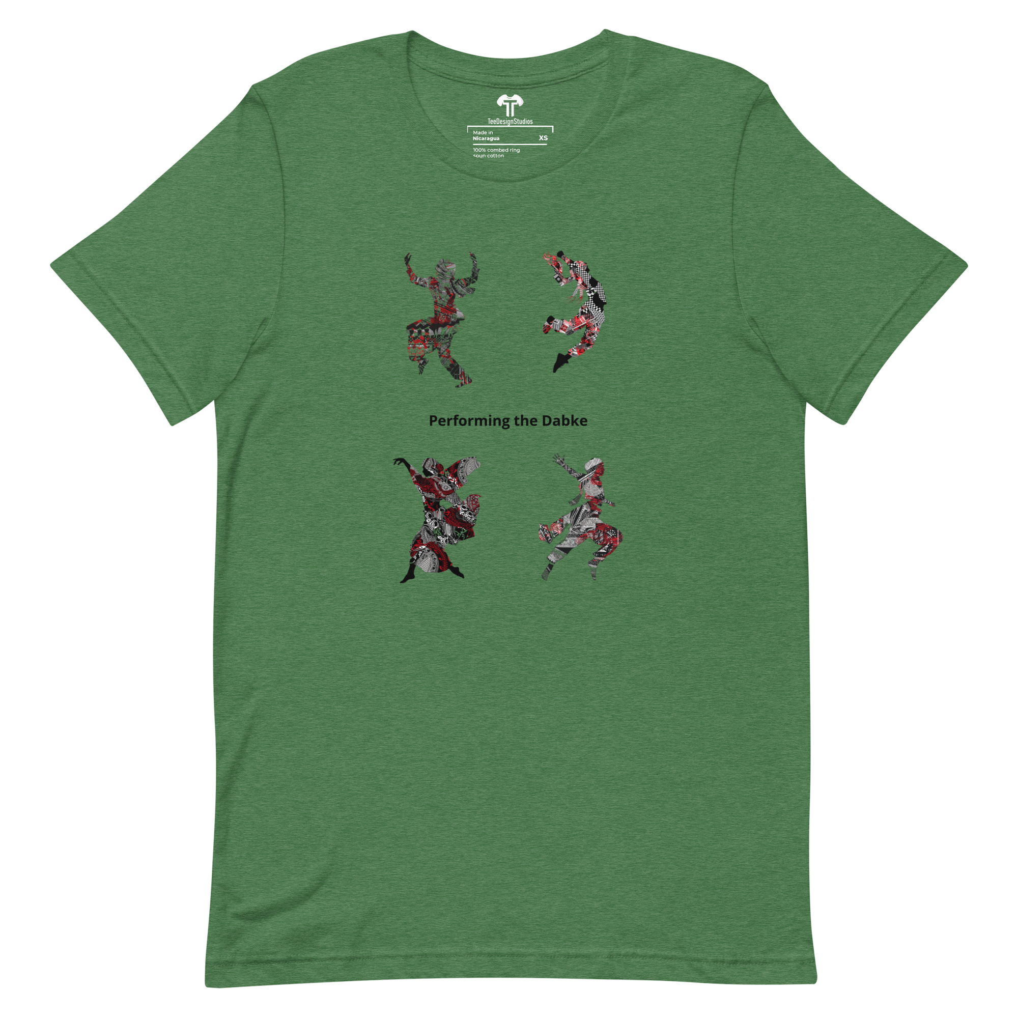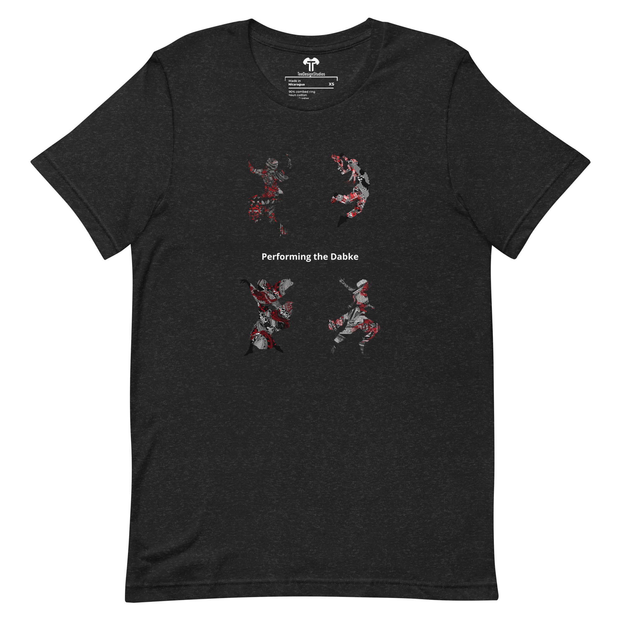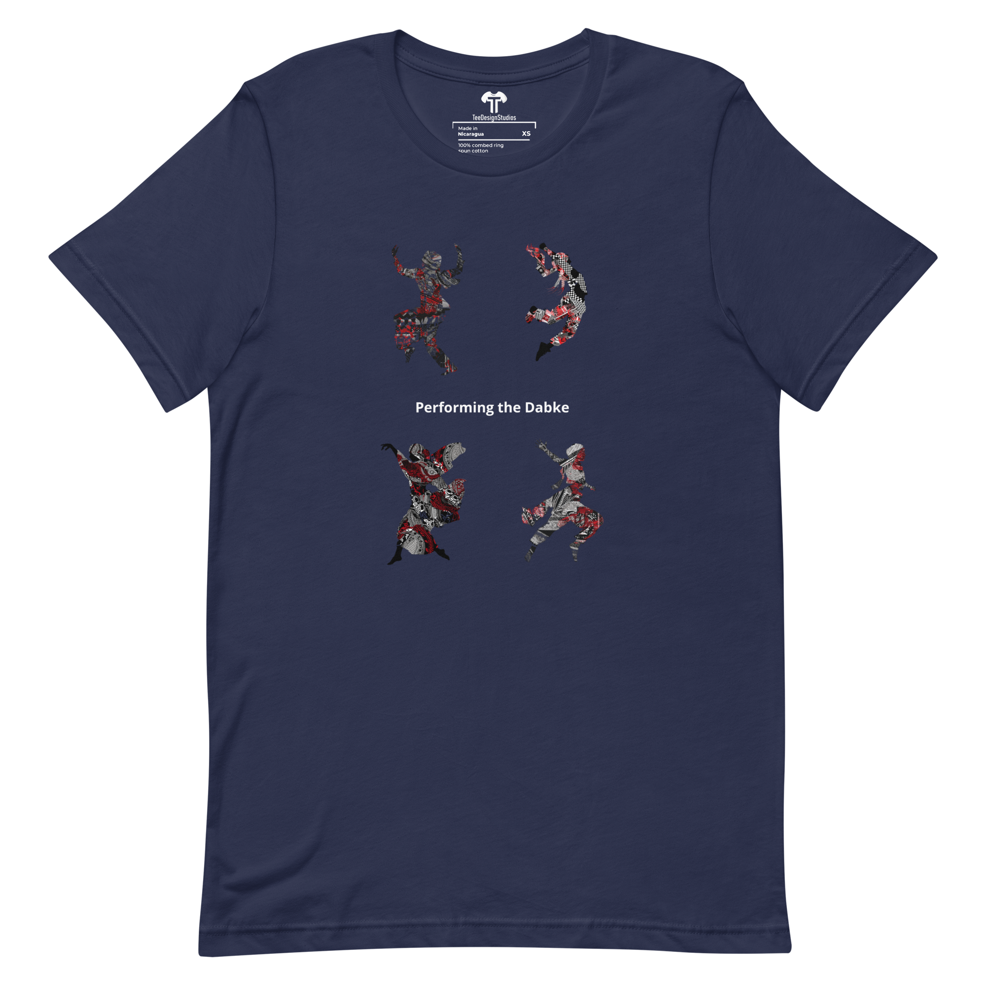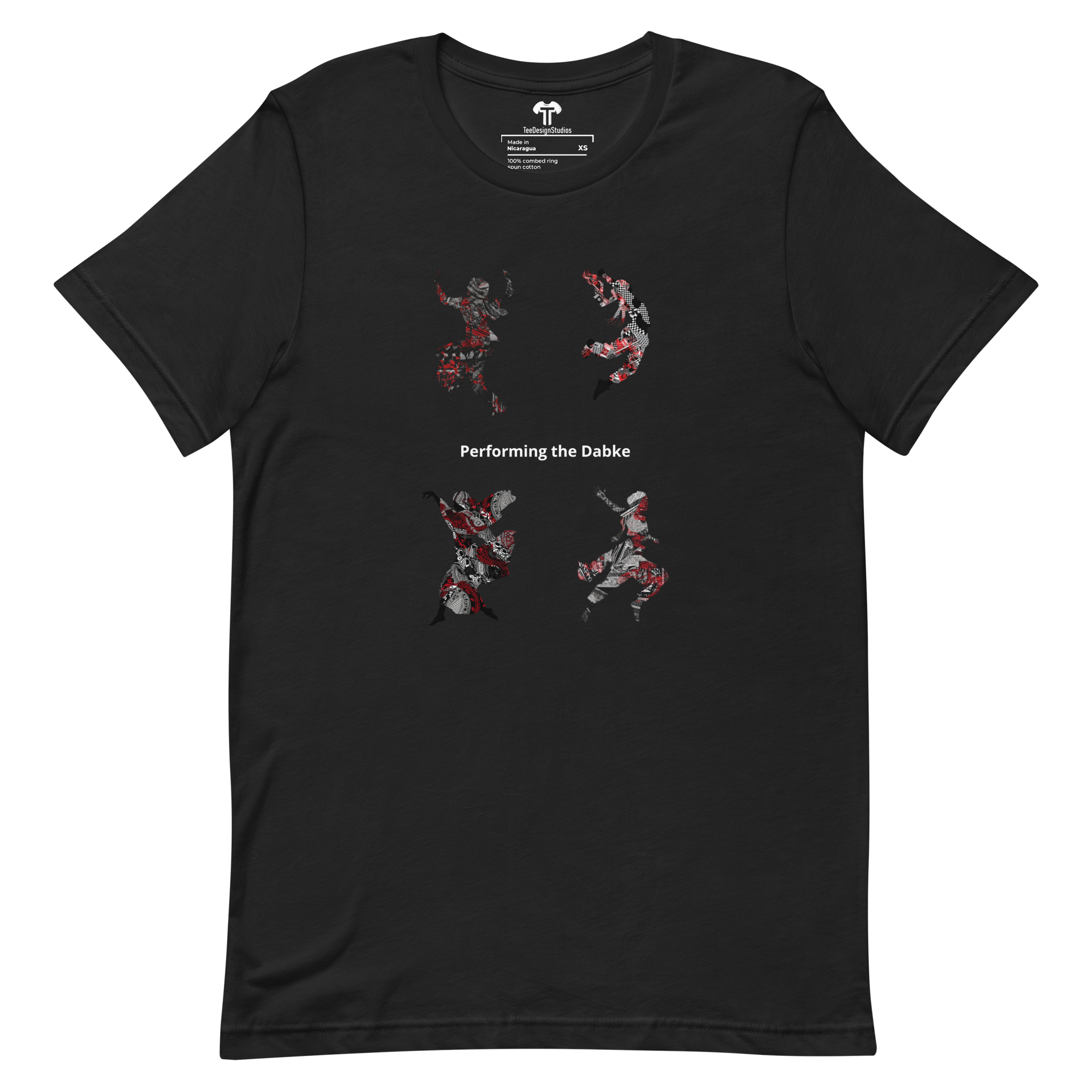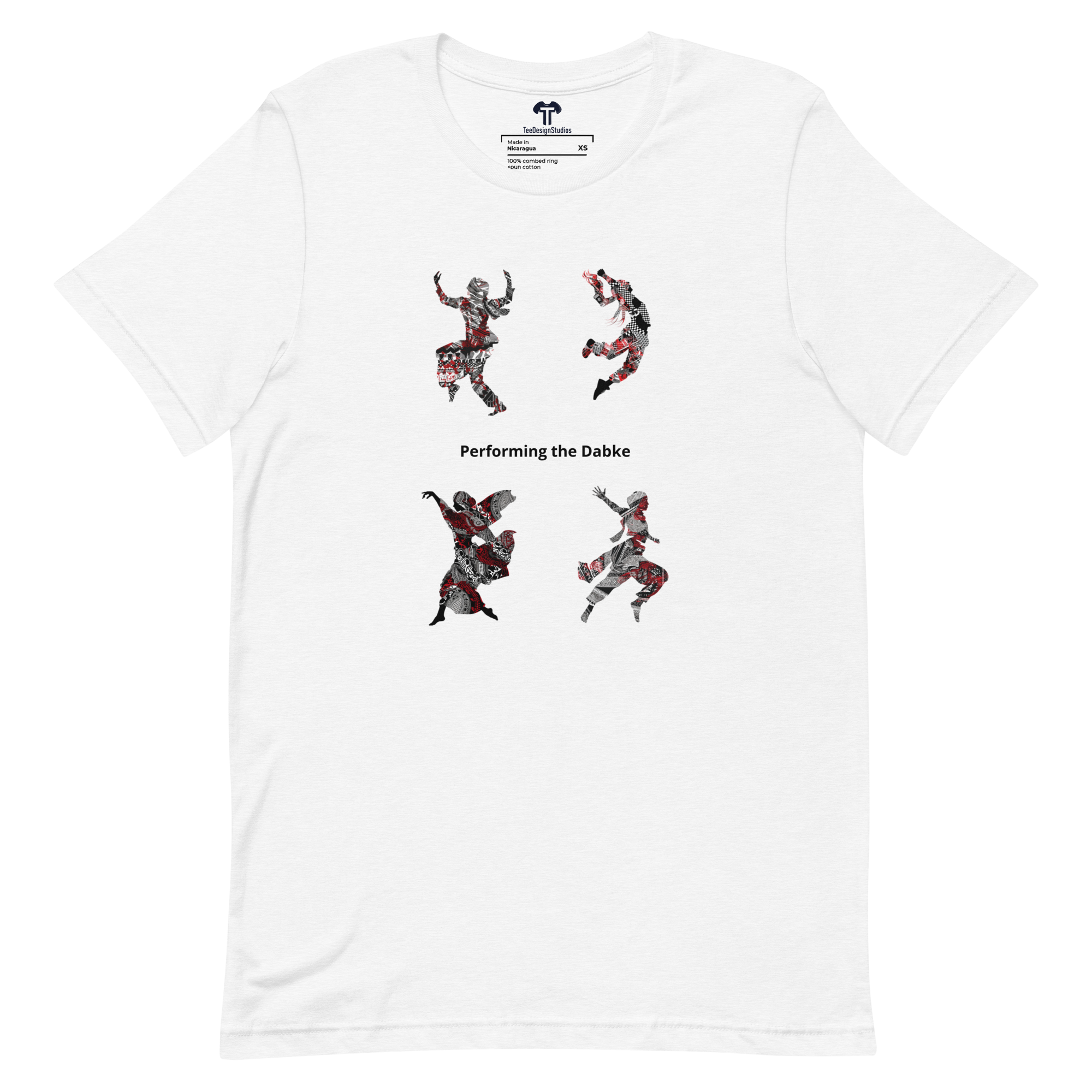 This t-shirt offers exceptional softness and a lightweight feel with just the right stretch for comfort and flattering fit on all body types. It features a dynamic dancer silhouette performing the Dabke, filled with a seamless black-and-white Palestinian keffiyeh pattern combined with red tatreez embroidery motifs. Set against a pure white background, the high-contrast vector design is both energetic and culturally authentic.