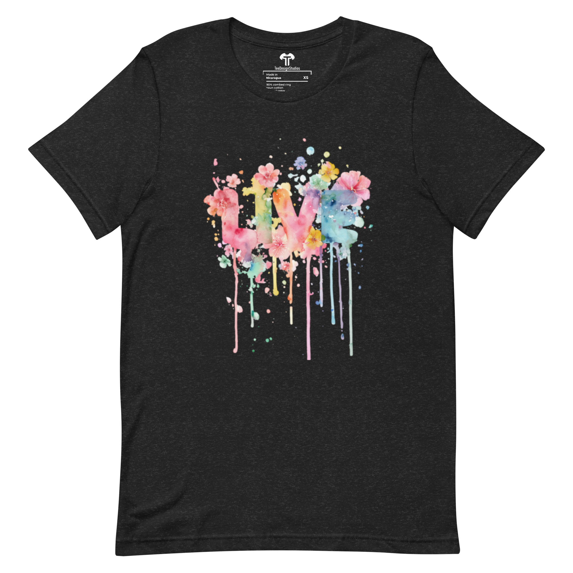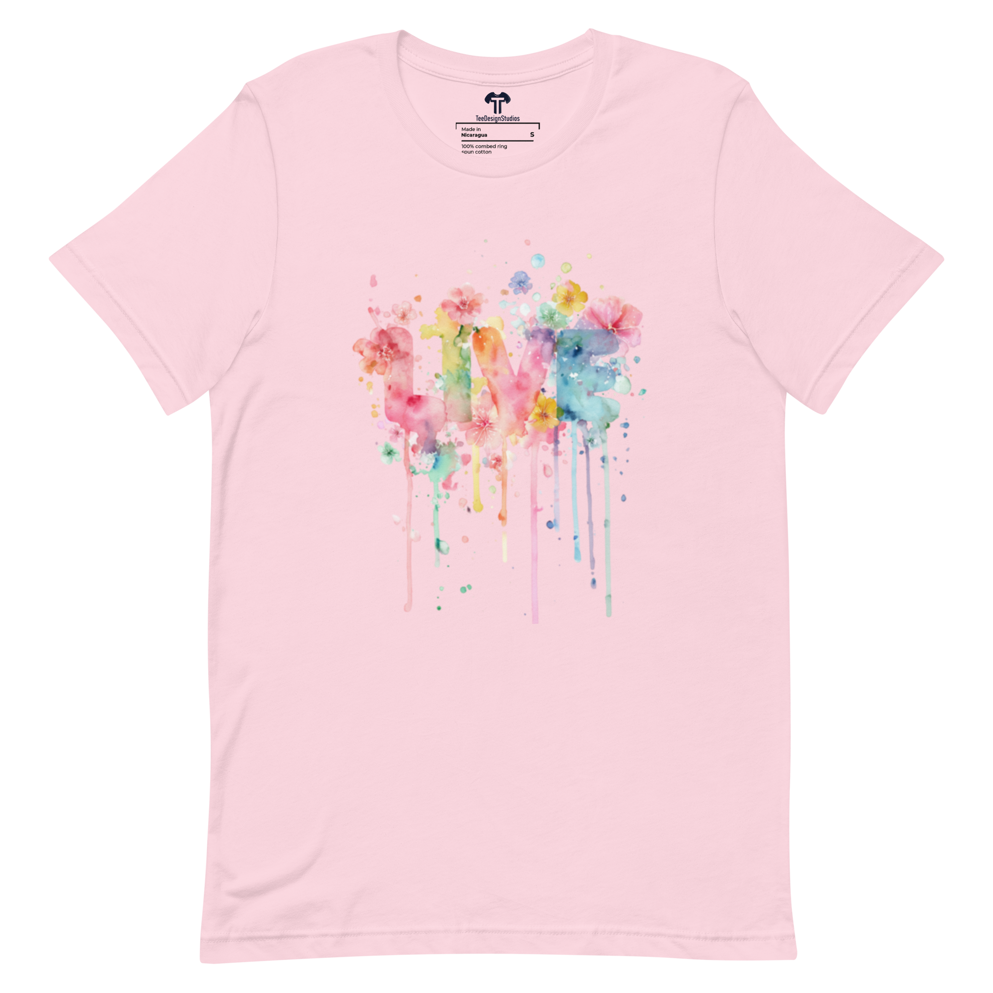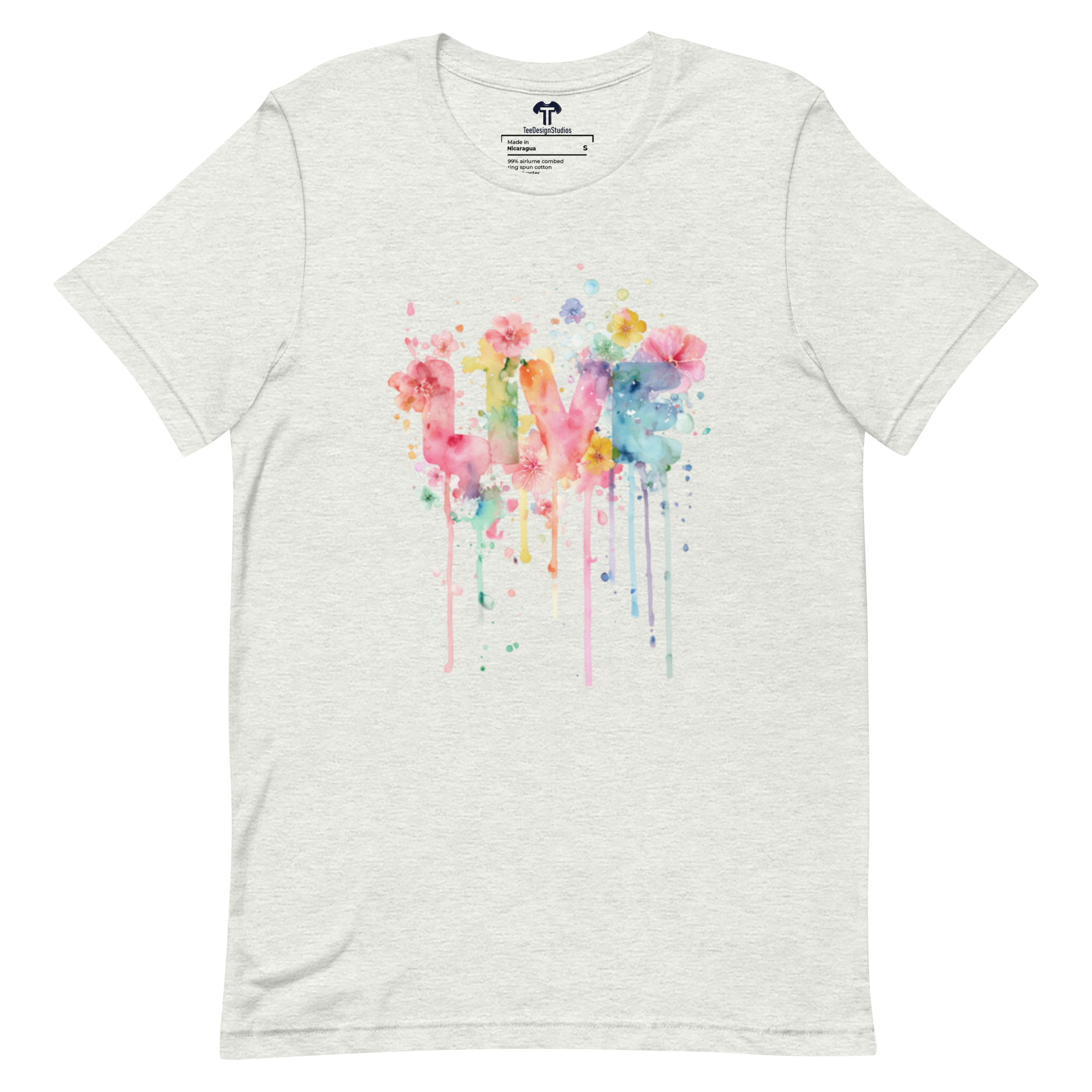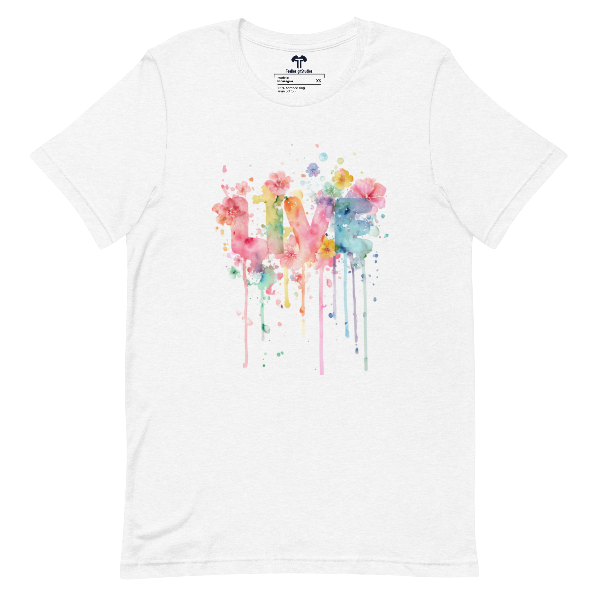 This t-shirt delivers on all your expectations and beyond. It offers a soft, lightweight fabric with just the right stretch, ensuring a comfortable and flattering fit for everyone. Featuring watercolor splatter lettering with paint drips and blooms in delicate pastel shades, its artistic texture on a white background gives it a handcrafted, unique appeal.