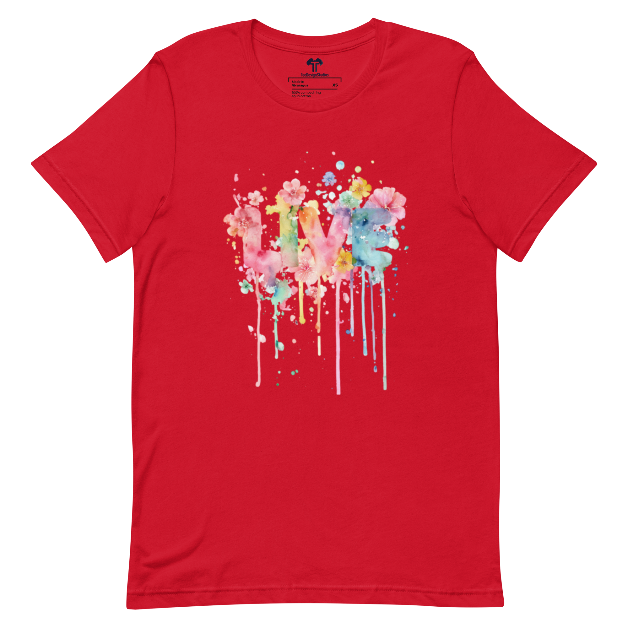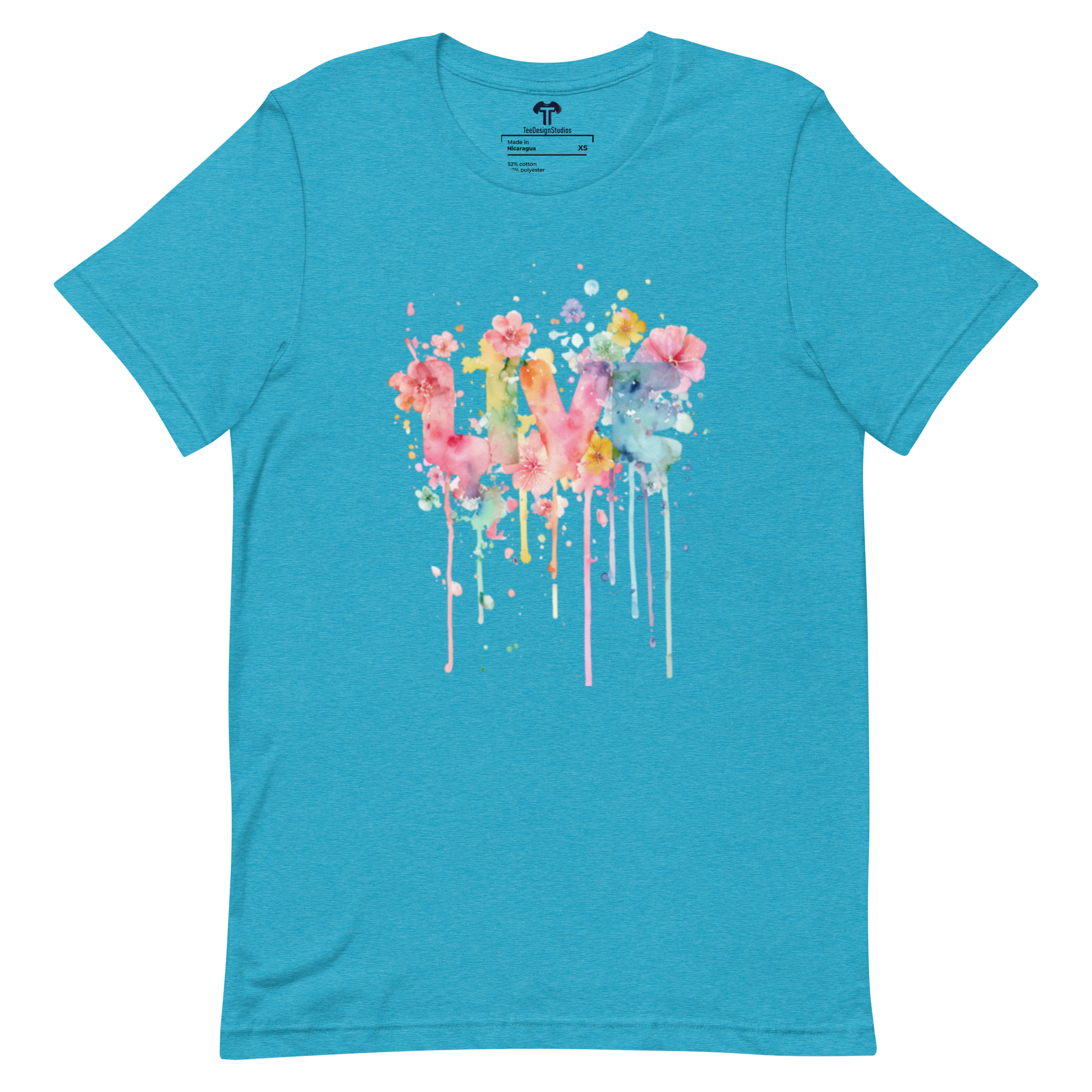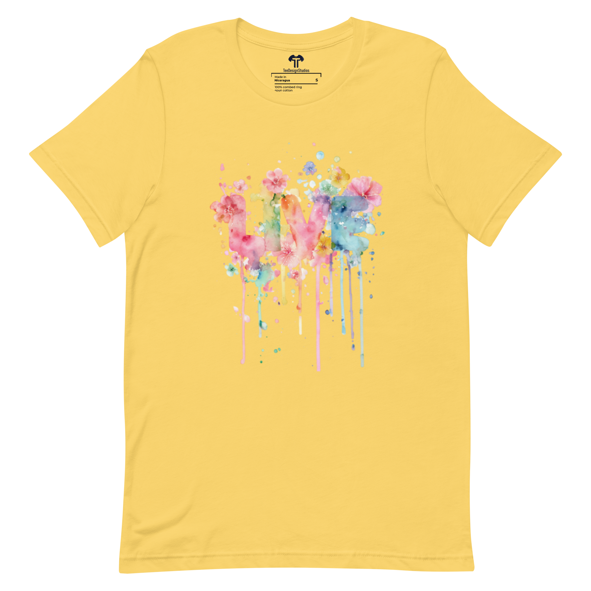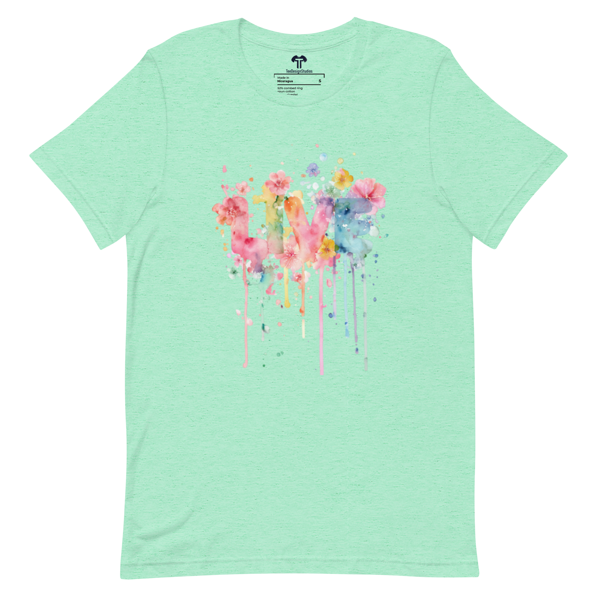 This t-shirt delivers on all your expectations and beyond. It offers a soft, lightweight fabric with just the right stretch, ensuring a comfortable and flattering fit for everyone. Featuring watercolor splatter lettering with paint drips and blooms in delicate pastel shades, its artistic texture on a white background gives it a handcrafted, unique appeal.