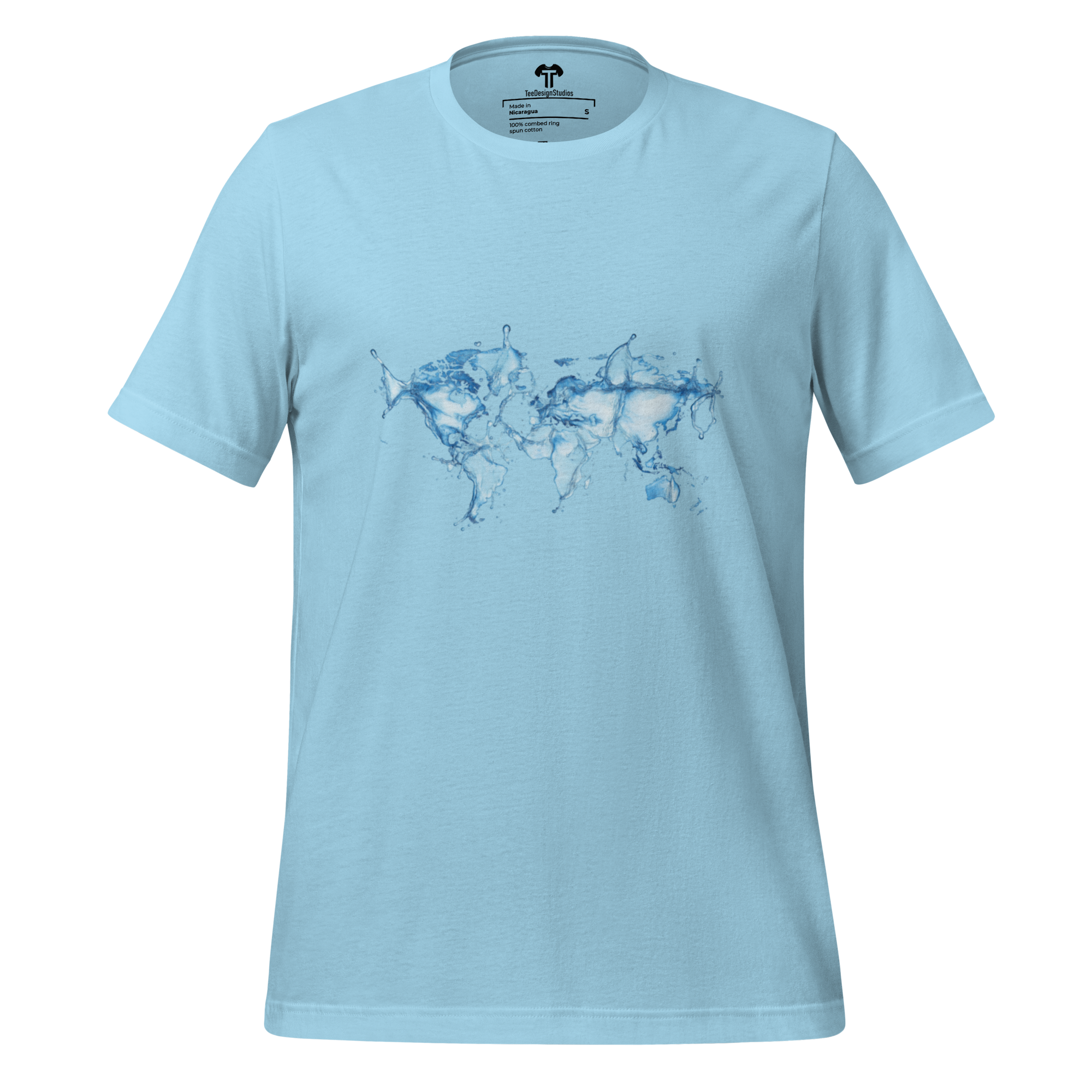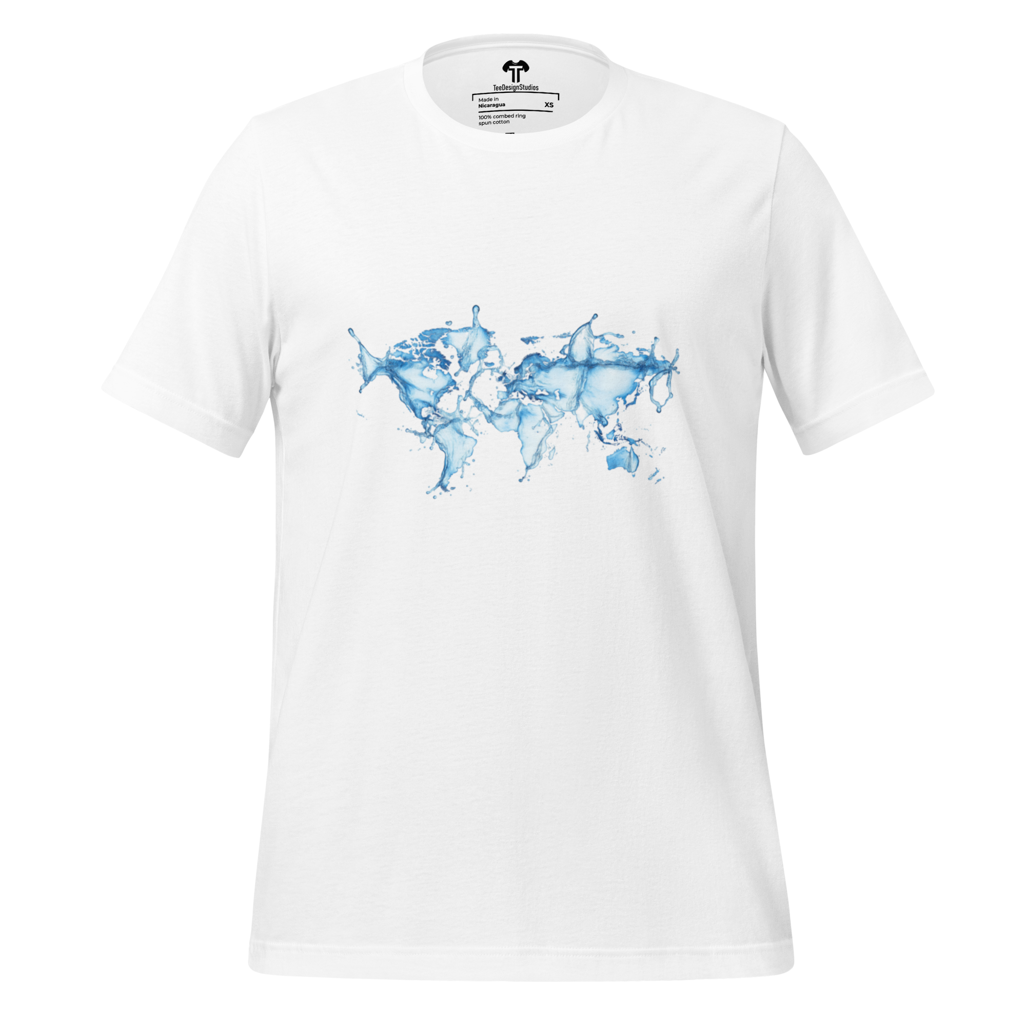 This t-shirt offers the perfect blend of softness and lightness, featuring just enough stretch for comfort. Designed to flatter every body type, it embodies the ideal balance of style and ease. The design showcases a world map crafted from water splashes in shades of blue against a clean white backdrop.