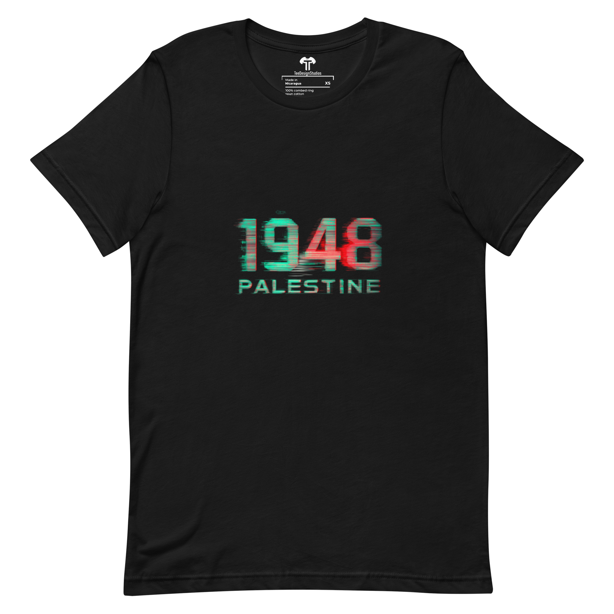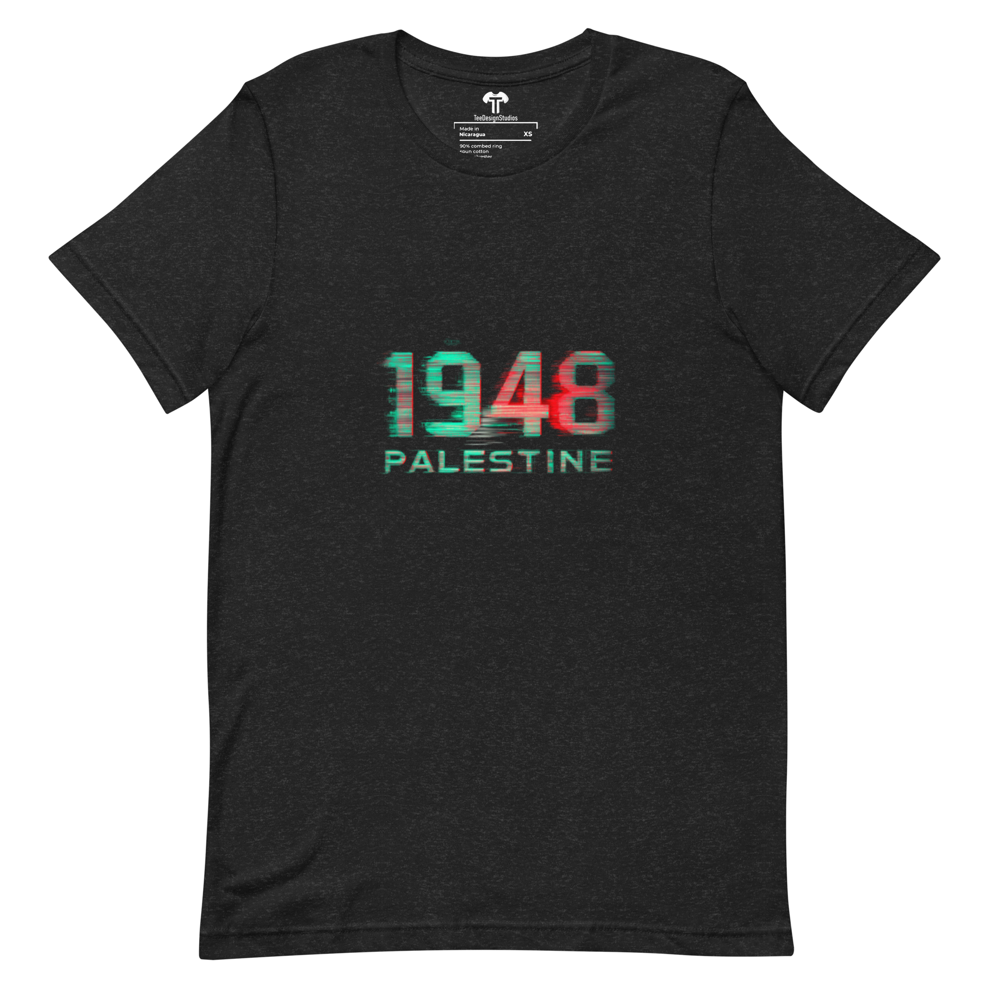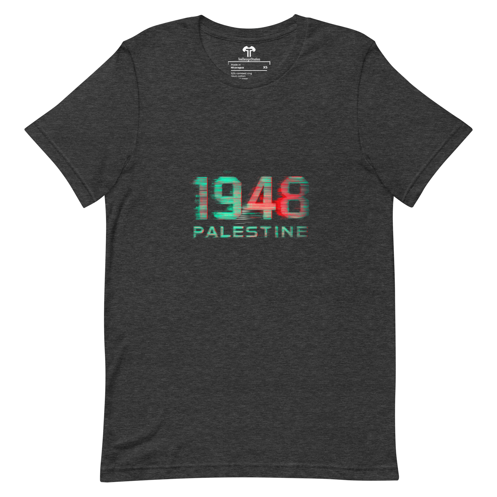 This t-shirt surpasses all expectations with its soft, lightweight fabric and perfect stretch. Designed to offer both comfort and a flattering fit for everyone, it combines style with ease of wear. Featuring glitch art with digital distortion on bold "1948 PALESTINE" text, RGB color separation, static noise, and a cyberpunk protest aesthetic, it stands out as a unique statement piece.