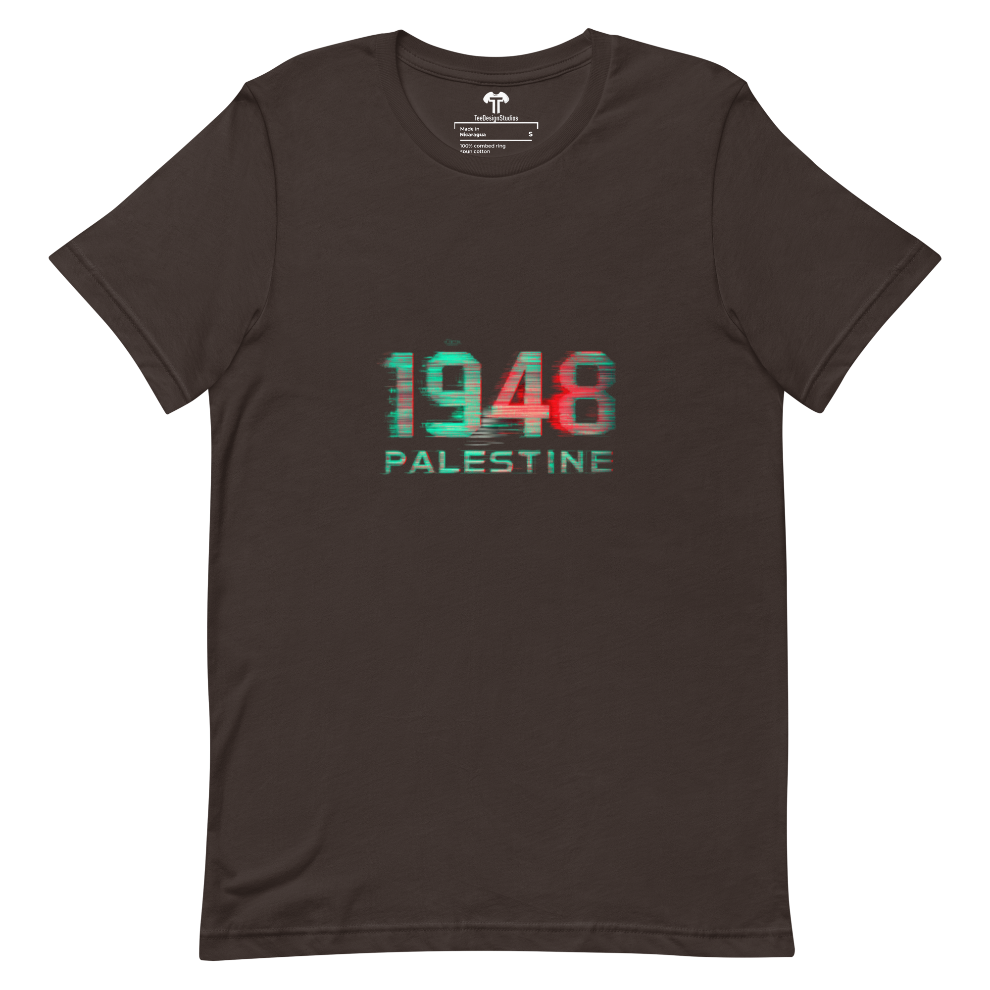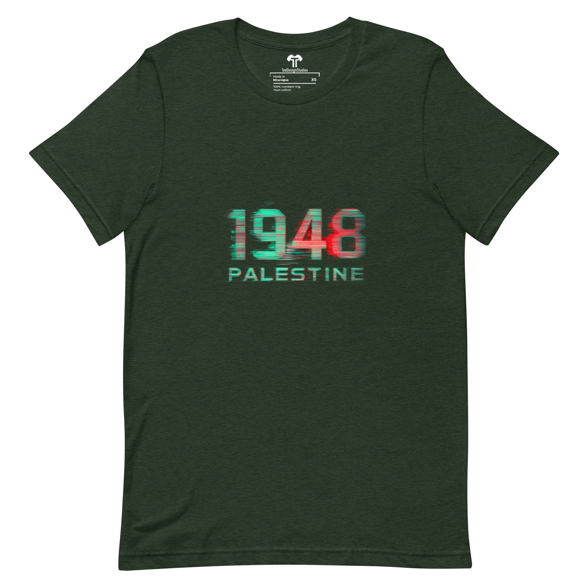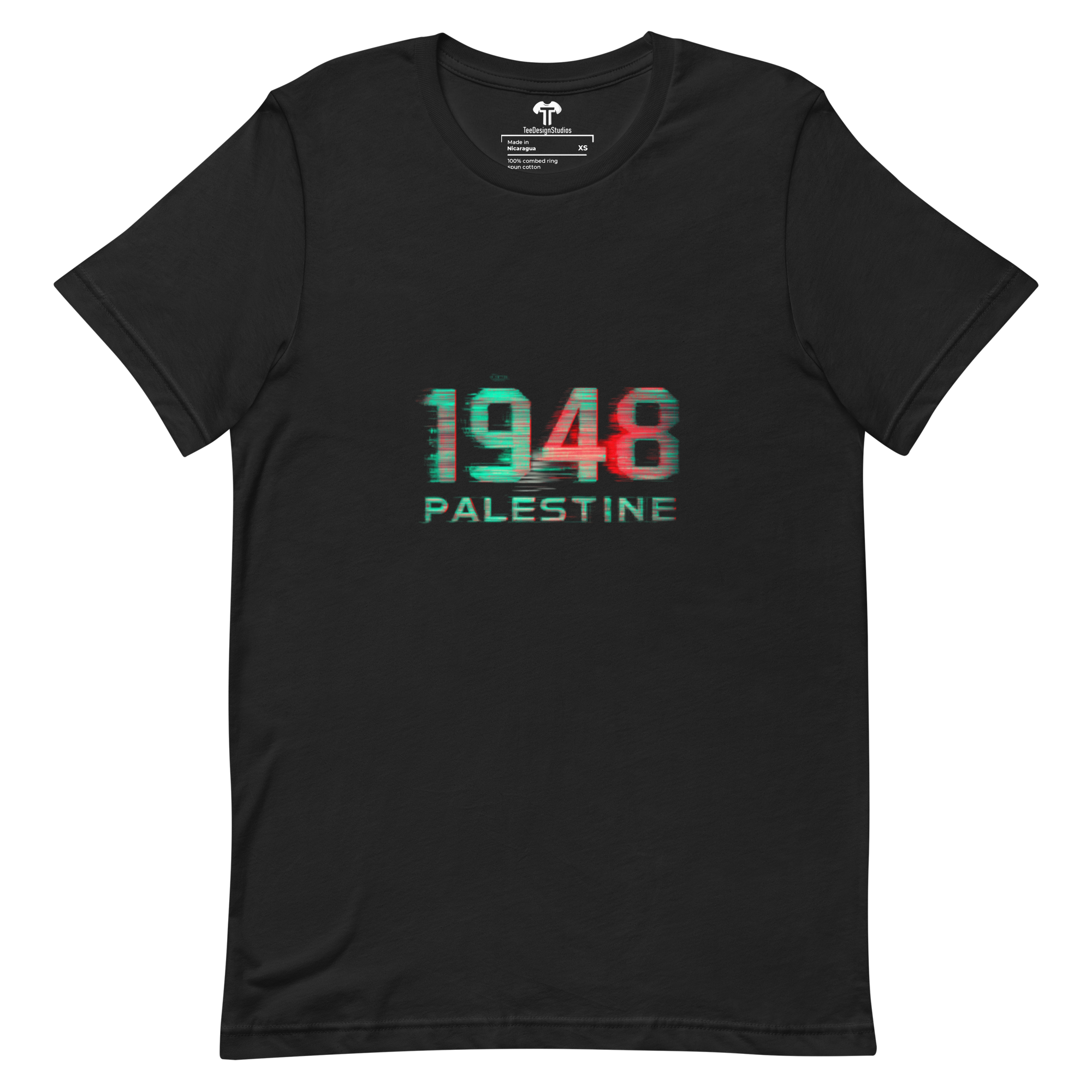 This t-shirt surpasses all expectations with its soft, lightweight fabric and perfect stretch. Designed to offer both comfort and a flattering fit for everyone, it combines style with ease of wear. Featuring glitch art with digital distortion on bold "1948 PALESTINE" text, RGB color separation, static noise, and a cyberpunk protest aesthetic, it stands out as a unique statement piece.