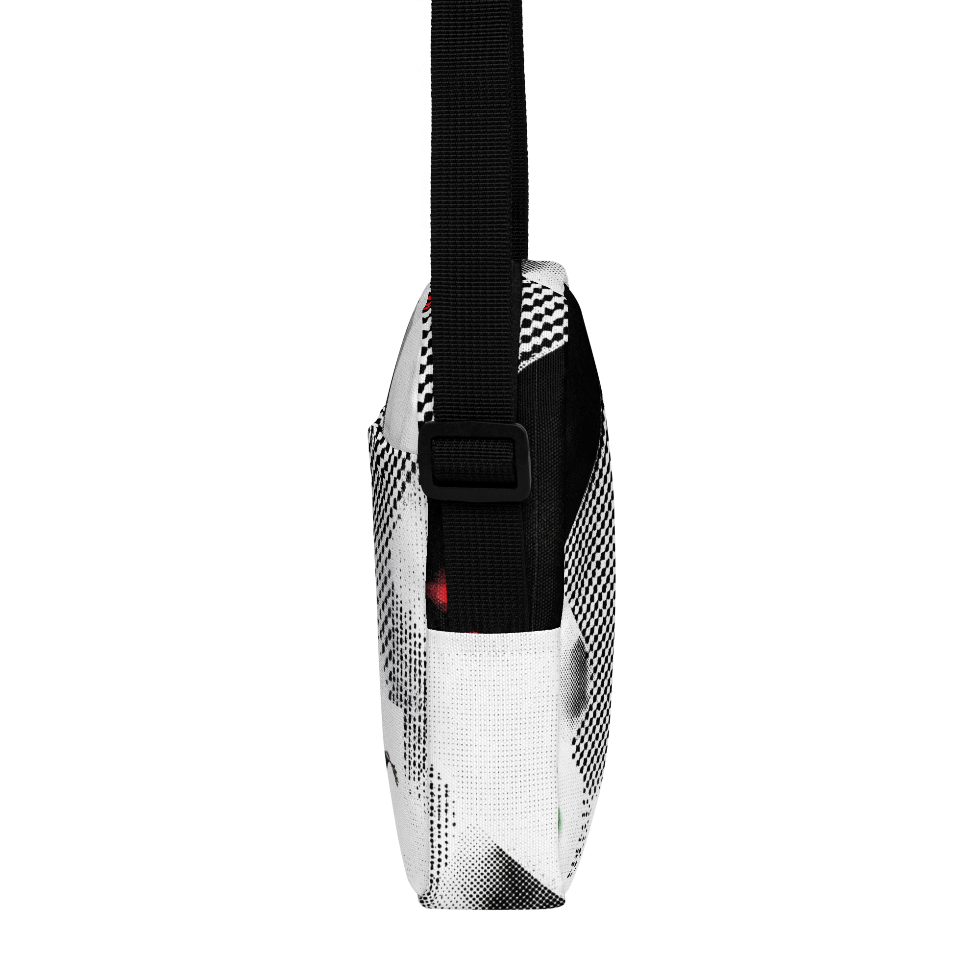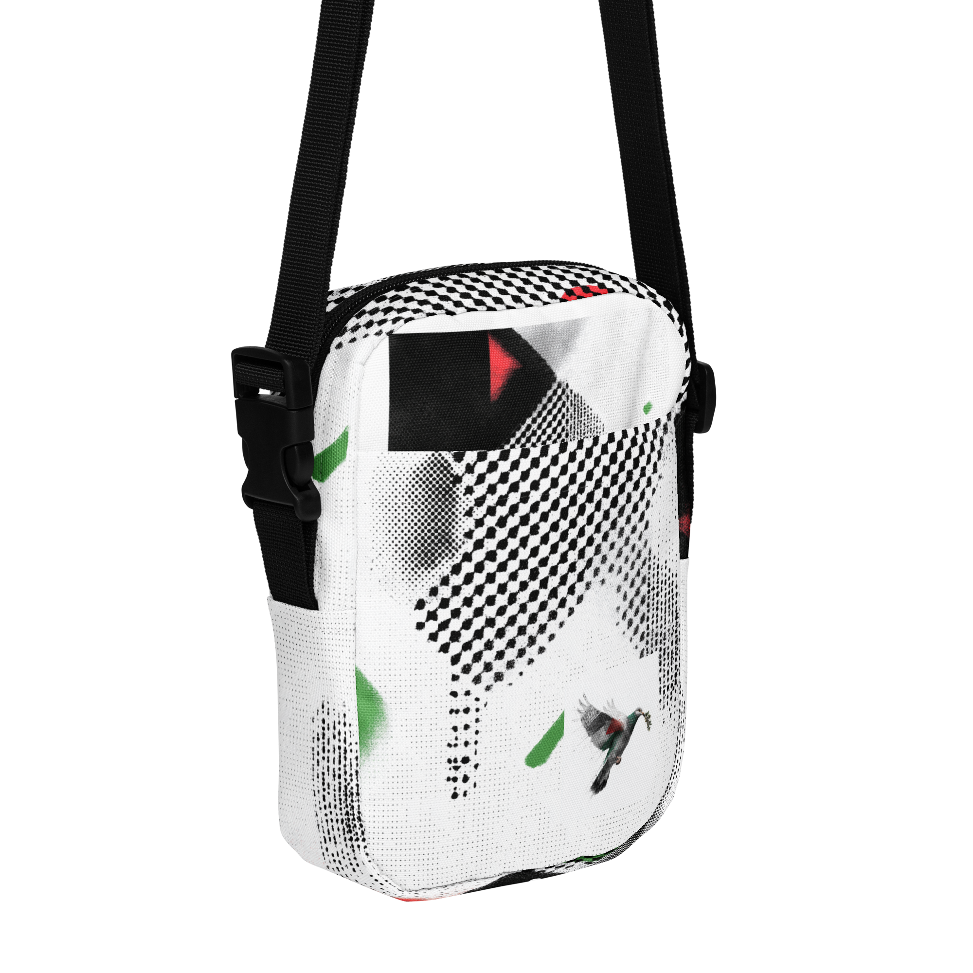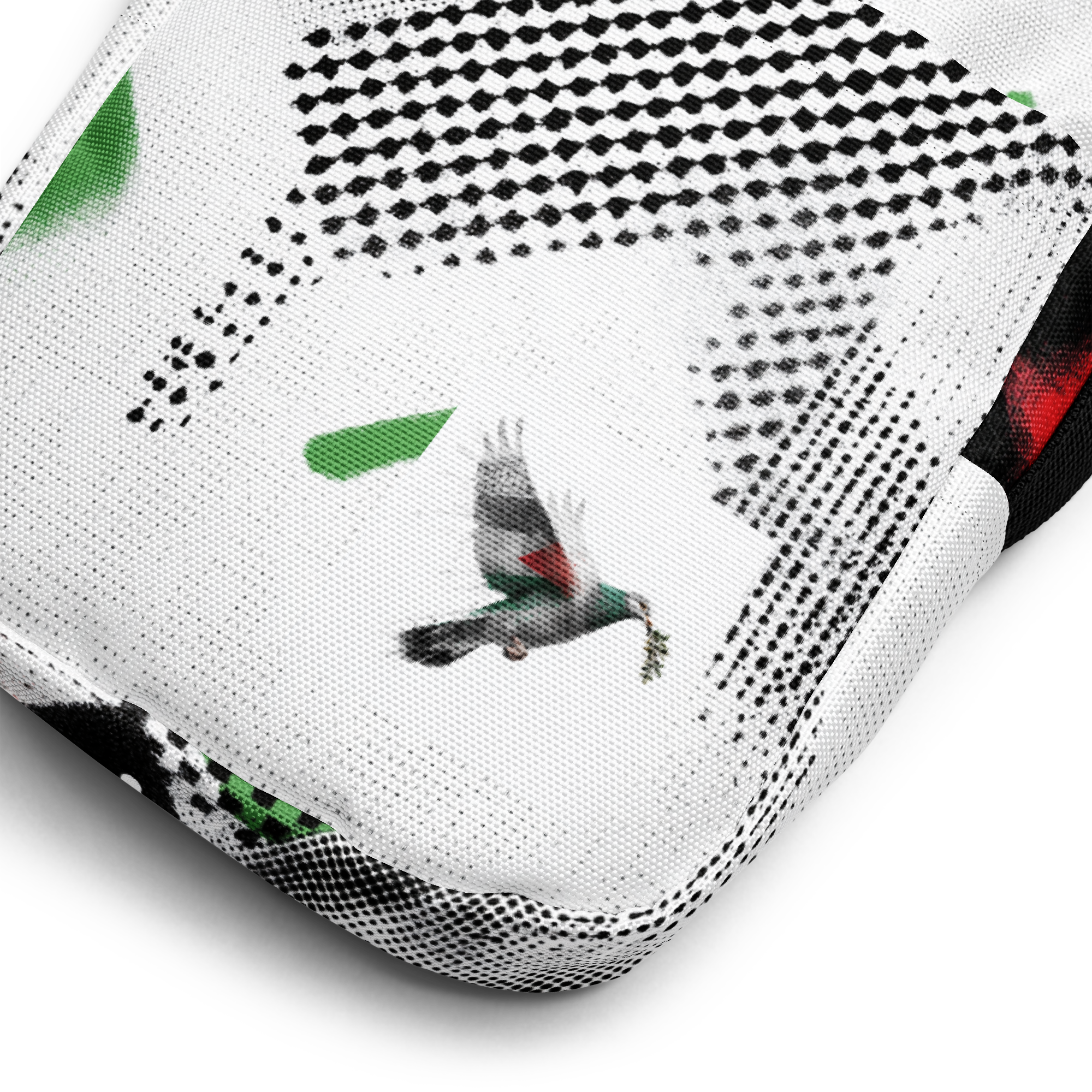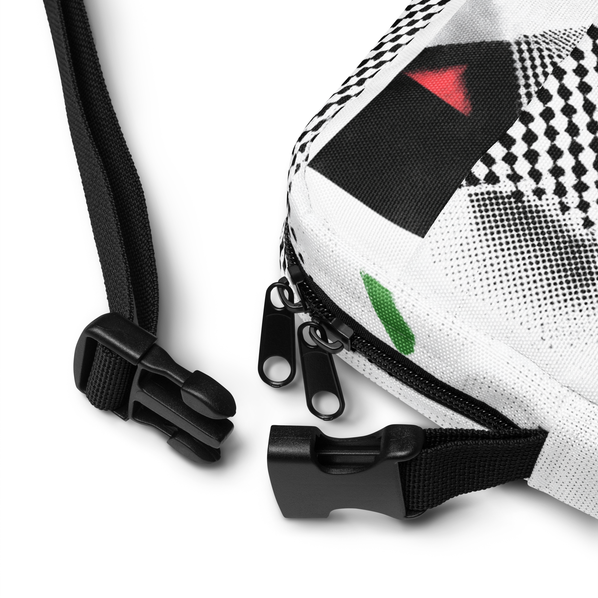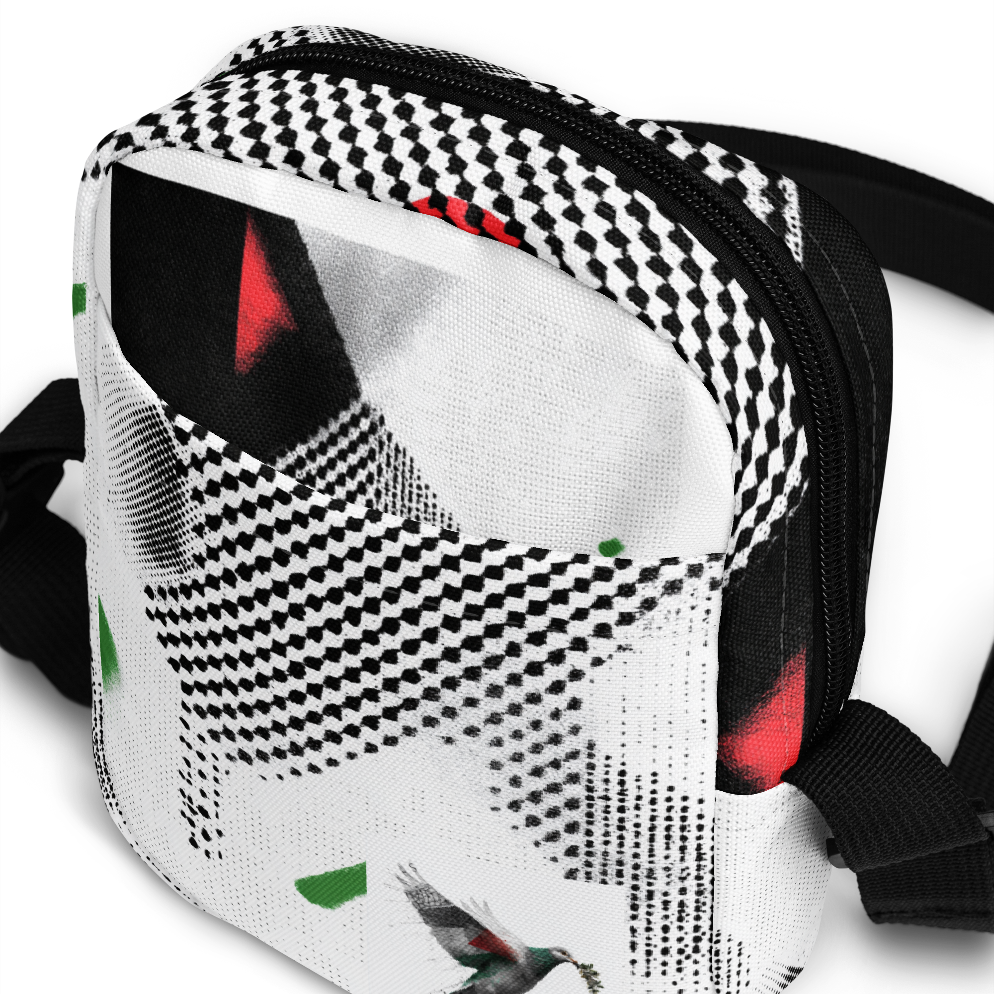 This rugged and fashionable utility crossbody bag is built to go wherever life takes you. Equipped with adjustable straps and two spacious pockets, it’s ideal for hiking, festivals, or everyday use. The design features a striking Palestinian keffiyeh pattern with geometric green and red accents, centered around the classic black and white fishnet design and detailed with traditional tatreez embroidery. The minimalist palette of black, white, green, and red offers a crisp, high-contrast appearance in a vector art style perfect for screen printing, with a dove positioned at the bottom right.